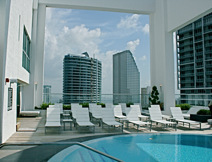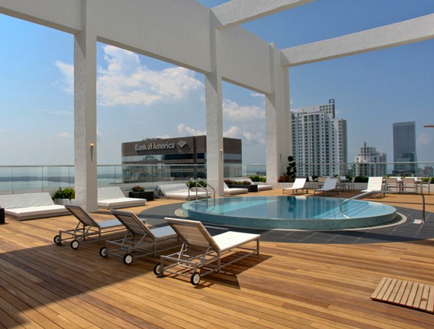 * бассейн с подогревом и террасу для загара с видами на залив Бискейн и Даунтаун Майами с высоты 42-го этажа