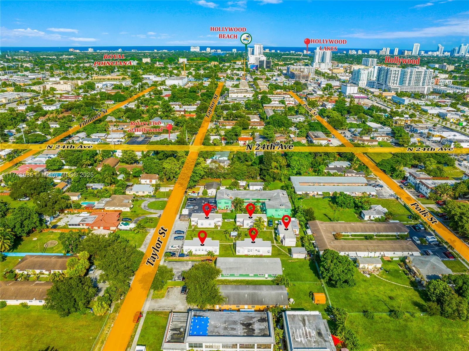 We are proud to present 2432 Taylor St, a well-positioned multi-family asset just minutes from Young Circle, Hollywood Beach, restaurants and I-95. This 10-unit property consists of five buildings, featuring (1) 2-bedroom unit and (9) 1-bedroom units, all fully occupied with assigned parking and a spacious central garden/seating area. With current rents 25% below market, there's significant upside potential—bringing rents to market rates would push NOI above $166K, achieving a 7%+ cap rate. Sitting on a massive 22,500 SF lot, the property also offers prime redevelopment potential, comfortably accommodating up to 37 units in one of Hollywood’s fastest-growing areas.