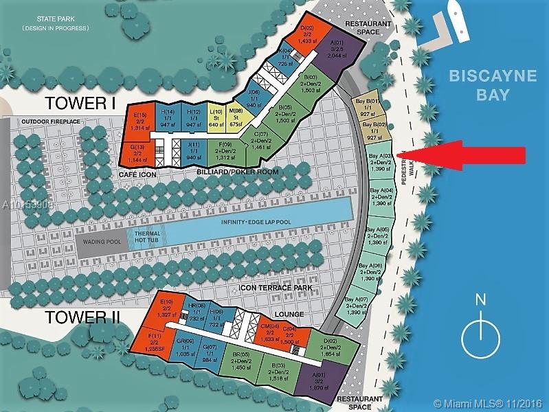 The Luxury Bay Liner unit is 2/2 + Den. Stunning views, the most amazing amenities, a world class spa, 2 5star restaurants, big gym. Despite the fact that the Icon is so big, you are in an exclusive area. Very Private so if you have a client that does not want to be seen, this unit is perfect, from the parking lot to his apt is only a few steps away, no elevators no big hallways, only 7 units in his hallway. There is also right now the opportunity of buying 1018 and 1019 and making a big unit.