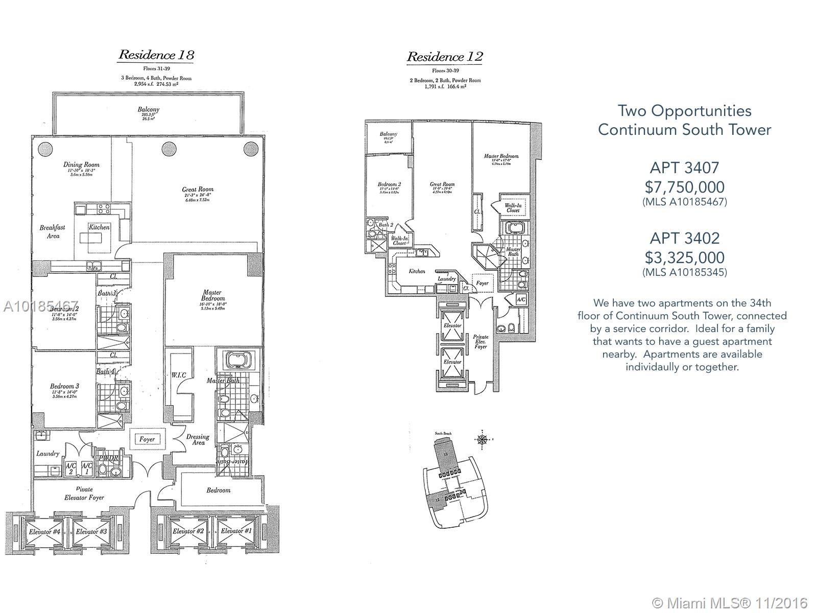 A fully renovated, high-floor, oceanfront apartment at The Continuum in South Beach. Newly redesigned. All new Miele appliances. This apartment is something truly amazing. Its great views will amaze you. And, its location is one of the best in Miami Beach. Option to also buy a private two-bedroom guest apartment on same floor with quick access (Apt 3402 - Miami MLS A10185345).