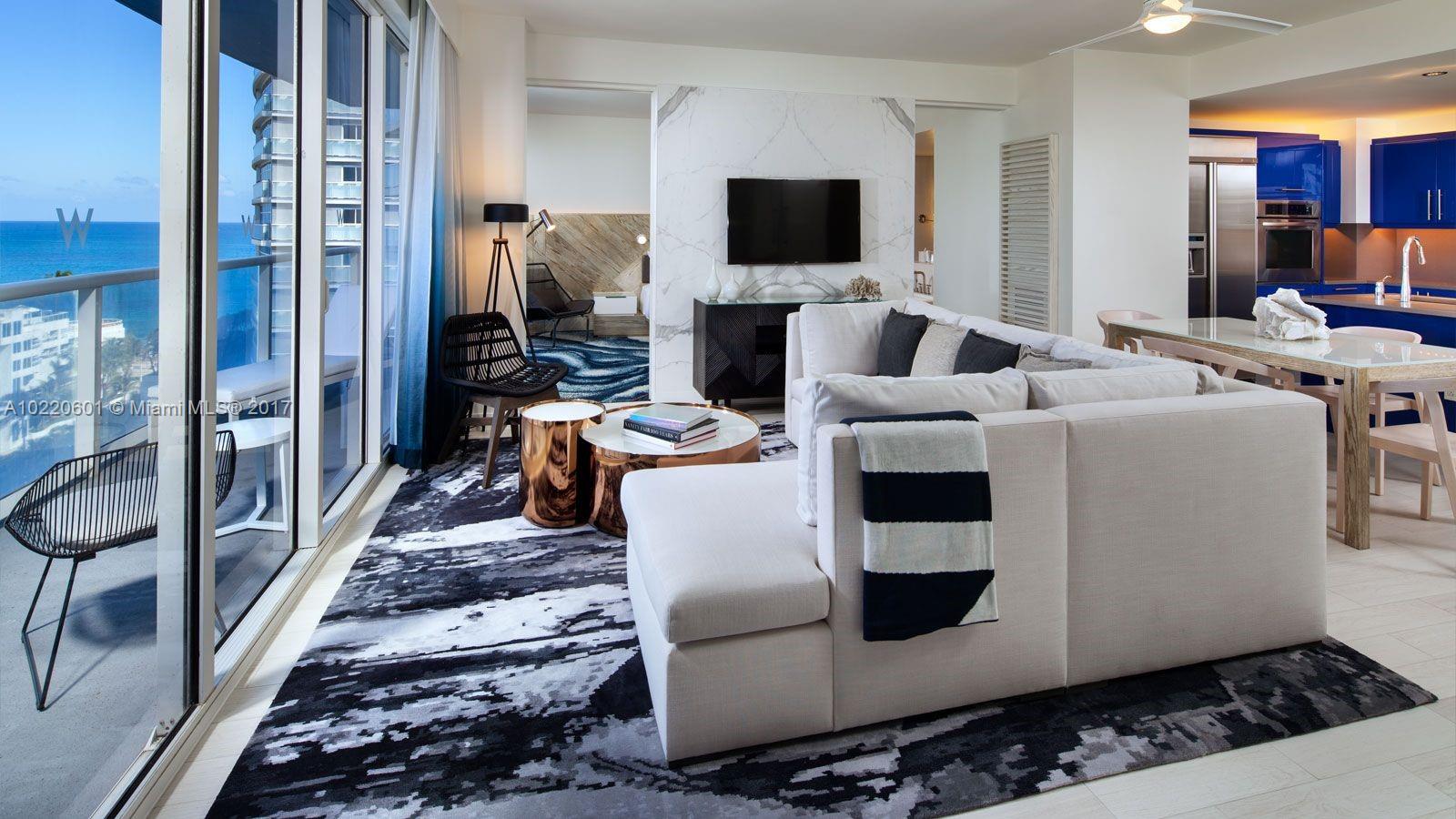 Fully furnished oceanfront residence designed by New York-based design duo Meyer Davis. 9-foot floor-to-ceiling windows and spacious balconies offer breathtaking ocean, intracoastal and city views. Expansive open floor plan features full-size kitchen, Italian-designed cabinetry, top-of-the-line appliances, wood plank porcelain tile and azure ocean-themed carpet. Exclusive access to resort-style amenities and W’s signature WHATEVER/WHENEVER concierge service will have you living the luxury lifestyle 24/7