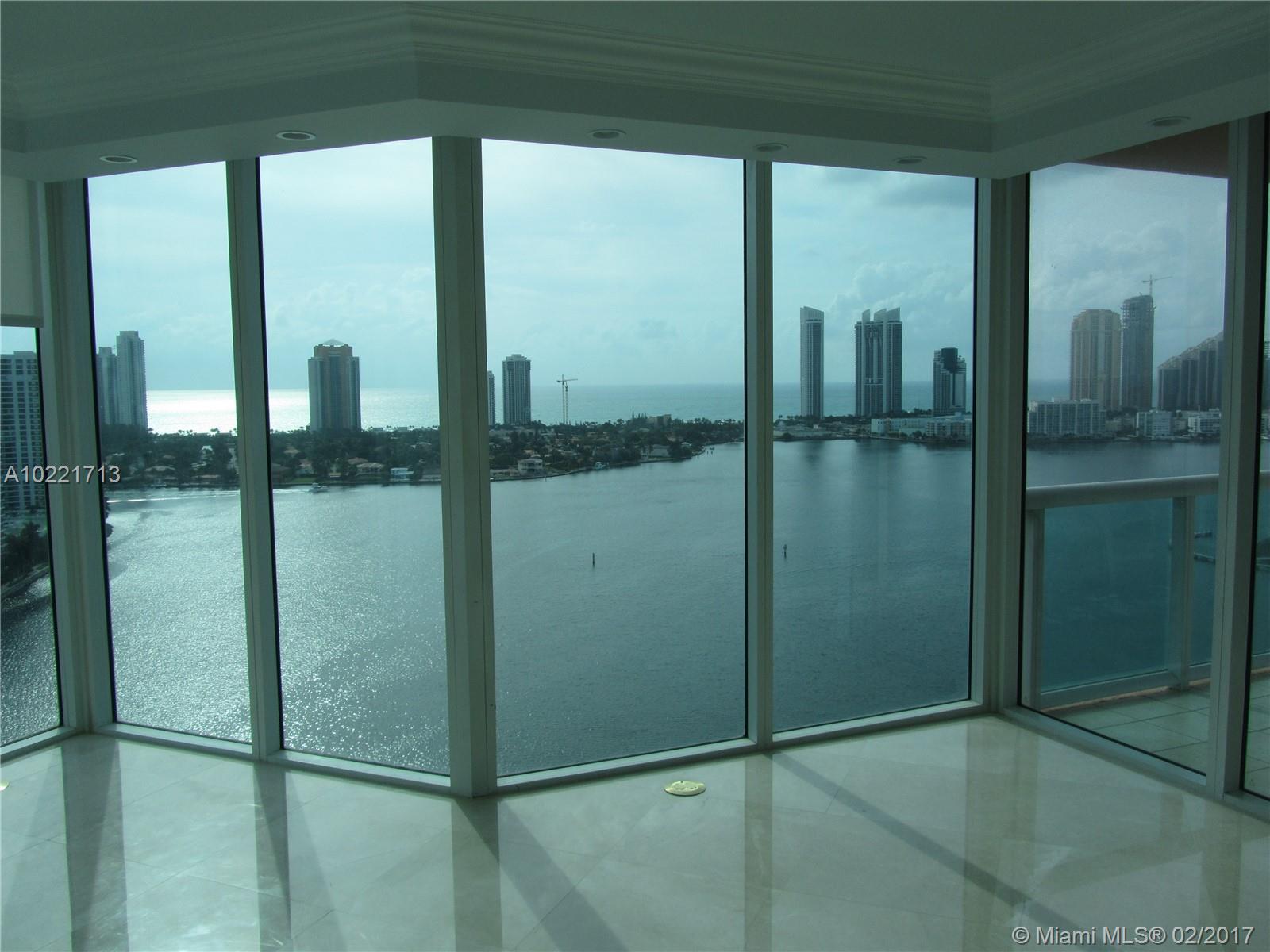 TENANT OCCUPIED. Gorgeous unit in Aventura, completely renovated for your pickiest client. Spacious 3 bedrooms, 3.5 baths, open floorplan. Spectacular, unobstructed south, east views, the best Aventura can offer: intercoastal, ocean, city, downtown Miami. This is a flow- through unit with marble floors, crown molding and floor to ceiling windows with electric blackouts. Top of the line finishes, granite countertops, gourmet kitchen with a separate dining area. Custom built cherry wood closets.