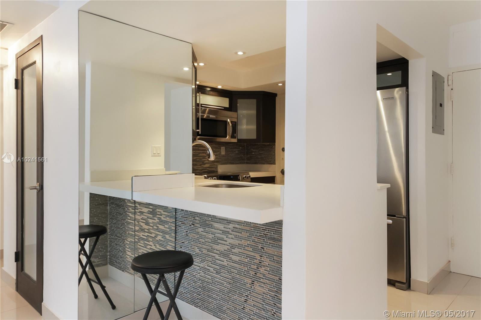 Completely renovated 1br unit at Mirador North. Open kitchen with stainless appliances, polished tile floors, modern bath with glass and high end fixtures, built in custom closets and many more upgrades throughout. Full service building with valet parking, pool, bbq area, gym and on site market. Great West Ave location with Whole Foods, restaurants, cafes and Flamingo Park just a block away. And Lincoln Rd, theaters all a short walk away. Don't miss this one! * See Broker's remarks.*