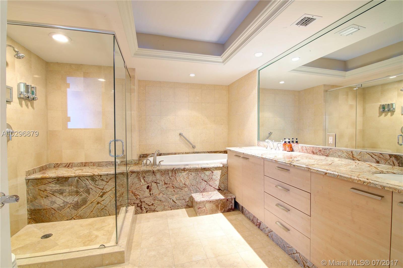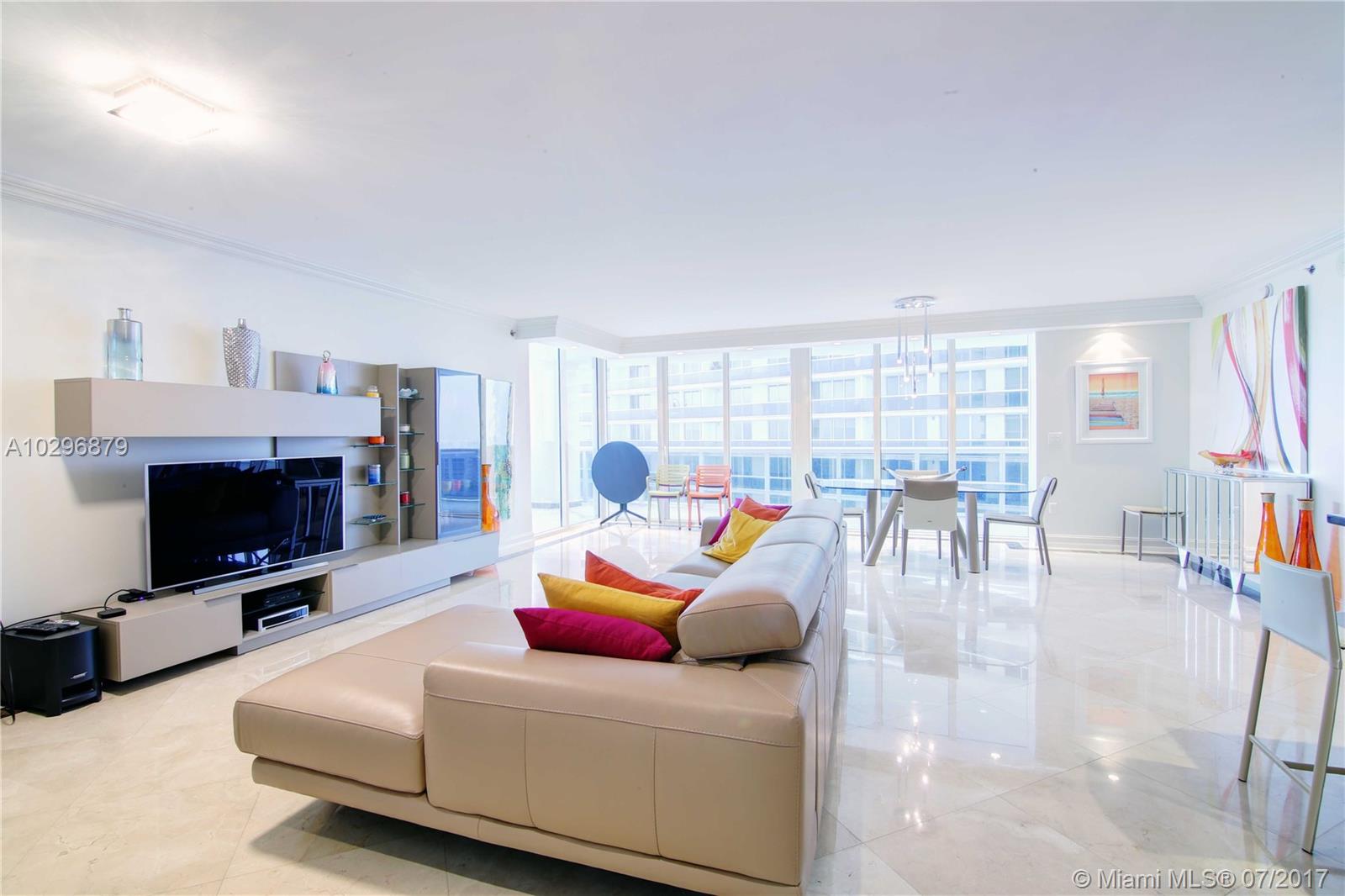 Enjoy resort- style living in this spacious 2 beds/ 2 baths waterfront condo with private beach access. Marble flooring throughout. Oversized master walk-in closet. Convenient motorized roller shades! Beautiful modern open-style kitchen with stainless steel appliances. Laundry room. Wraparound balcony plus a second private balcony in master bedroom. Building features amazing amenities including: gym with direct ocean views, spa, hot tubs, pools, bar, towel/beach chair service, and much more! Sale includes 1 parking space plus 1 valet parking and 2 large storage lockers.