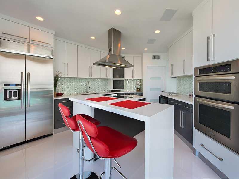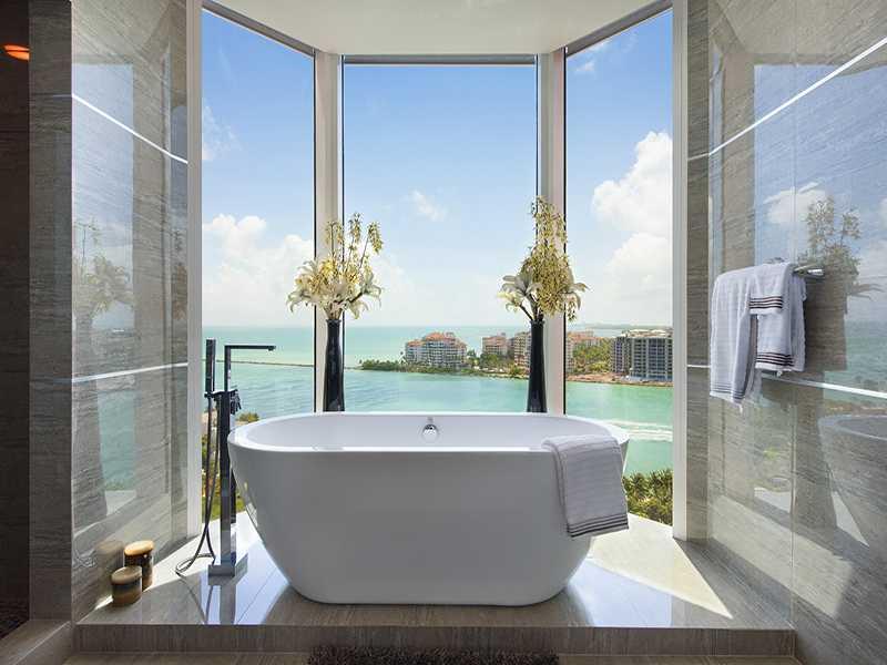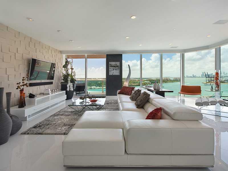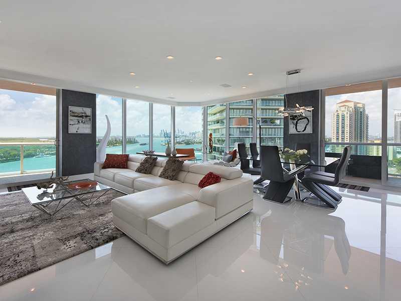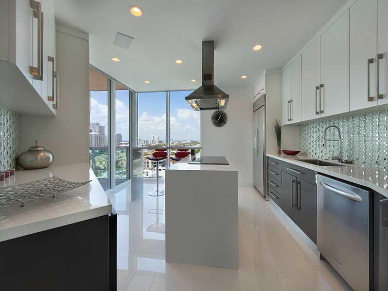 Wow-What a showpiece! This stunning 3 bedroom has been beautifully designed and renovated to perfection, every inch of it. Large glass tiles, wonderful wall treatments, great fixtures and lighting, new doors, custom closets, electric window treatments, smart home iPad control, sound system. The kitchen and baths are gorgeous. Incredible views of the Intracoastal, the city, the ocean and Miami Beach. Large Sunrise and Sunset Terraces. Two parking spots. Don't miss this opportunity!