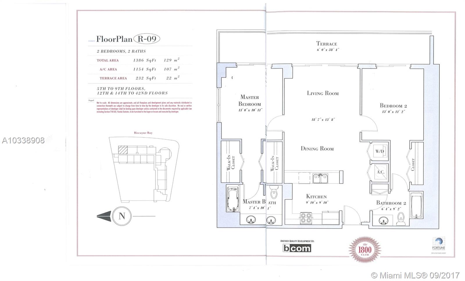 Direct 180 degree water views with the Port of Miami to the south & over to Miami Beach + islands from this end unit condo in 1800 Club. Split 2-bedroom floor plan with designer kitchen with breakfast counter, washer/dryer, spacious closets, dual sinks, whirlpool tub and an expansive open balcony that spans the entire width of the condo. The 1800 Club was built in 2007/2008 and offers 24/7 concierge and security, resort-style pool, business center, state-of-the-art gym, clubhouse, valet parking, and more.