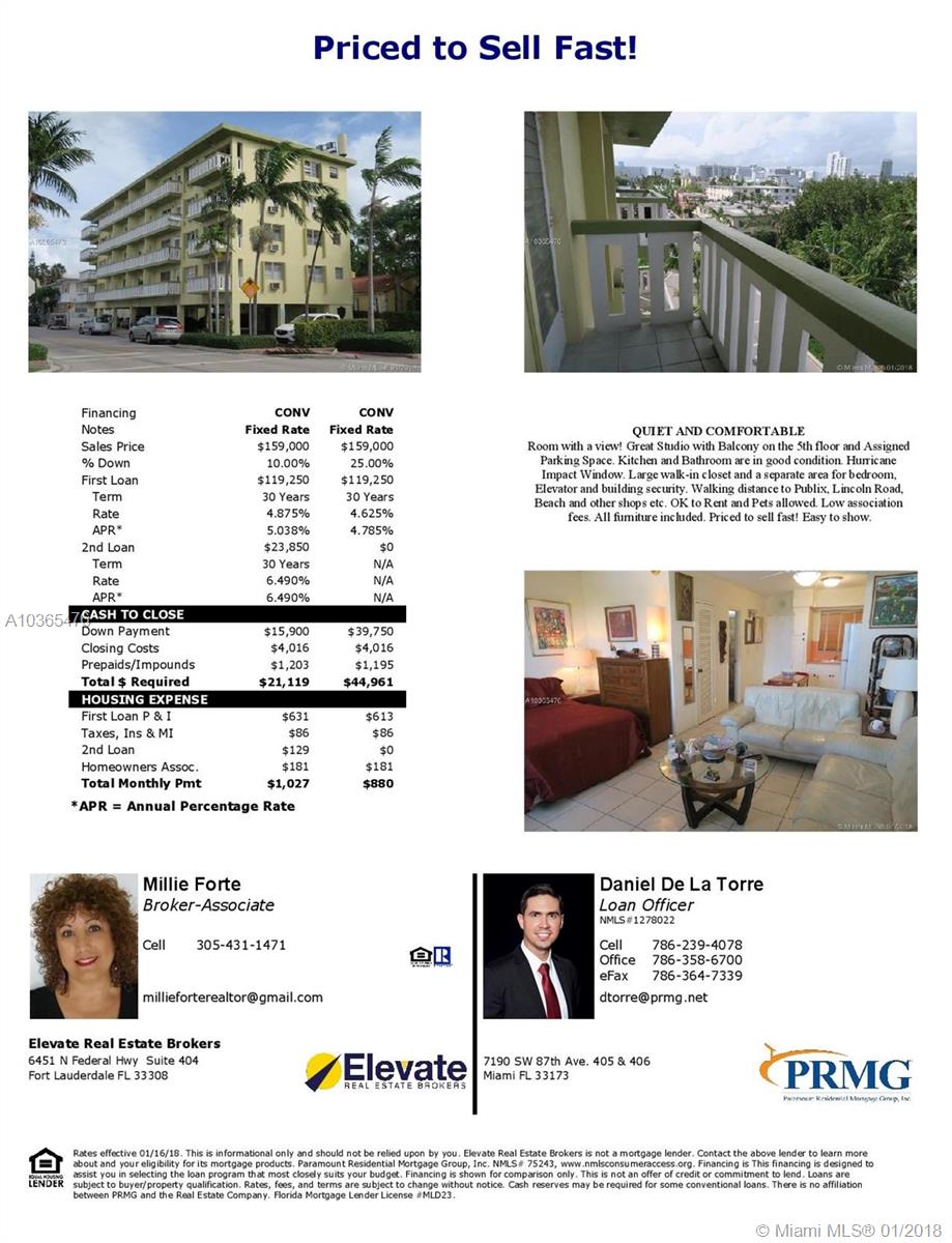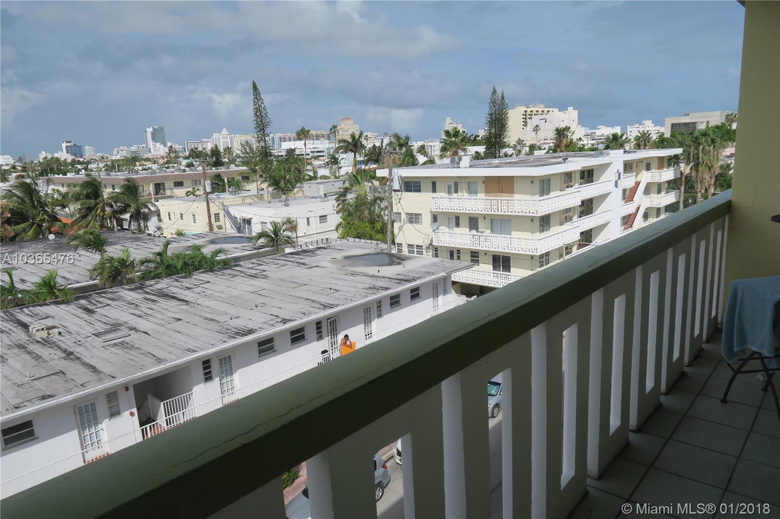Room with a view! Great Studio with Balcony on the 5th floor and Assigned Parking Space. Kitchen and Bathroom are in good condition. Hurricane Impact Window. Large walk-in closet and a separate area for bedroom, Elevator and building security. Walking distance to Publix, Lincoln Road, Beach and other shops etc. OK to Rent and Pets allowed. Low association fees. Furniture optional, with or without. Priced to sell fast! Easy to show.
