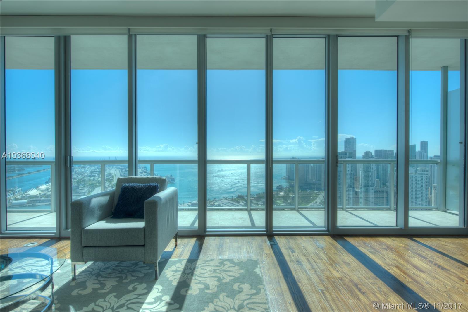 Own one of the Best Views in Miami!!! An incredibly spacious 2 Bed + Den/ 2.5 Bath condo at Marinablue with 1,748 interior square feet, 10-foot high ceilings with floor-to-ceiling windows, 223 square foot balcony spanning the entire width of the unit, stainless steel appliances, wood floors in the living areas, marble floors in the bathrooms, washer/dryer, and breathtaking views of the bay, city, and ocean from the 54th floor. Walk-in closet in both bedrooms. The largest non-penthouse unit in entire building. One-of-a-kind floor plan! Includes 1 assigned parking space located on 4th floor + storage cage. Building amenities include: sunrise & sunset pools, hot tub, fitness center, business center, sand volleyball court, BBQ, 24-hr concierge, 24-hr valet parking, bike storage, and club room.
