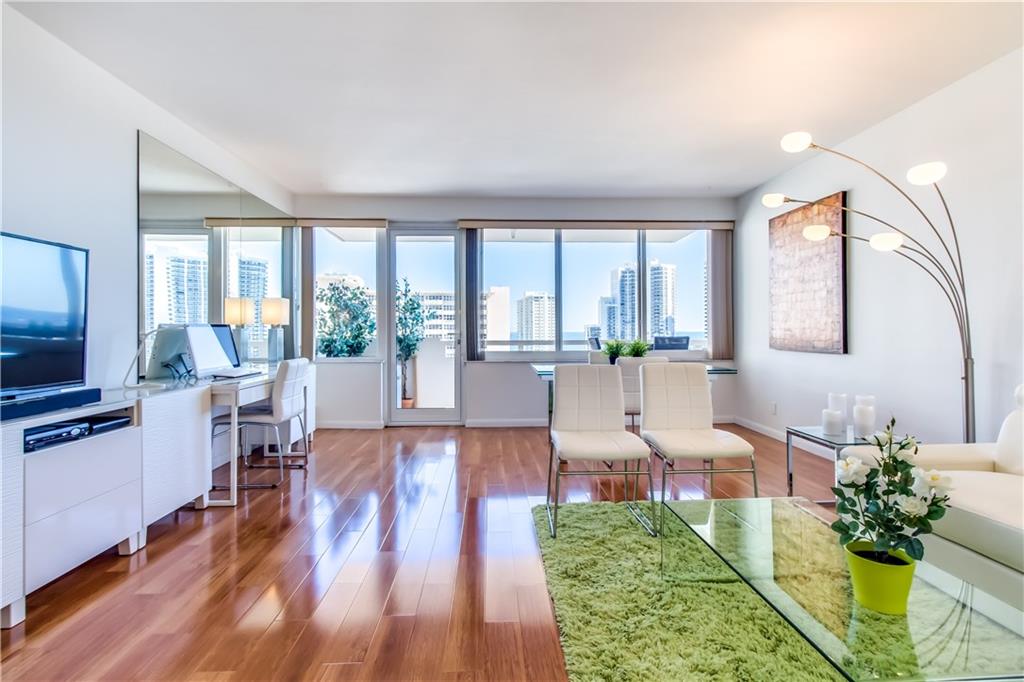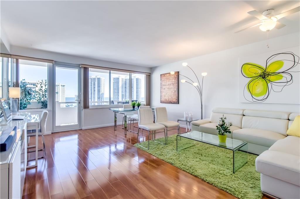 Spectacular 14th floor apartment w/ wall to wall windows and stunning views of the ocean. This bright and contemporary home features beautiful floors throughout the living space. Updated kitchen w/ new appliances. Hurricane impact windows and door. Relax on your private balcony overlooking the ocean and passing cruise ships. Walk to the beach or relax at the huge heated pool directly on the Intracoastal Waterway and enjoy the boat parade. Association states 55 plus/No Pets/No Rentals.