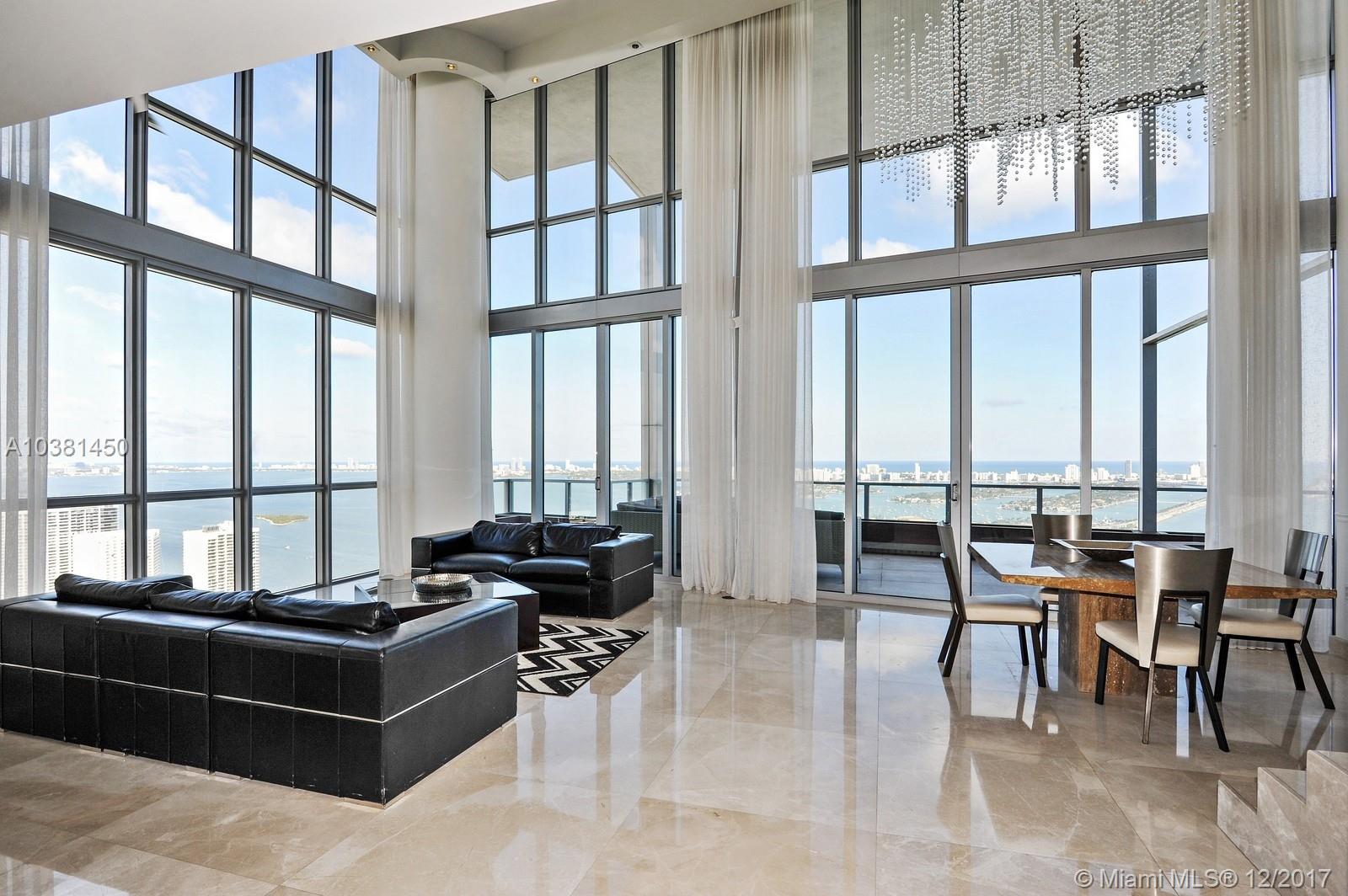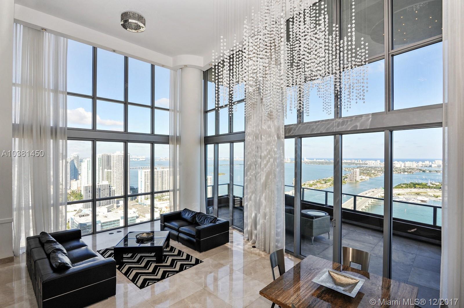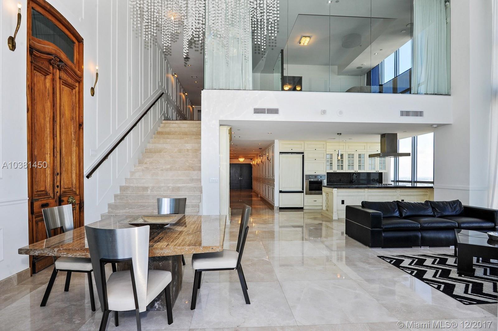 This spectacular 5,475 square foot two-story custom combined high-floor residence offers triple exposure with spectacular views and light through floor to ceiling windows. Exceptional interior features include marble and wood floors throughout, private foyer, soaring 20 foot ceilings, den/game room, full service wet bar. Open kitchen equipped with appliances by Viking and Sub-Zero. Large terrace ideal for indoor/outdoor entertaining. Assigned parking (4). Enjoy unobstructed views of the Miami Skyline.