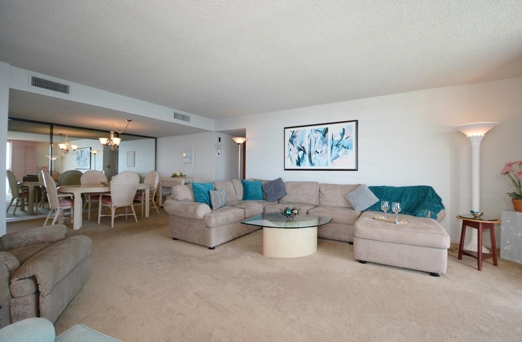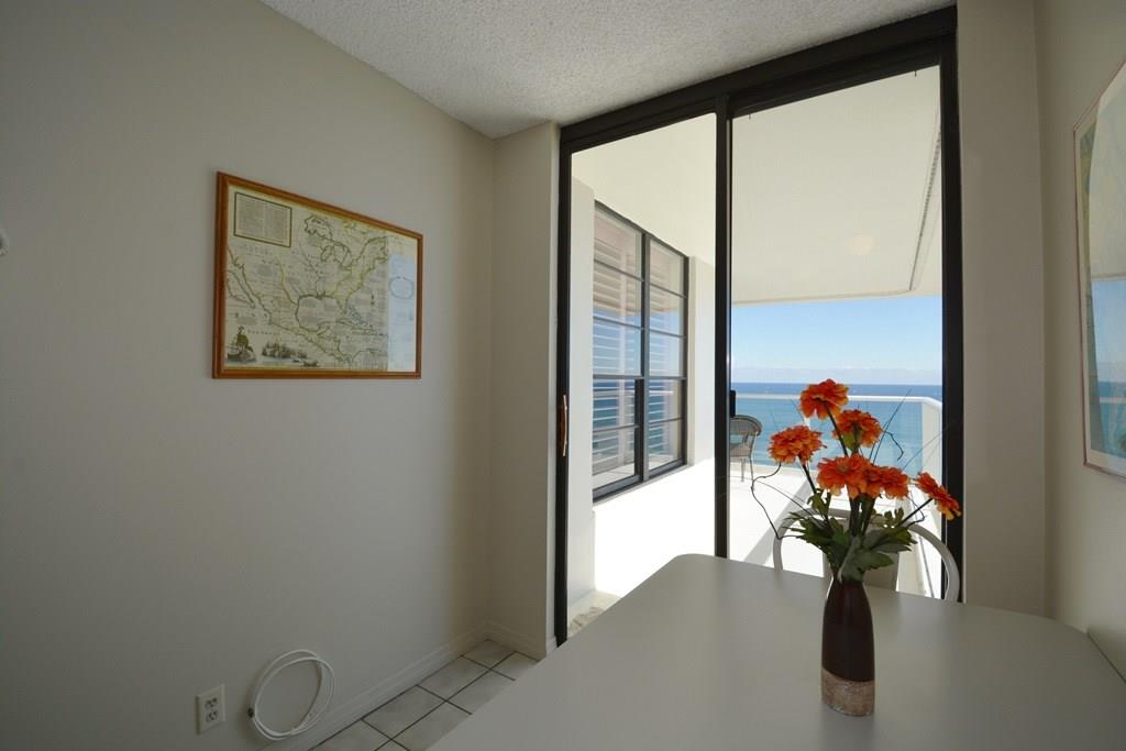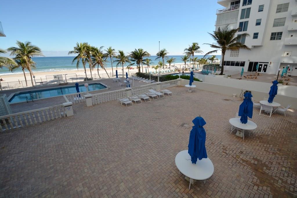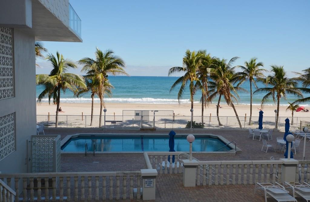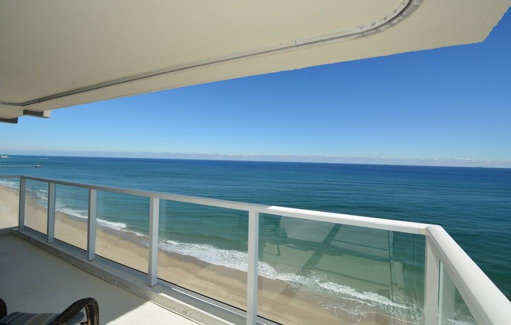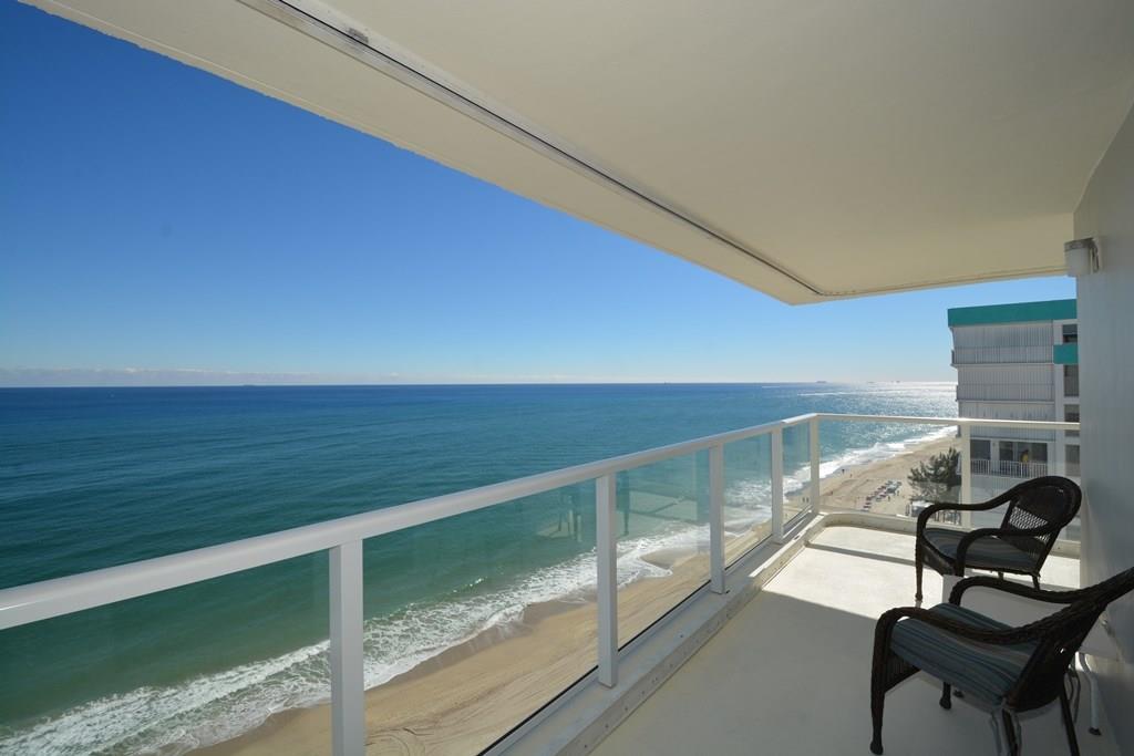 Rarely available! Spectacular direct ocean and intracoastal views from SE corner apt with huge wrap around glass balcony! Spacious apartment is 1500 sq ft plus 230 for balcony! Foyer entry, split bedroom plan, and eat-in kitchen! Tons of closet space. Two storage areas on same floor. PLUS Beach locker located off pool area. Popular oceanfront bldg w/huge party rm, garage park, 24 hr security, exercise rm & more! BBQ and tropical pool area on the beach! Walk to Pompano Pier revitalized beach area!
