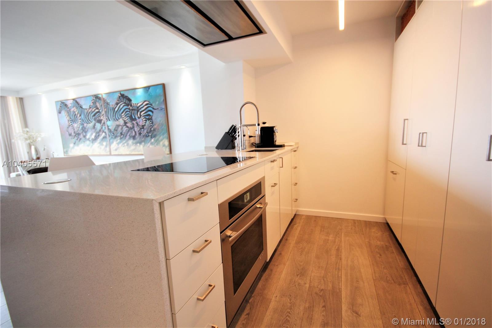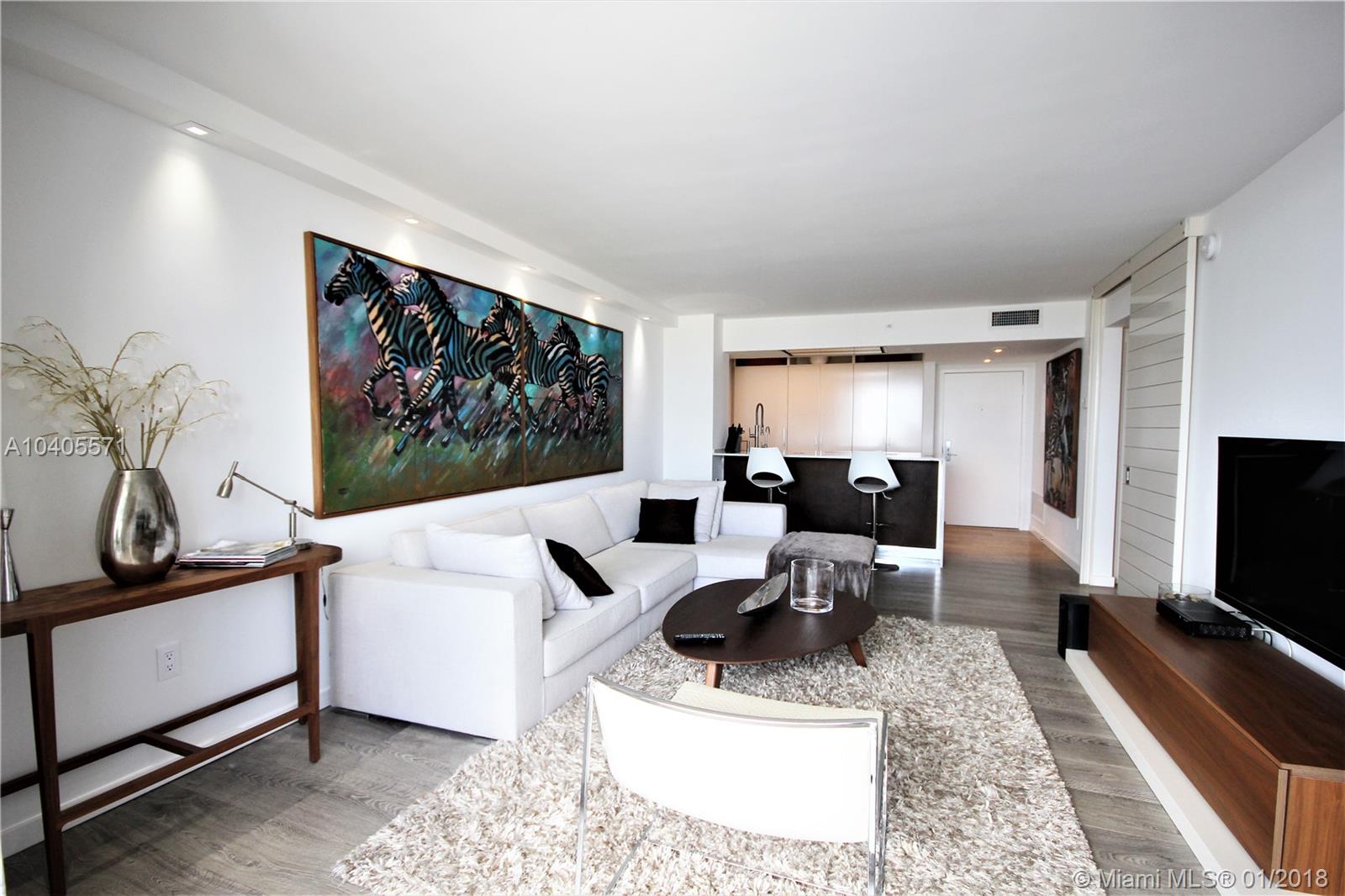 Recently remodeled to high-end quality perfection in impeccable condition with an awesome South Beach view. Open, spacious & bright living area w/full glass wall to glass balcony, recessed LED lighting, wood fls, exposed contemporary kitchen w/large Quartz island, Italian fixtures, high gloss custom cabinetry w/concealed Thermodor refrig & Bosch dishwasher. Over-the-top Master suite featuring a lavish bath w/wall mounted toilet & bidet, Italian glass mosaic tiling, two solid cone pedestal sinks w/large beveled edged circular mirrors. The spacious bedroom area has recessed LED’s, double glass door to balcony, a large window, plus a built out all walnut walk-in closet. This bay front building in the fabulous & trendy Sunset Harbour neighborhood is an absolute Top Pick!