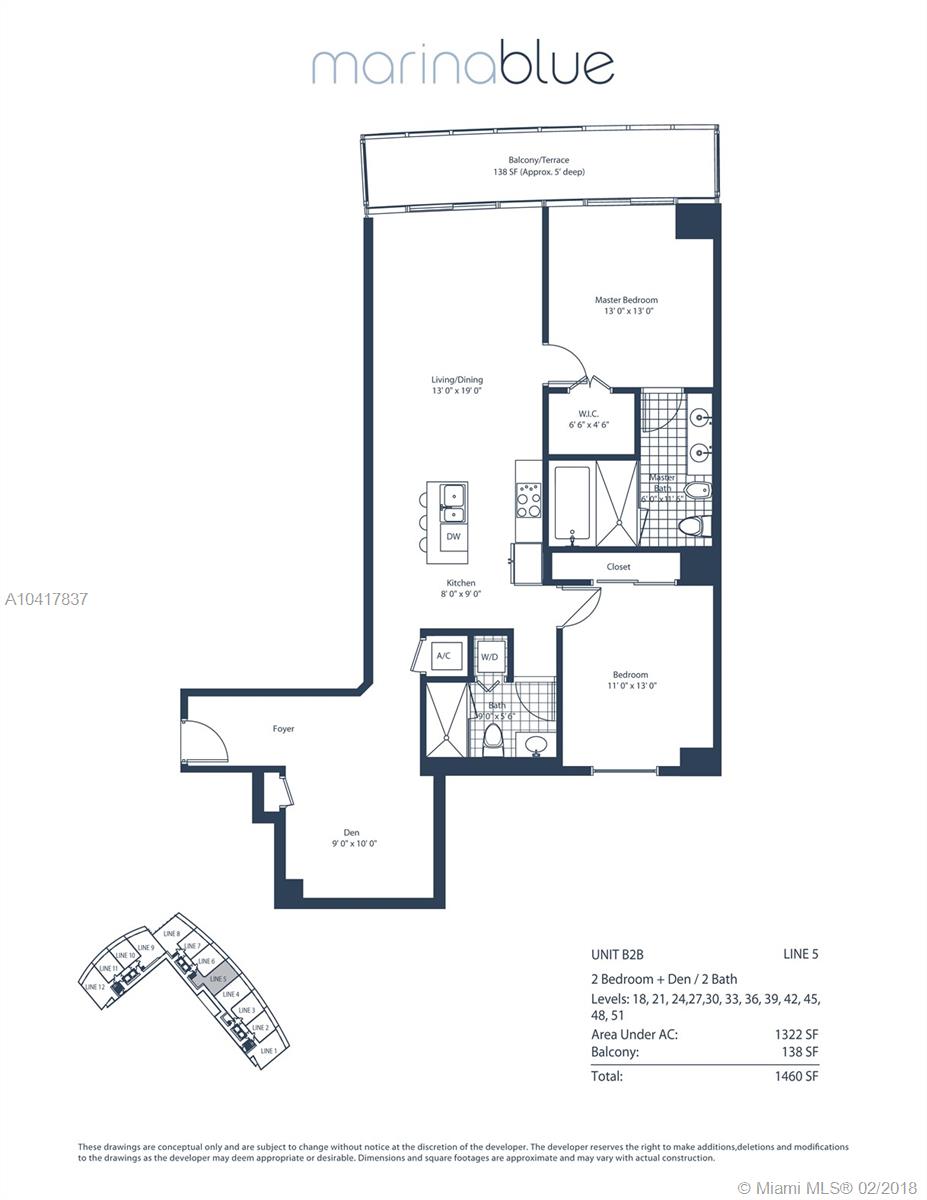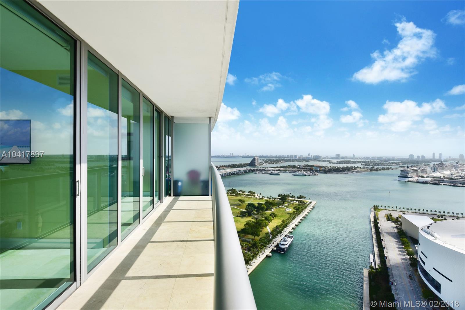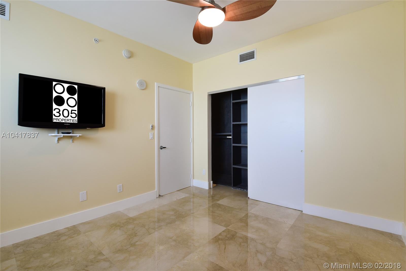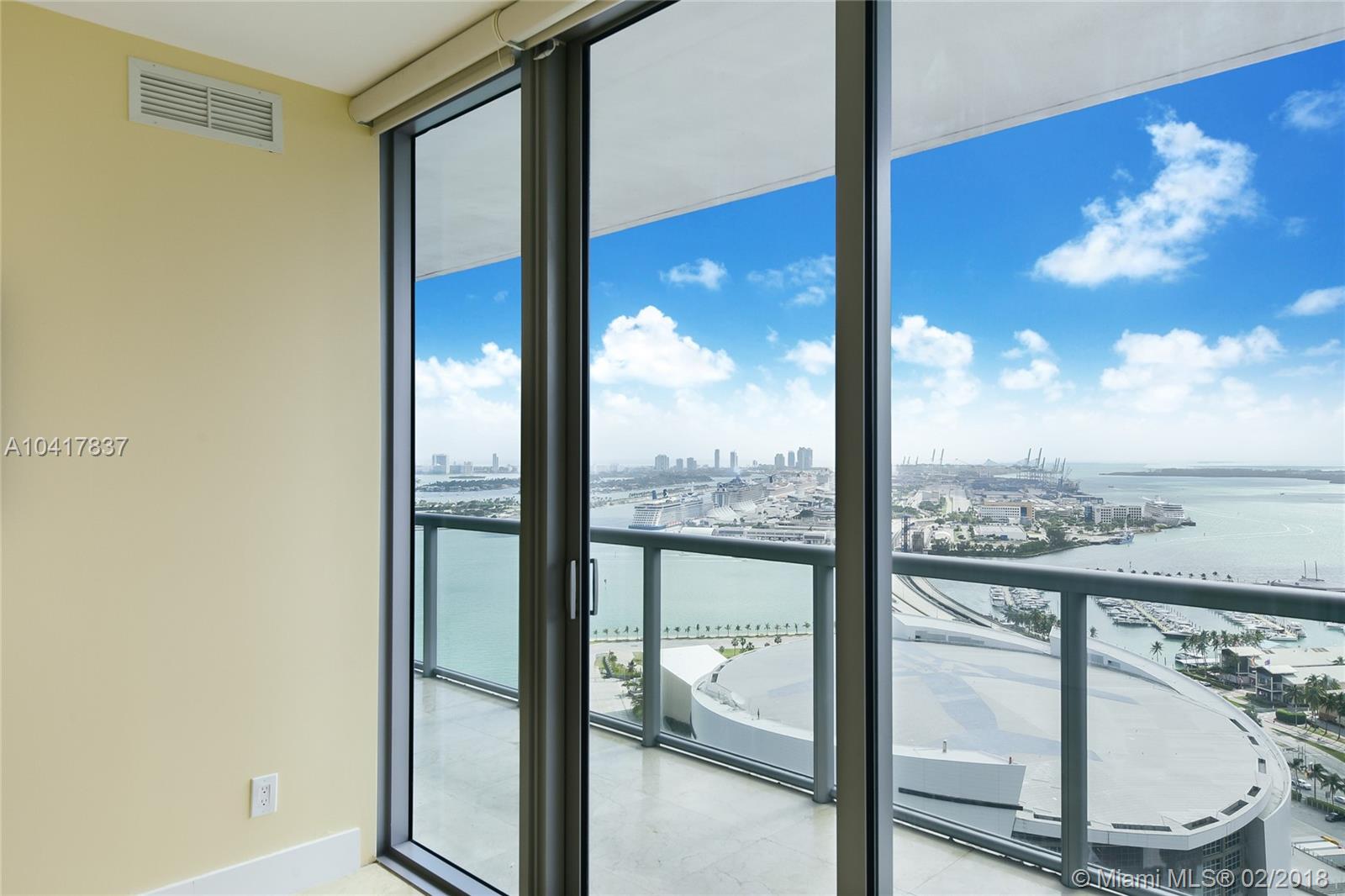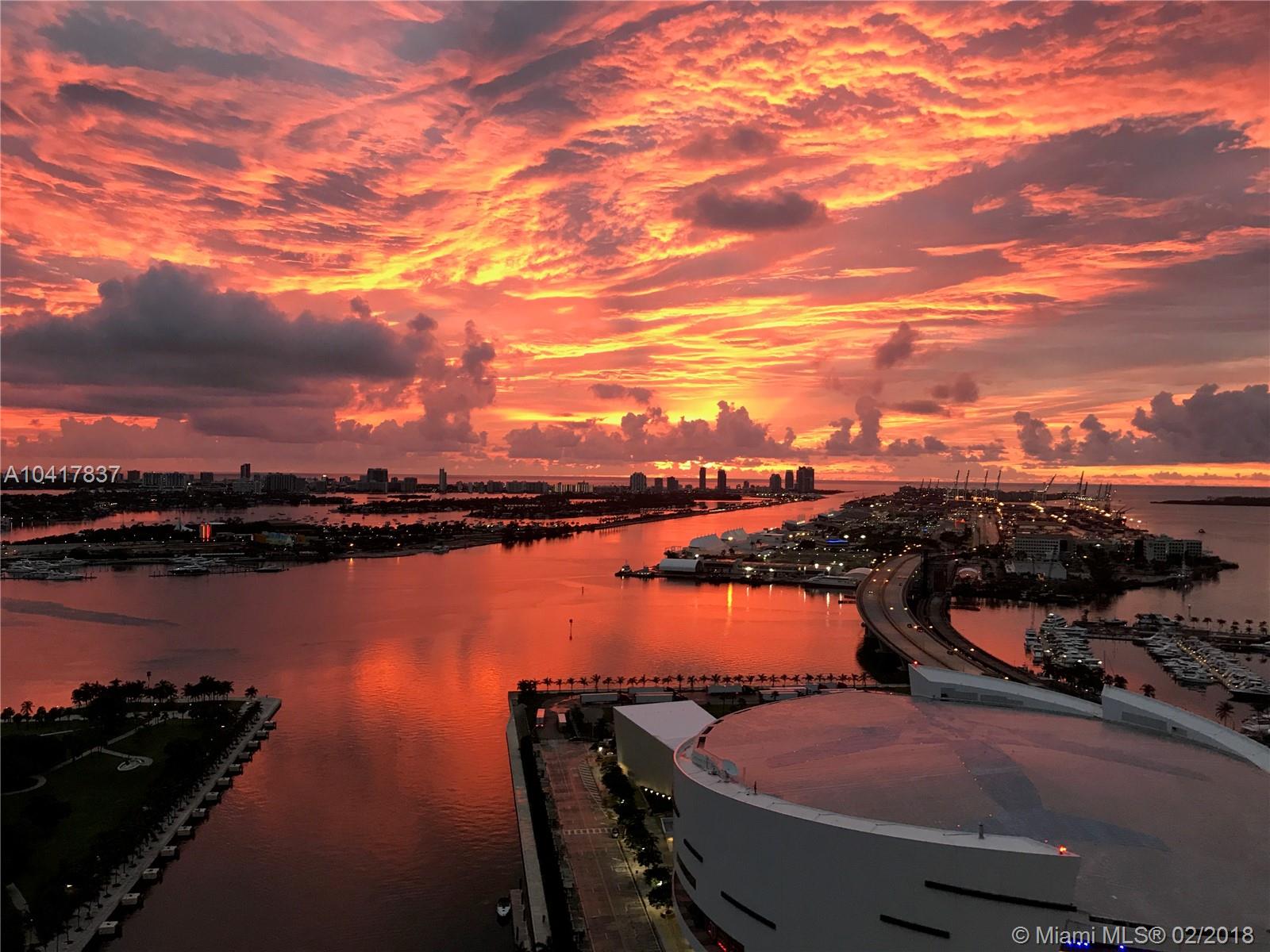 Spectacular 33rd floor 2 BED + DEN & 2 BATH residence featuring 2 PARKING SPACES, with panoramic views of Downtown Miami, Biscayne Bay & Miami Beach. Only 12 of these highly sought floor plans exist in the entire building and rarely with 2 assigned parking spaces costing Seller over $30,000.00. This ready to move-in sky residence includes a spacious den with custom sliding doors that can be used as a 3rd bedroom or office. Other elements include marble floors, custom closets, remote operated retractable shades in the master bedroom and flat screen TV's in the living room and bedrooms. MarinaBlue is an architecturally stunning 57-story tower with unparalleled luxury amenities located in the exclusive Park West neighborhood in Downtown Miami, just steps from the American Airlines Arena.