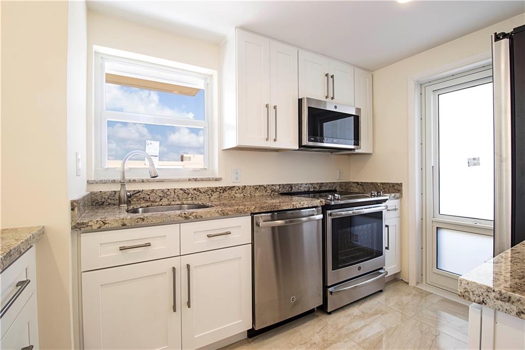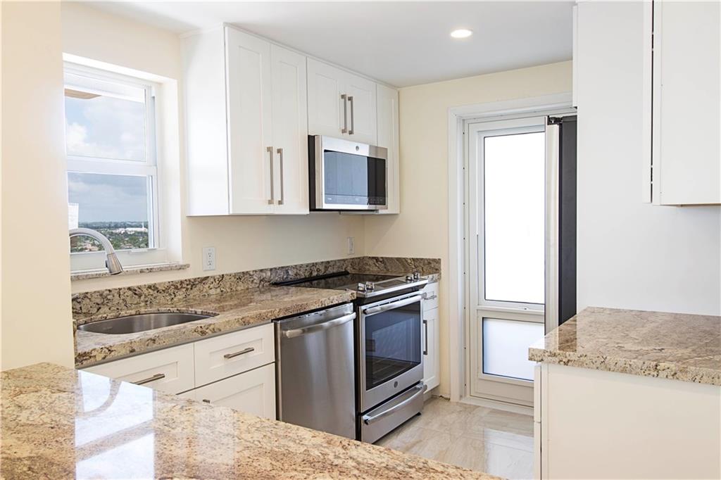Presenting commanding views of the Atlantic, Intracoastal and City. This Penthouse unit located in Tiffany Gardens North has been beautifully renovated. Eurotech impact doors reflect both privacy and maximum storm protection, 24" tile leads from entryway and flows into dining-living. An entirely upgraded kitchen boasts shaker cabinets, granite countertops and waterfall effect off the peninsula. All accented by new high end SS appliances and recessed lighting. Covered parking steps from building main entry