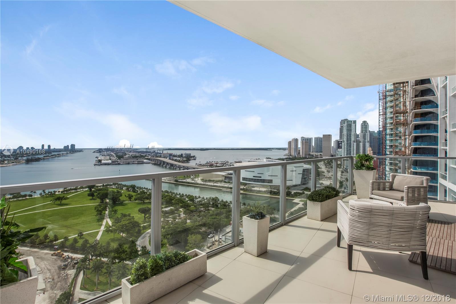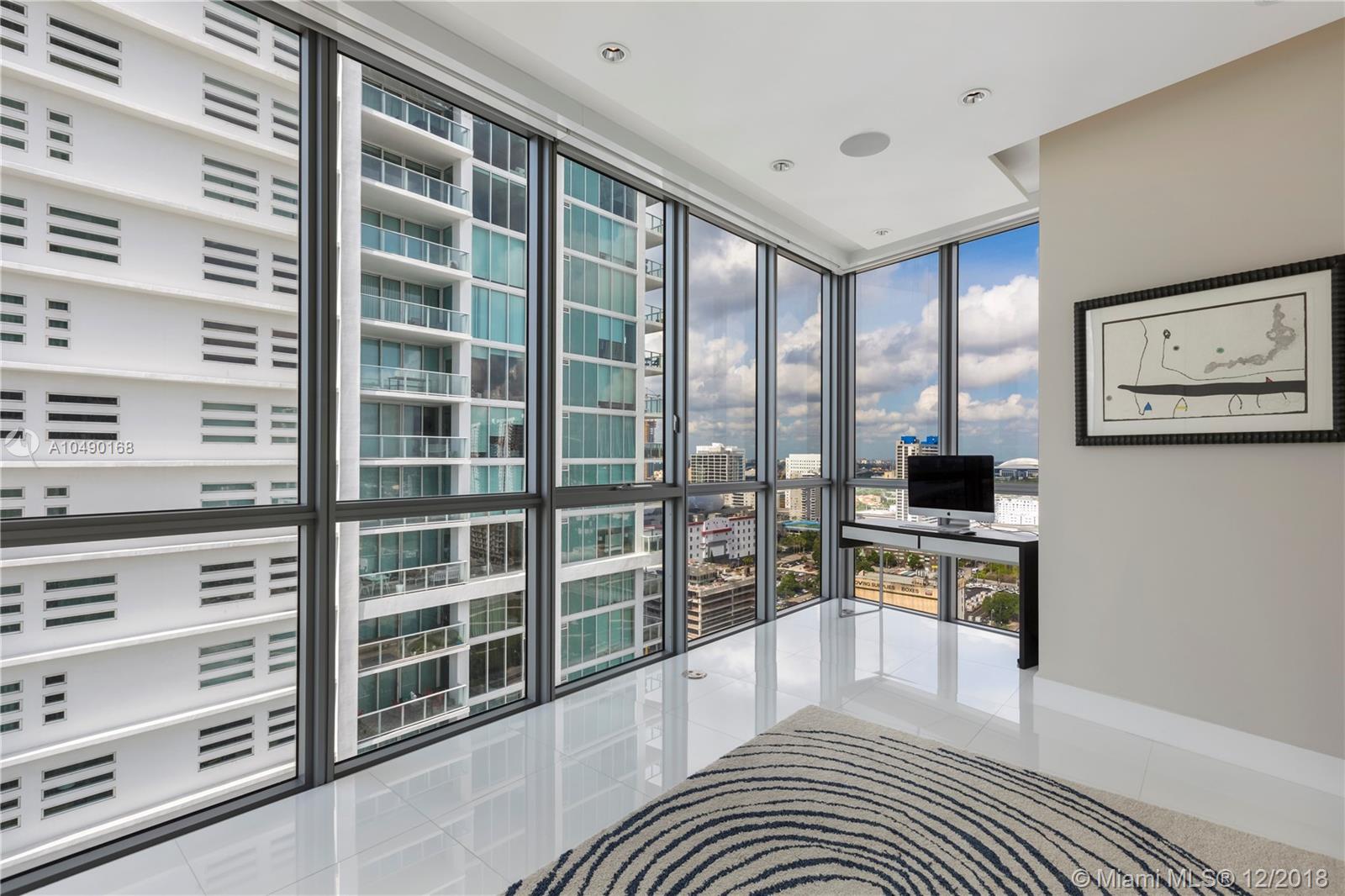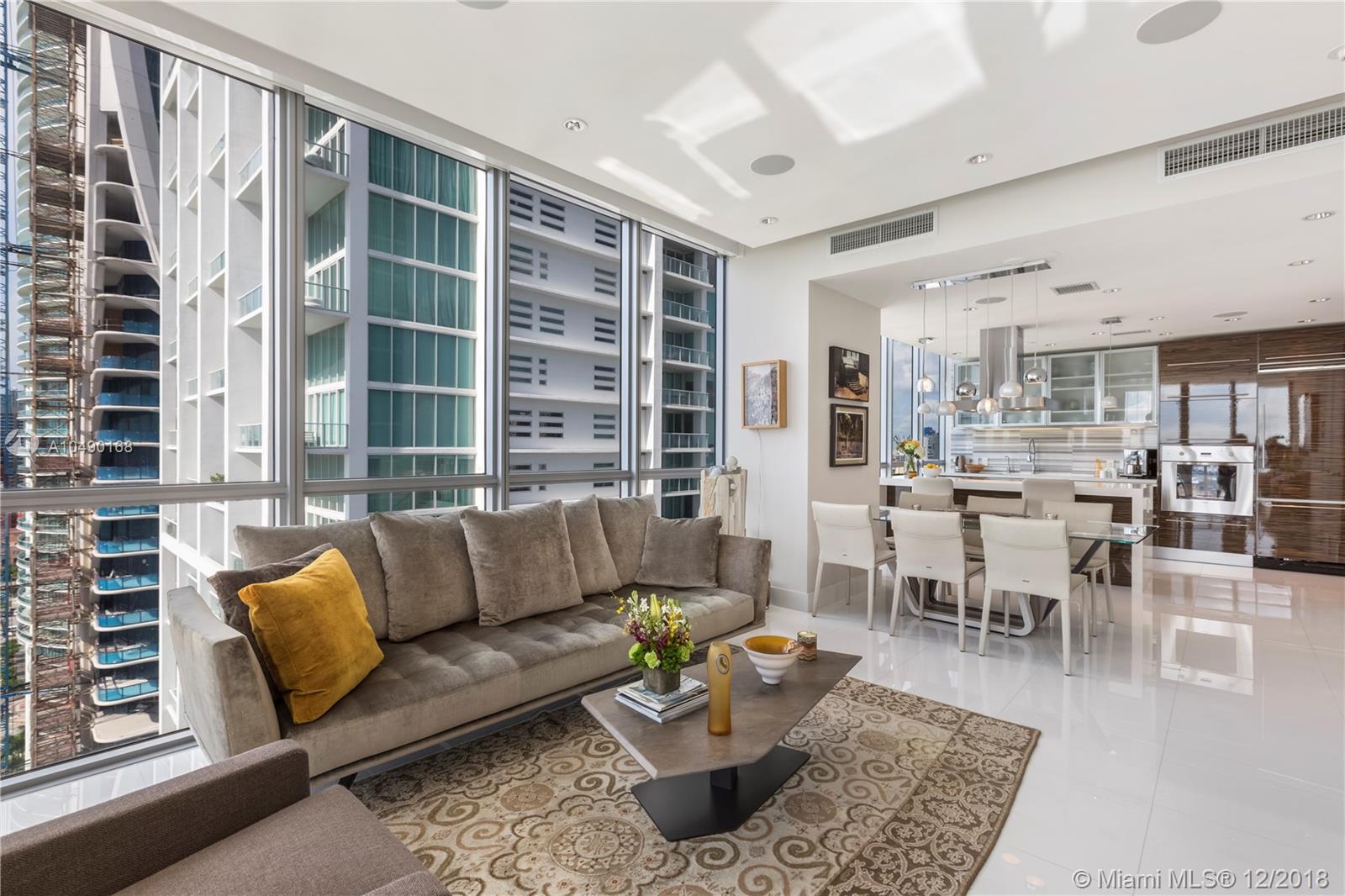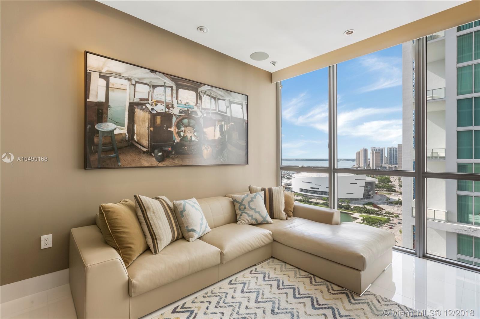 Best priced and custom designed 01 unit in the building with over $300,000 in upgrades. Stunning views of Downtown Miami, the Miami Beach skyline, and steps away from the American Airlines Arena and Perez Art Museum. Floor-to-ceiling windows with 10-foot ceilings. Custom finishes, including Cattelan Italia dining and kitchen lighting, custom venetian plaster, complete master-bath renovation featuring Aquabrass Spa shower (a $40,000 upgrade). Drop ceilings throughout with spot lights and LED soft lighting. Control 4 home automation system (shades, alarm, video, music, AC), in ceiling multi-channel audio in bedrooms and living room. Multiple digital touch control panels. Motorized shades with blackout shades in bedrooms. Infinity-edge sunrise swim spa. Brand new AC units.