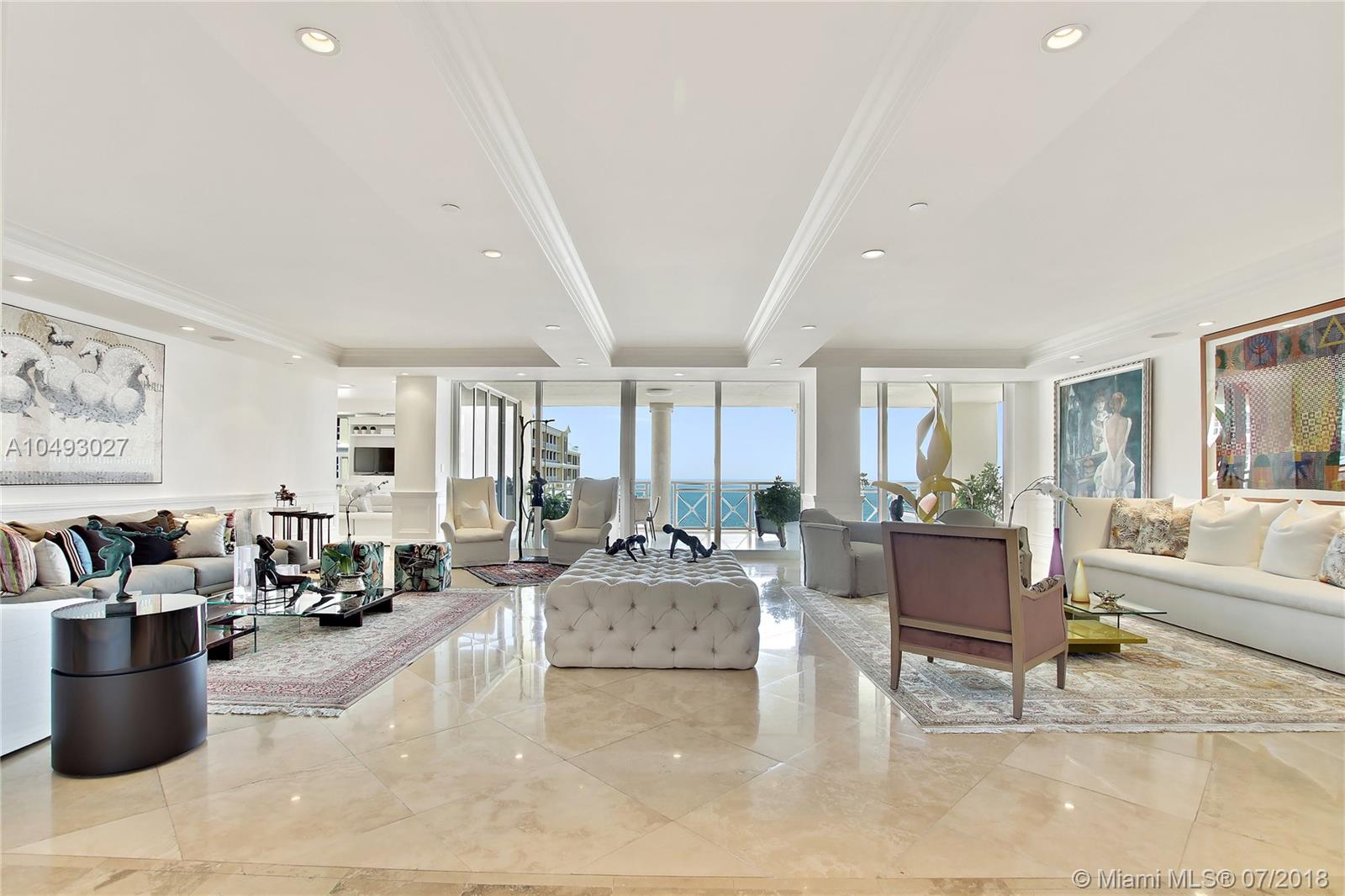 Presenting one of Grand Bay community’s largest luxury units with views of the Ocean and Bay. Just imagine 5634 int. SF, 5 bed, 4.5 baths, and beautiful terraces. A private elevator opens to the double size living room. An art lovers dream! Hector-Hector chef’s kitchen has center island breakfast bar, custom Chippendale cabinetry, top shelf appliances, three ovens and a wine fridge! Dinner can be served in the dining room next to the rustic Library, serving wine from the temperature controlled 1,100 bottle wine room. After a movie in the theater, retire to the Master suite with spacious walk-in closet, spa-like bath, for a soak in the tub. Draw the motorized shades, and enjoy the smart home entertainment system. Includes 2 parking spots, storage, and a 245 SF studio (1/1) on the 1st floor.