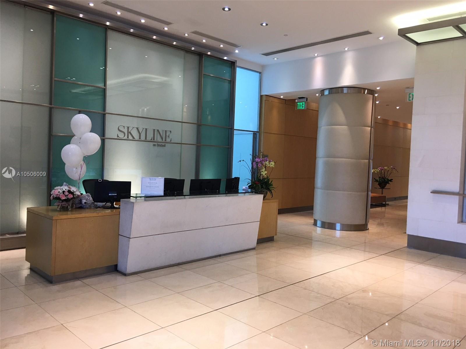 1/1 at Skyline Condo on Brickell Av, walk to everything!!! 5 min to I-95, sought after "10" line that features huge tiled balcony, large enough for over sized dining table and sitting area. Incredible water and city views. Impact windows. Large European tiled floors through out the apt. Open Kitchen w granite counter tops, all appliances included, central A/C, new SS fridge, washer/dryer inside the apartment, all window shades included. Building offers: Pool overlooking the bay, 2 BBQ areas, 1 lighted tennis court, Gym, pet friendly condo max (2) 25 lb size limit pet, gated kids play area, 24 hrs manned security, valet parking , Management on site.