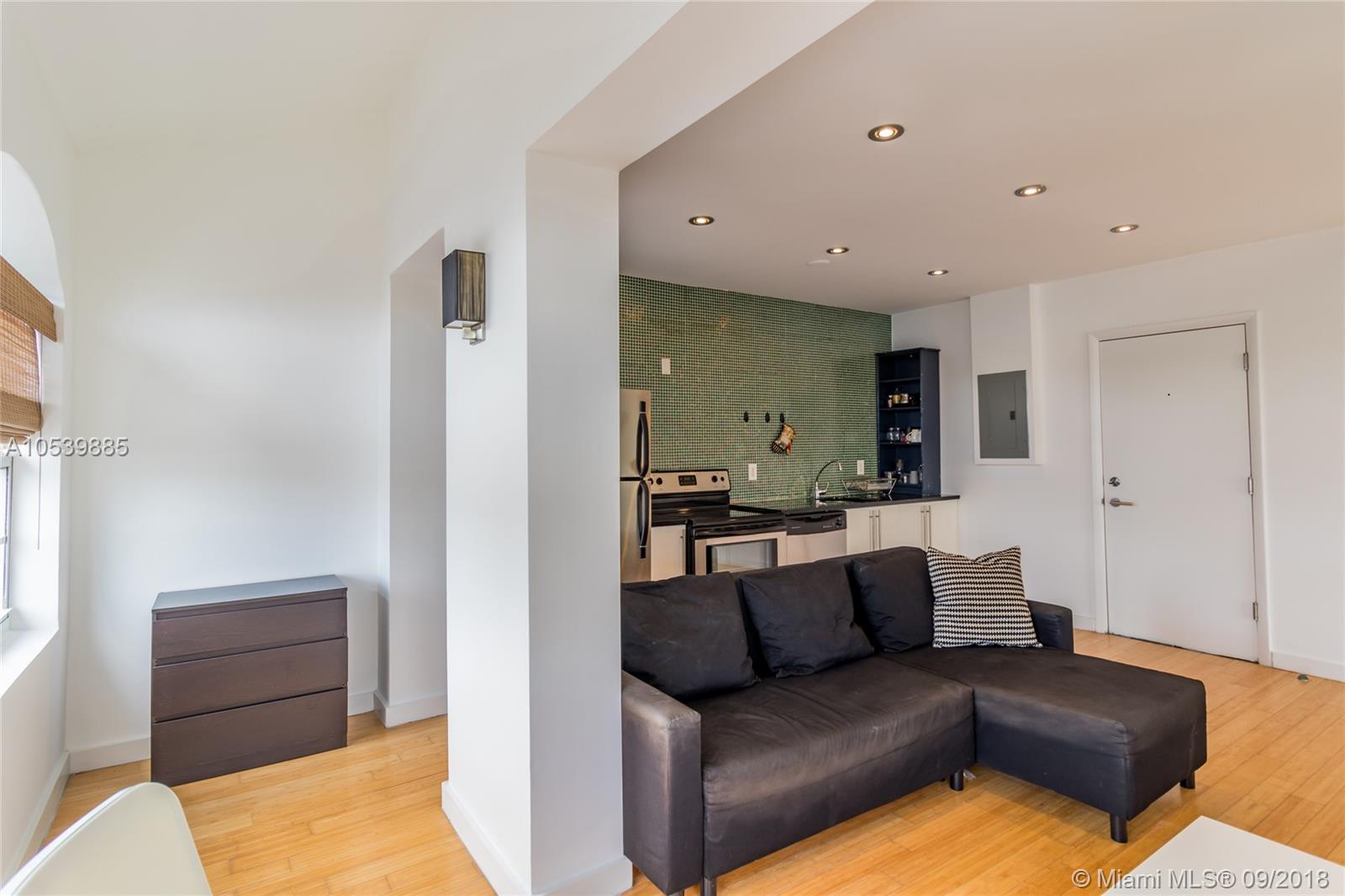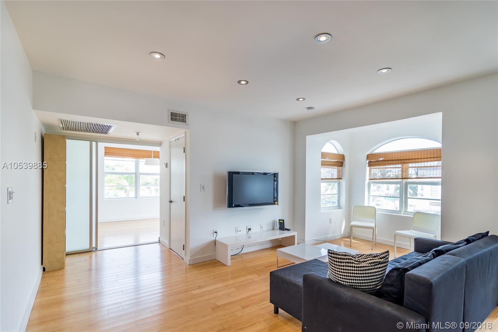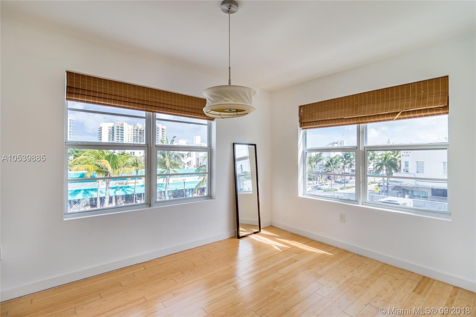 In the middle of all of the action!!! This top floor corner residence is flooded with light through corner windows, a great open floor plan with separate bedroom area and full kitchen. Steps from the ocean, Lincoln Road and everything South Beach, this renovated condo unit features European kitchen cabinetry with stainless steel appl, Duravitt bath sink, and Bamboo hardwood flooring and central air. This well kept building offers a recently updated lobby entry, common outdoor area and laundry on premises.