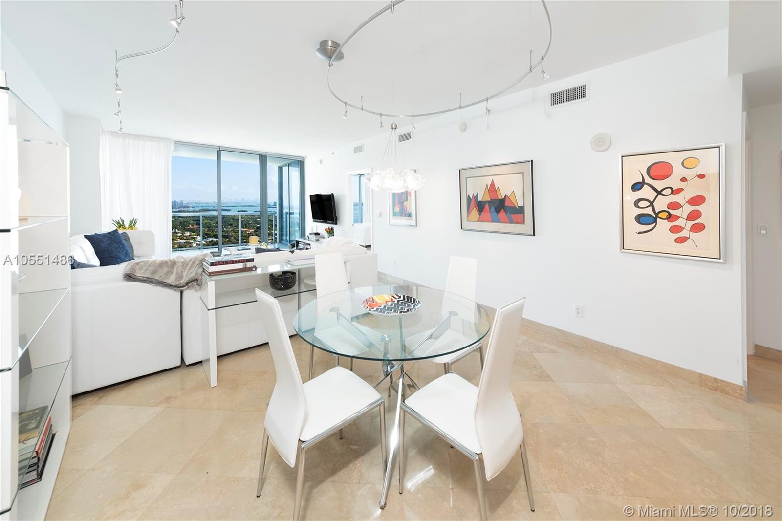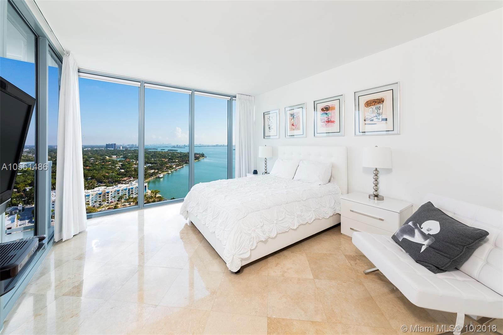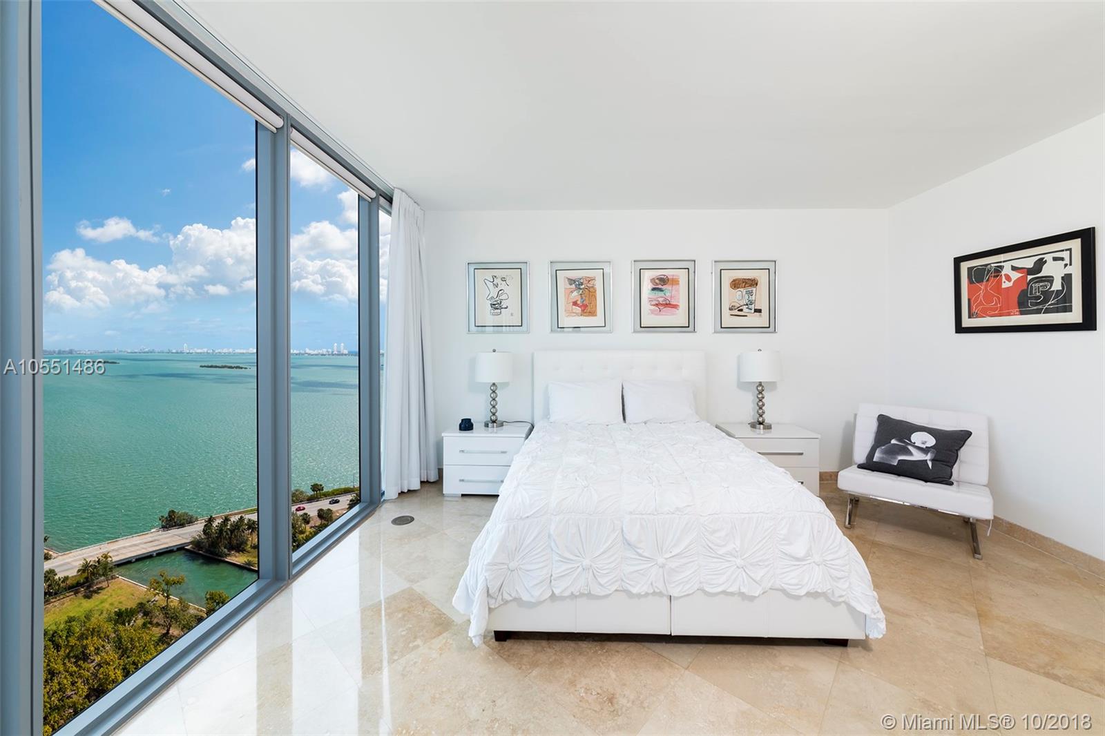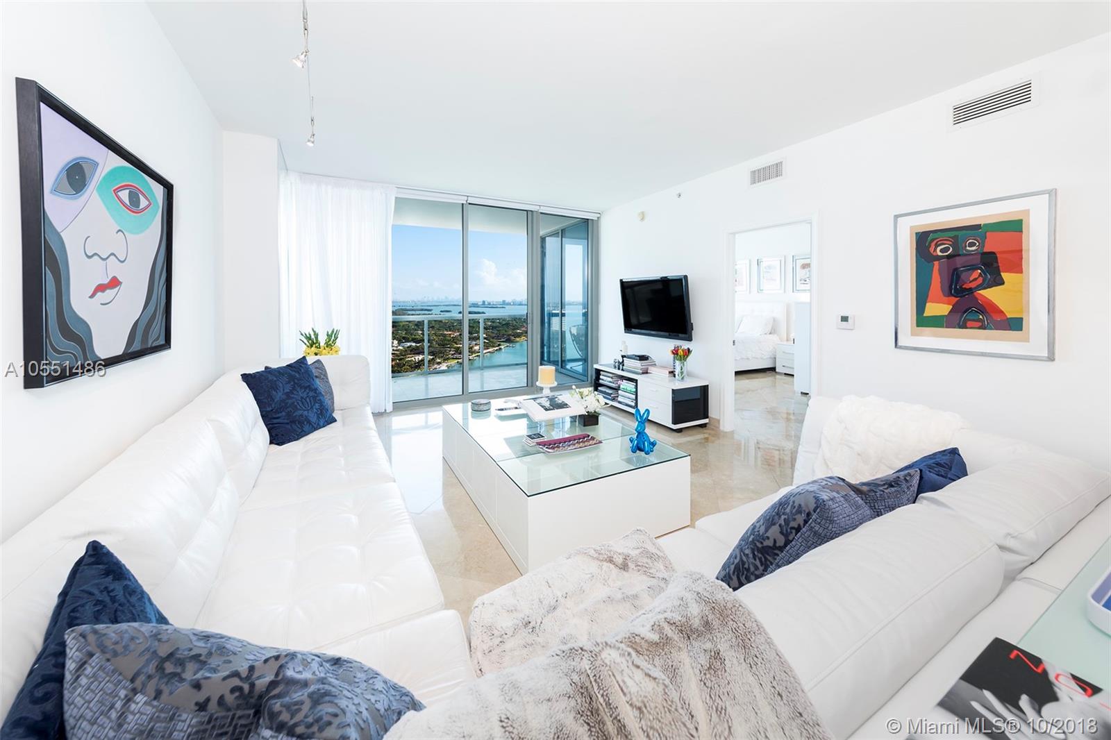Stunning turn-key residence at Blue. This 2 bedroom / 2.5 bath condo features beautiful unobstructed Biscayne Bay views and a fantastic open layout. Upgrades include marble floors throughout, built-in closets, electric shades and custom lighting fixtures. The master bedroom features floor-to-ceiling windows overlooking stunning water views as well as a spacious walk-in closet and an en-suite bath. The second bedroom also features an en-suite bath and is completely independent from the master. The kitchen includes a new refrigerator along with great counter space. Enjoy resort-style amenities at the well located Blue Condo, two pools as well as a state-of-the-art fitness center and club room. Minutes away from it all.