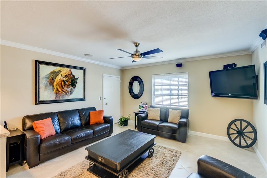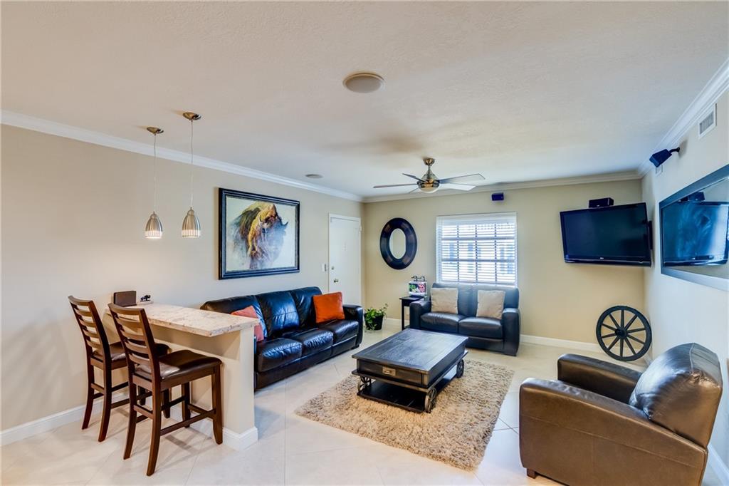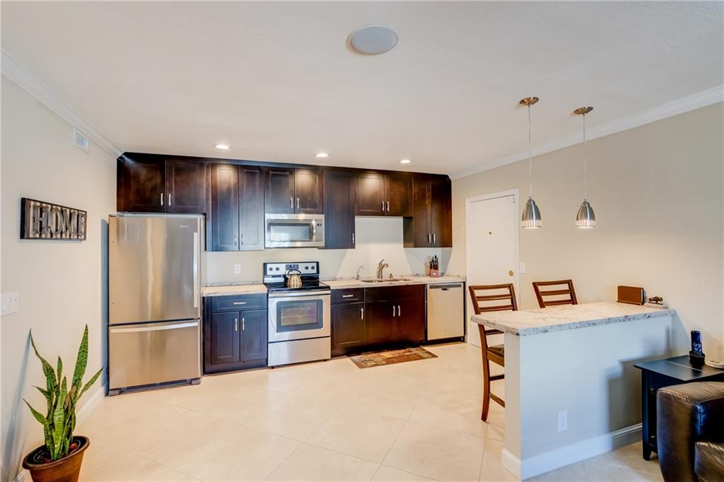 Completely remodeled , rarely available first floor corner unit. All new flooring, granite counters, wooden cabinets, premium lighting, built-in sound system and two flat screen TVs included. Awesome East Fort Lauderdale location. Minutes from the Beach, walking distance to: Park, Library, Restaurants, Stores, Supermarket. Complex has large heated pool and cabanas, community room, fitness center and Gas Grills. Private storage locker, Cable & Water Included with condo fee. All new appliances including air handler and water heater. Service/Emotional Support Pet allowed with proper documentation. One assigned parking space. All ages welcome.