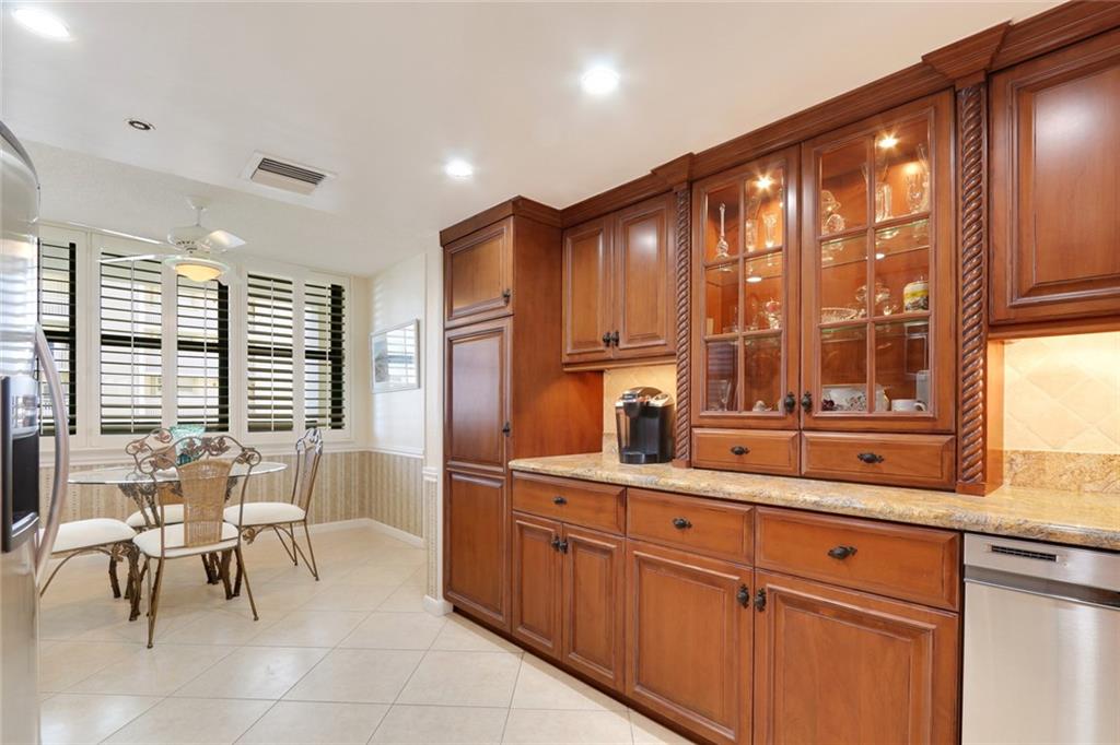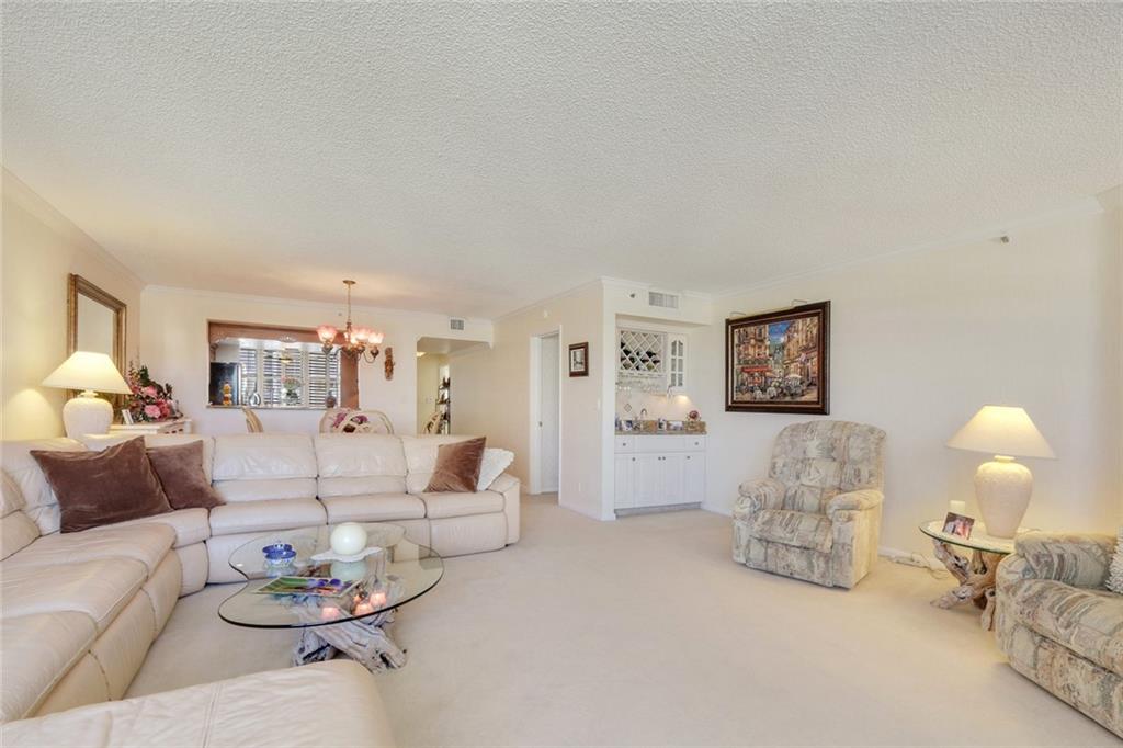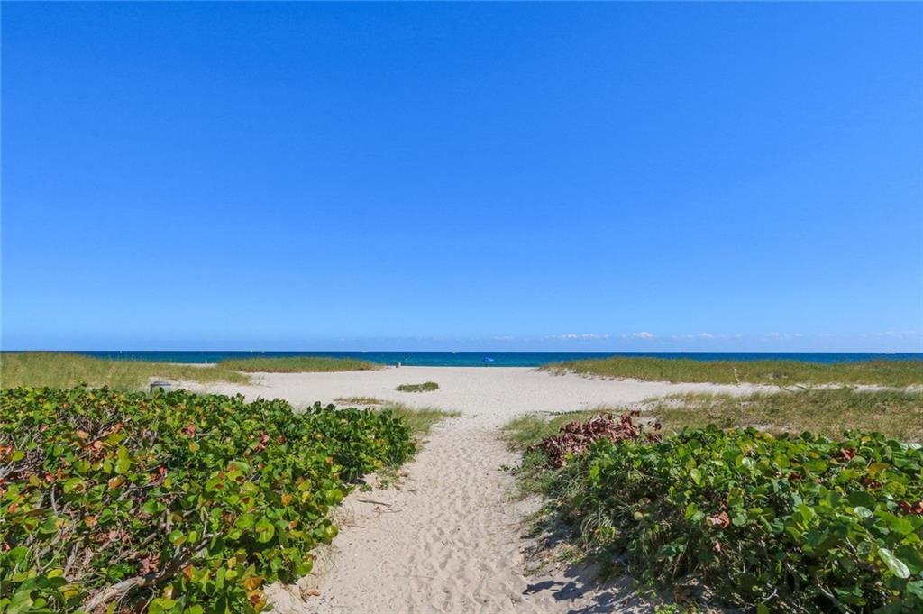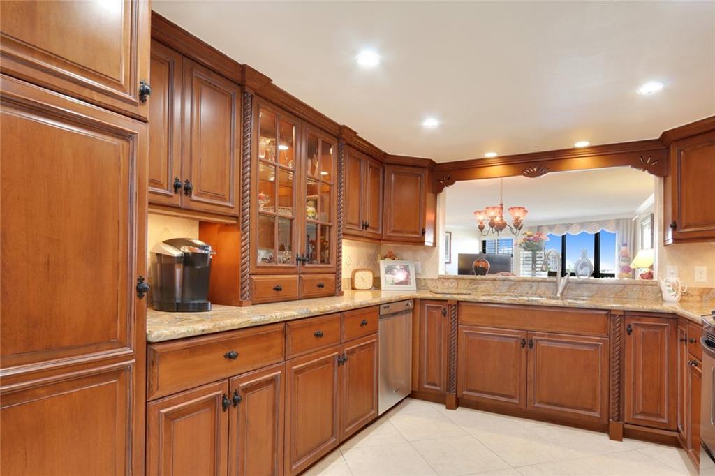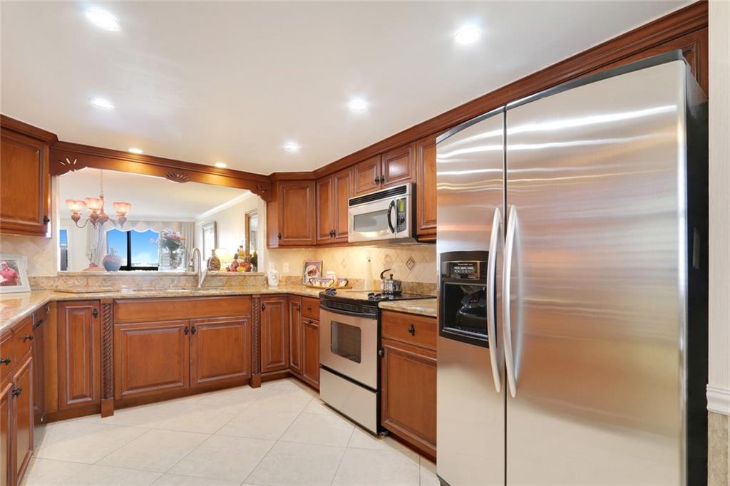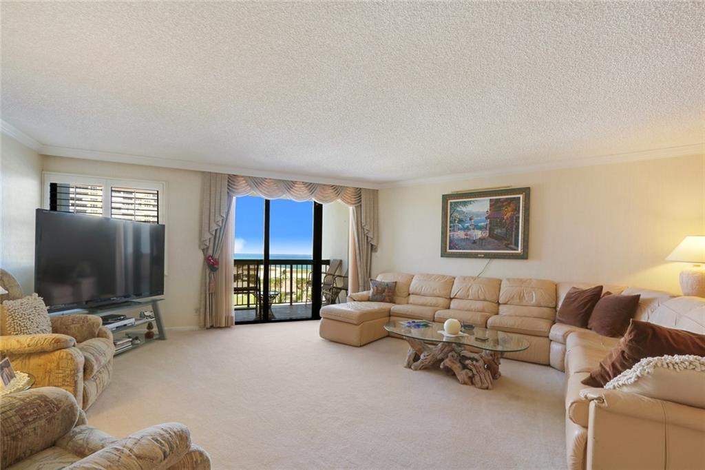 Rarely available is this corner view unit condominium with ocean views and located directly on the sand. Spacious floor plan with 1800 sq.ft. of luxury living. 2 en-suite bedrooms, walk-in closets and 3 private terraces. Master bedroom bath offers marble tile, dual sinks, separate shower and jetted tub. Stunning remodeled eat-in kitchen, solid wood cabinets, granite counter tops, tumble stone back splash and stainless appliances. Grand living room, dining area and wet bar. Laundry room with utility sink and stacked washer/dryer. Impact windows and doors, fire sprinkler system, assigned garage parking, additional guest parking, security building, no leasing and pet friendly. Enjoy ocean views from most rooms and beach living!