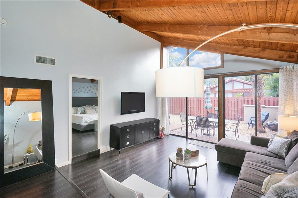 Cozy 2 Beds 2 Baths Villa with a Loft, Have a Log Cabin Feel Yet Contemporary in Prime Location Close to Major Highways & Entertainment! Vaulted Exposed Beam Ceilings, Newer Stainless-Steel Appliances, Newer Water Heater, New Flooring, Updated Bathrooms & Kitchen, Washer & Dryer in Unit. One-Year-Old Roof! Huge Master Bedroom! 2nd Bedroom Has Loft! Fenced Backyard with Room for a Pool. Extremely Low HOA & Taxes! Community Offers A Pool, Tennis Court, Gym, Dog Park. FHA & Friendly!