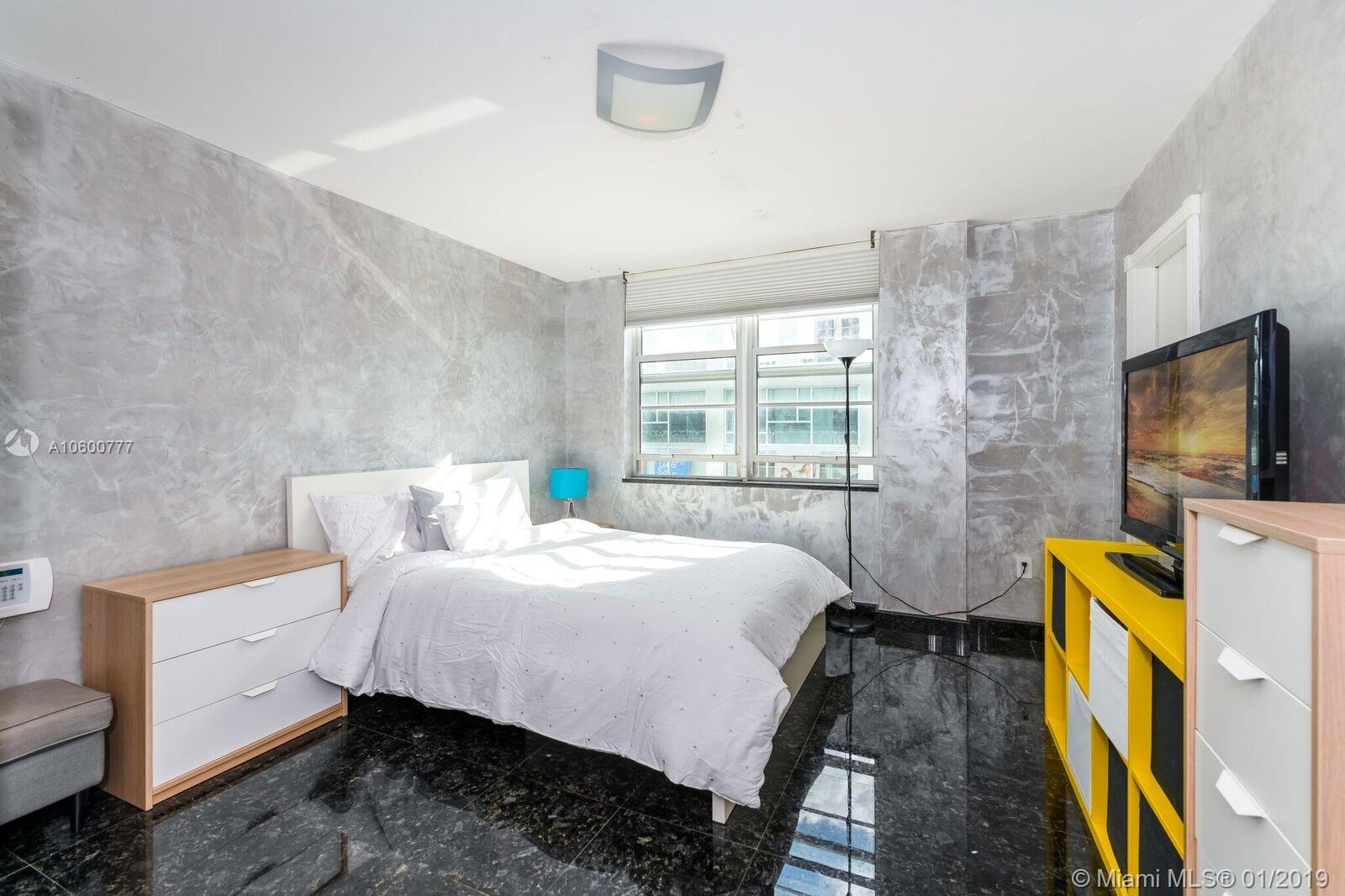 Great investments opportunity. Come view this gorgeous 2 bedroom,1 bathroom apartment with walking distance to beach. This apartment is located in the heart of South Beach. Living, Dining, Kitchen cabinets are solid cherry wood, and glass, with Stainless steal appliances, Black Granite counter tops, Glass stove top, Granite Floors, Wrap around balcony, All walls have Venitian Plaster (spatula Tuci), High impact hurricane windows and sliding glass door. Window treatment included, Walk in master closet, Multiple closet with excellent space. View of water and of Collins Ave. A must see!