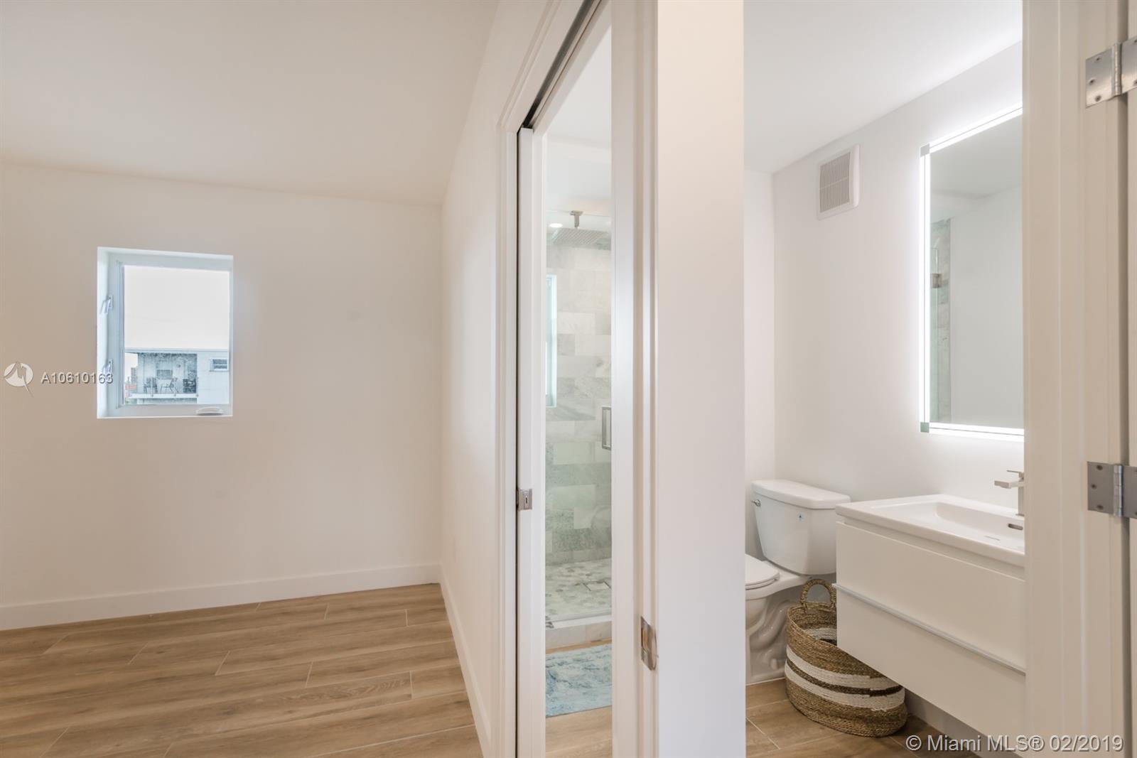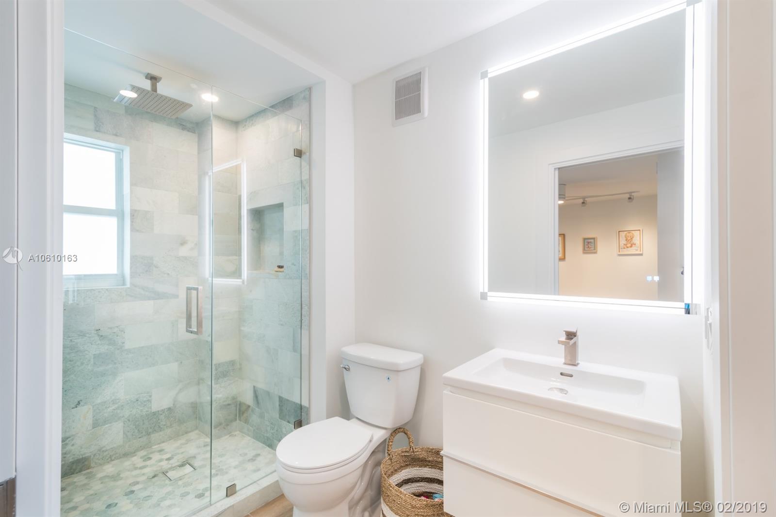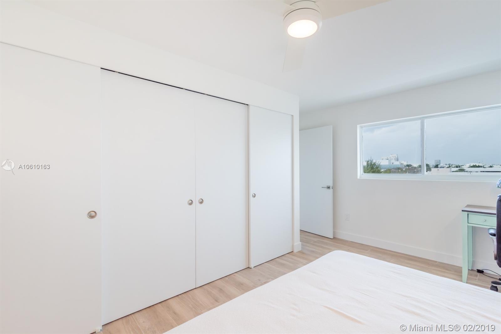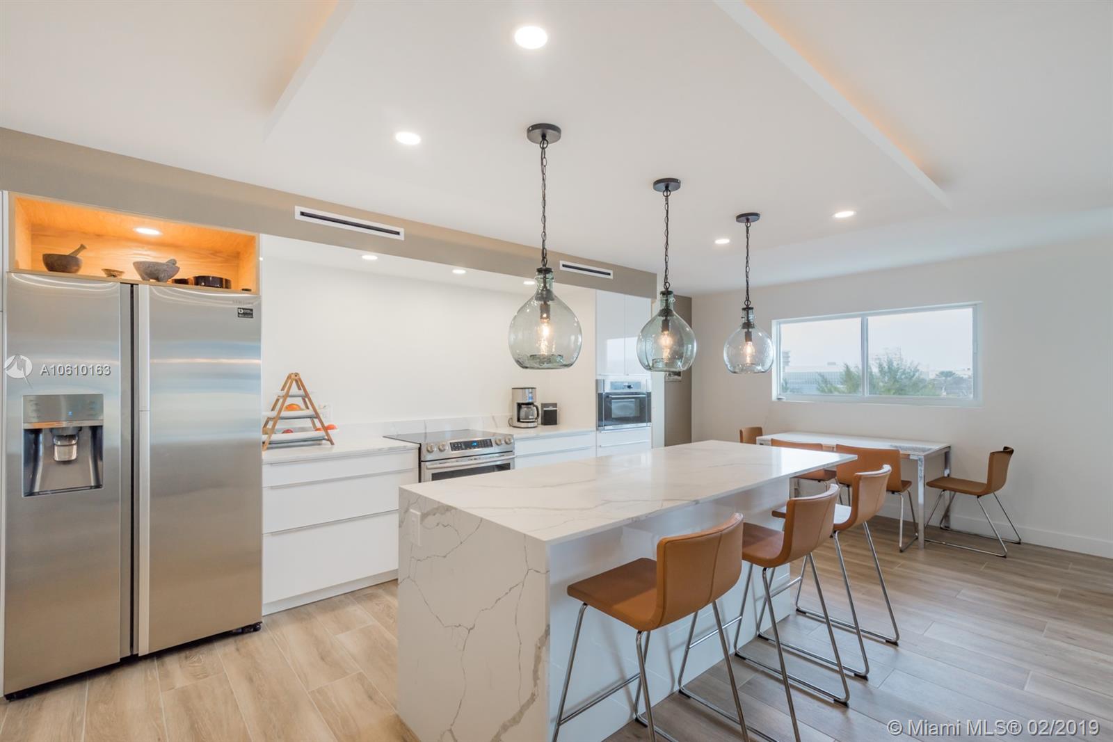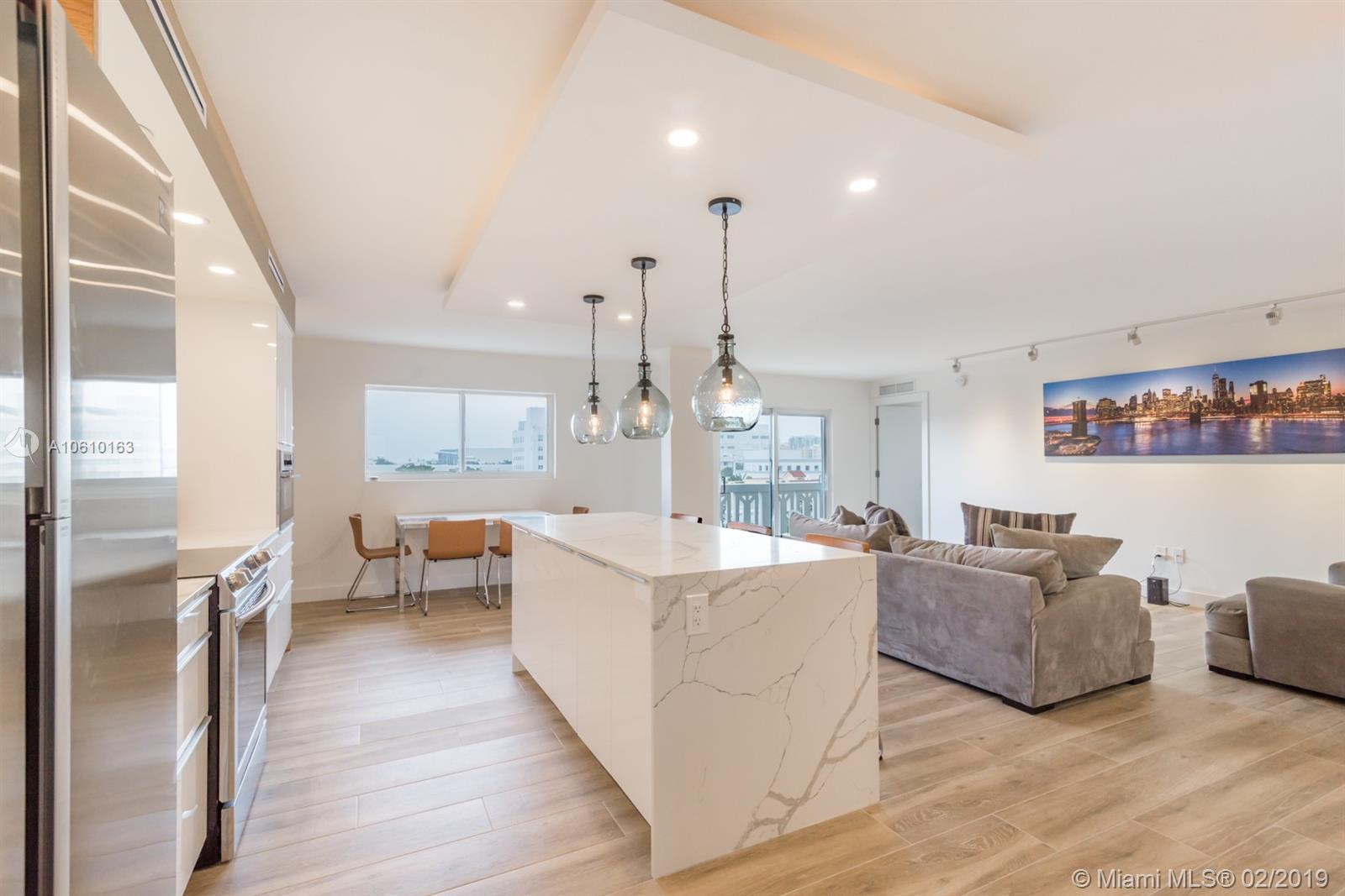 Floor-through penthouse w/brilliant natural light, 100% brand new construction & spectacular unobstructed views. Steps from Lincoln Rd and the beach. Huge open concept kitchen & living area, perfect for entertaining. Finished with high end stainless appliances, sleek white cabinets, Carrera style quartz countertops and large waterfall island. Two generous bedrooms, each with en-suite bathroom & large closet with custom built-ins. Contemporary LED lighting and sound insulation throughout. Hurricane impact windows & doors. Bosch Washer/Dryer. One assigned parking space. This stunning restoration is fully permitted. Building is completing 40 yr. re-certification, including new elevator & lobby refresh with no buyer assessment.