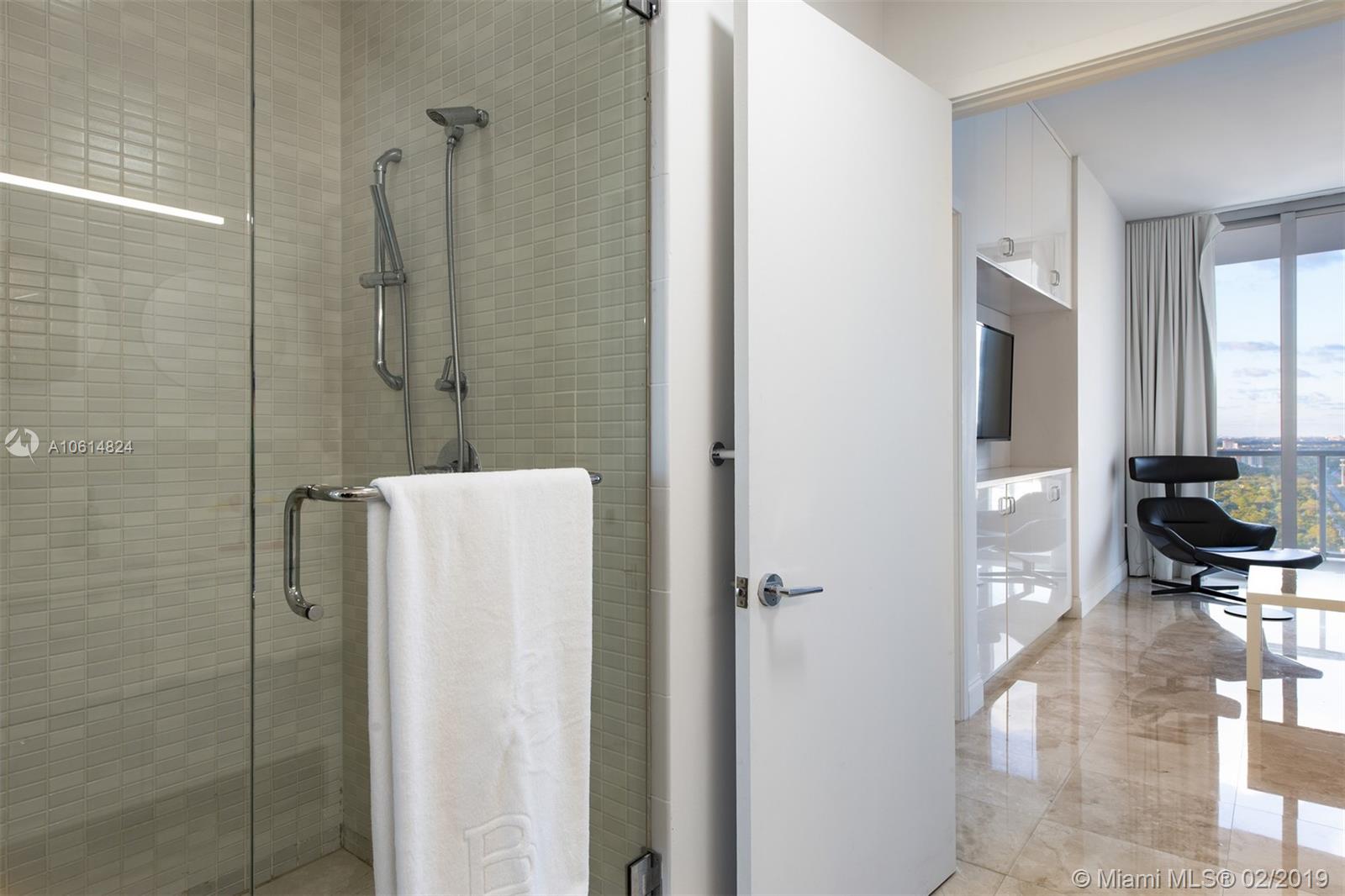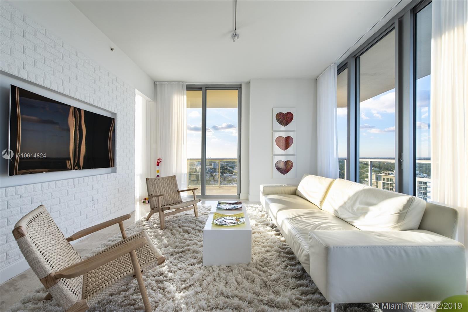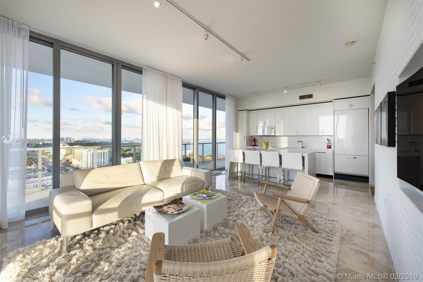 Enjoy breathtaking sunsets and bay views from this contemporary 2 Bed + Den / 2 Bath residence in coveted 2Midtown. An architect's home, this immaculate residence features marble flooring throughout, custom made kitchen cabinets with Miele appliances, quartz counter tops, luxurious bathrooms with custom built cabinets and quartz countertops, brick accent walls, 10 foot height ceilings, and an oversize terrace with glass railings overlooks the Bay and the Design District. 2Midtown is a full service tower offering renovated luxury common areas & amenities such as fitness center, pool with towel service, steam room, sauna, concierge & valet parking. Downstairs you will find some of the hottest restaurants and ultra-luxury shops in Midtown and the Design District.