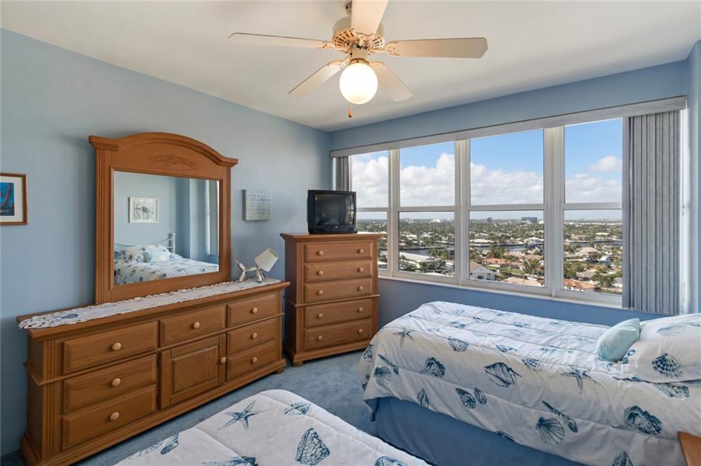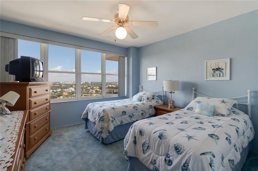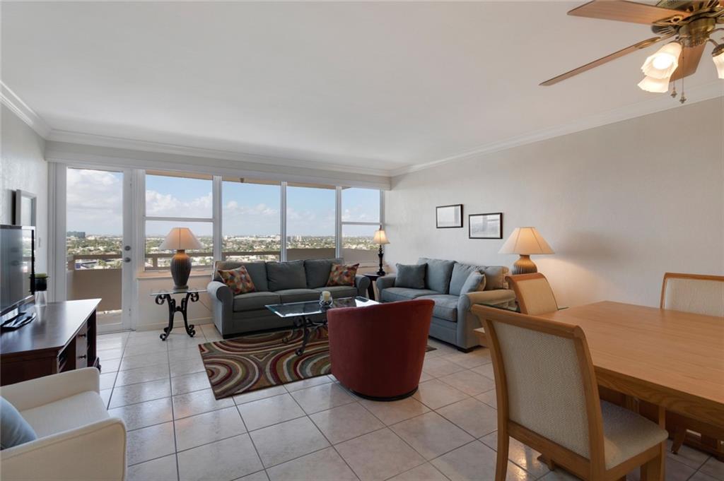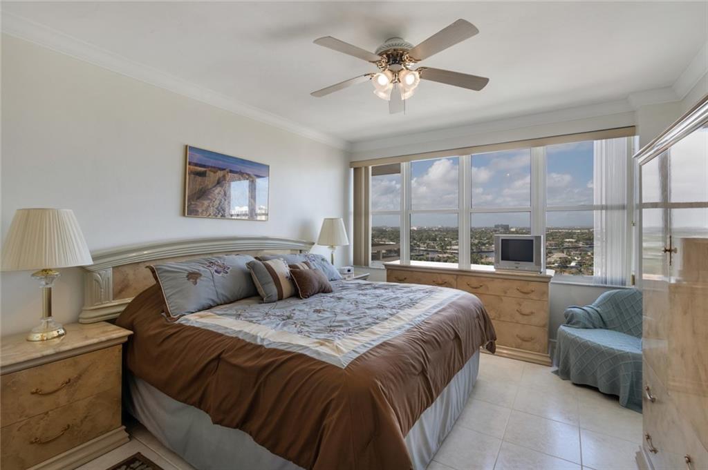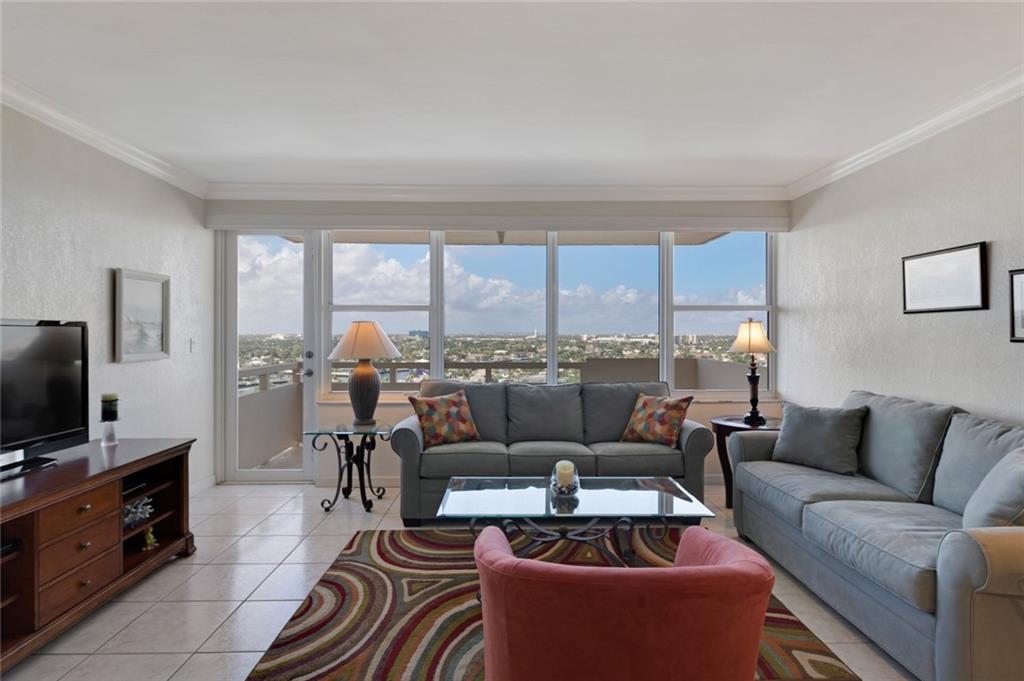 This view will knock your socks off! North West exposure with breathtaking views of the Intracoastal, Ocean, and surrounding neighborhood. Two bedroom two bathroom apartment with tile floors throughout the living spaces. Hurricane impact windows and door installed. Central Air Conditioning. Large private balcony with stunning views. Chic updated lobby and hallways. Enjoy the daily boat parade from the private clubhouse on the Intracoastal. Tropically landscaped garden area with a 30 x 60 heated pool. Located in a beautiful walking neighborhood between the Ocean and Intracoastal. Association states one buyer must be 55 plus, no pets or rentals. Coral Ridge Towers is a fantastic place to call home.
