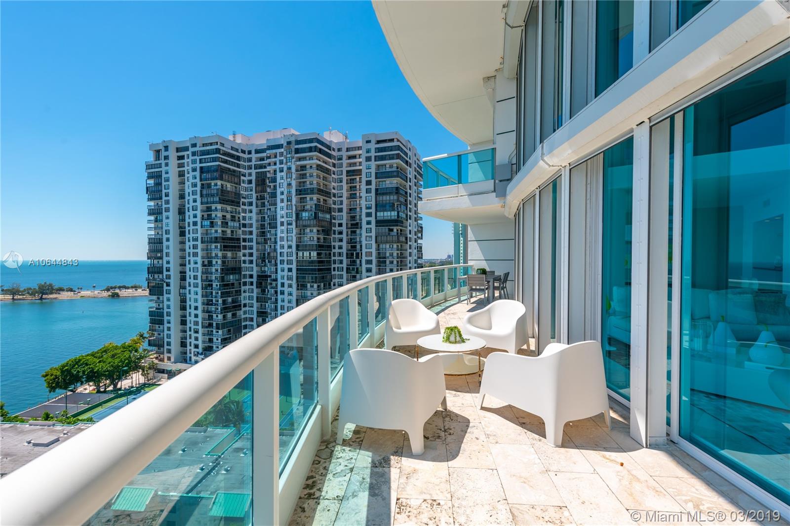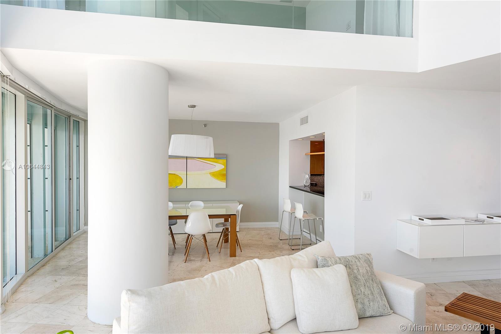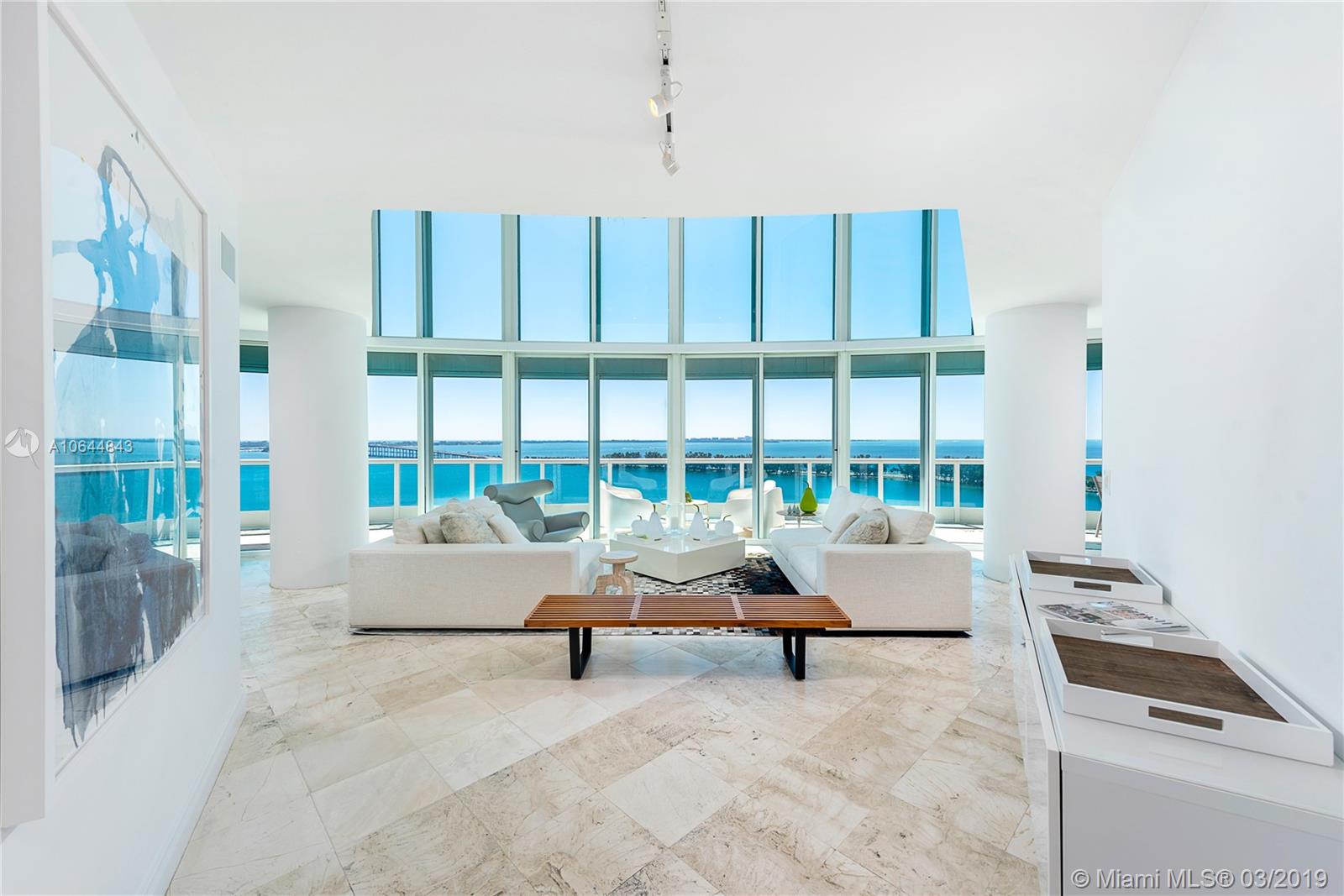 Distinguished Full Service Ugo Columbo building. Highest floor all waterfront Townhome (floors 18/19th ) double height 50 ft wide great room w/floor to ceiling windows (approx. 18' Ht), & panoramic views of Biscayne Bay /Ocean from all rooms. approx 2700 sf interior plus approx 700 sf waterfront wrapped terraces from all principle rooms. 2 Bedroom Suites & Office & Den. 3Ba & Powder room. Stone main floor w/ gracious foyer & wide stone stair to upstairs. Master w/ own terrace, two WIC, two baths & linen. Guest with Bth, own terrace, WIC and 2 linens. Ample storage throughout. 3 parking spaces, Concierge, Tennis, fitness, coffee shop. Kitchen w/ New stainless appliances. Laundry room. Millionaires mile location close to upscale shops & dining, I-95 & KB.