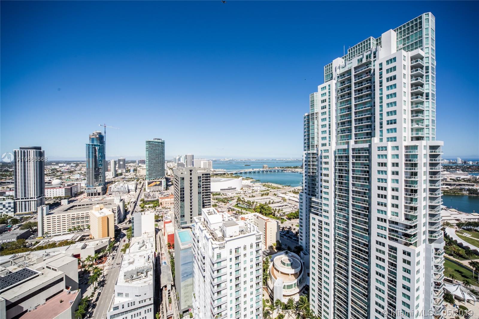 CORNER UNIT! Spacious and bright 2/2 loft with 10 feet high ceilings with City views. Unit comes with washer, dryer, dishwasher, sealed Concrete Floors, High Ceilings, Floor to Ceiling Impact Windows, Private wraparound terrace, 2 Full Baths, European Cabinetry, Stainless Steel Appliances, Granite Counter tops. Building offers full amenities, a roof top pool and expensive gym, with Sauna and Jacuzzi, community room with wi-fi. Metromover at your doorstep. Walking distance to AA Arena, Bayside, Miami-Dade Community. Easy access to I95 and major expressways. 1 parking.