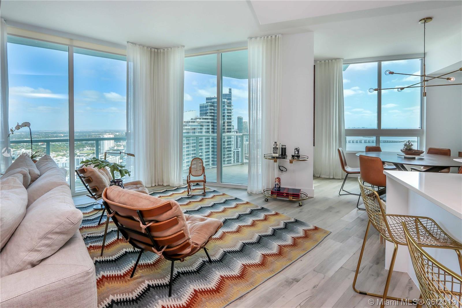 Fully remodeled penthouse with gorgeous new flooring, redesigned bathrooms and kitchen, 2 assigned parking spaces and private storage!. Corner unique residence featuring bay views from every room with direct North East exposure offering plenty of natural light. Expansive floor plan with exceptional distribution, foyer, powder room, open kitchen with stainless steel appliances and European cabinetry. All 3 Bathrooms feature brand new vanities from "Restoration Hardware". Desired location across Margaret Pace Park and minutes to Design District, Wynwood and Midtown. Amenities include 2 swimming pools, 24 hour security, two-story recently renovated fitness center, sauna,club room with billiards tables,movie Theater and much more. Do not miss this opportunity to live in the center of it all!.
