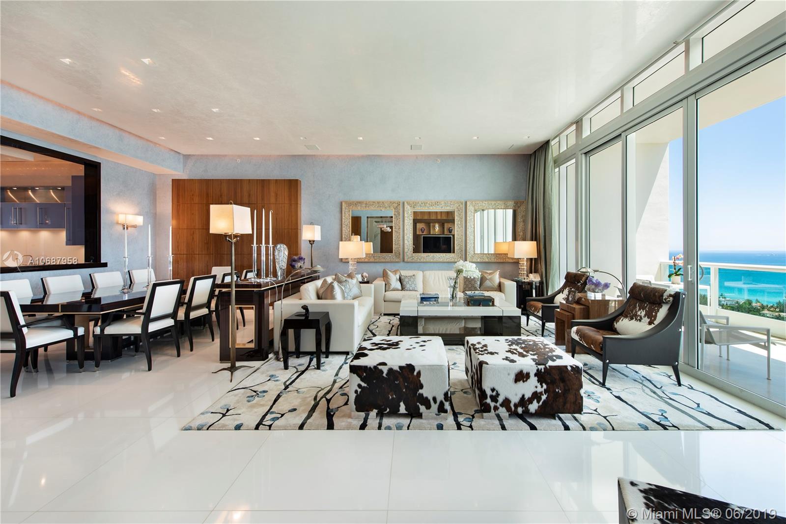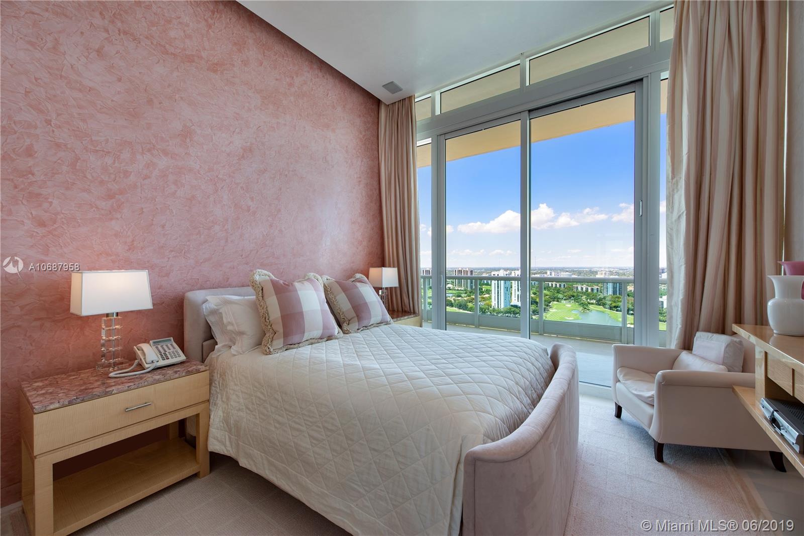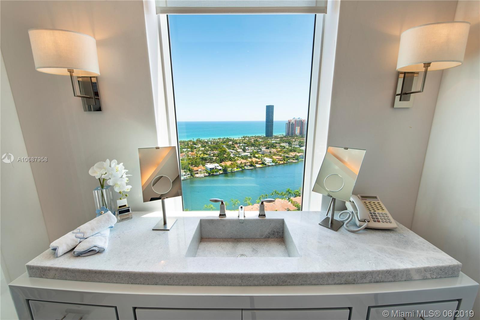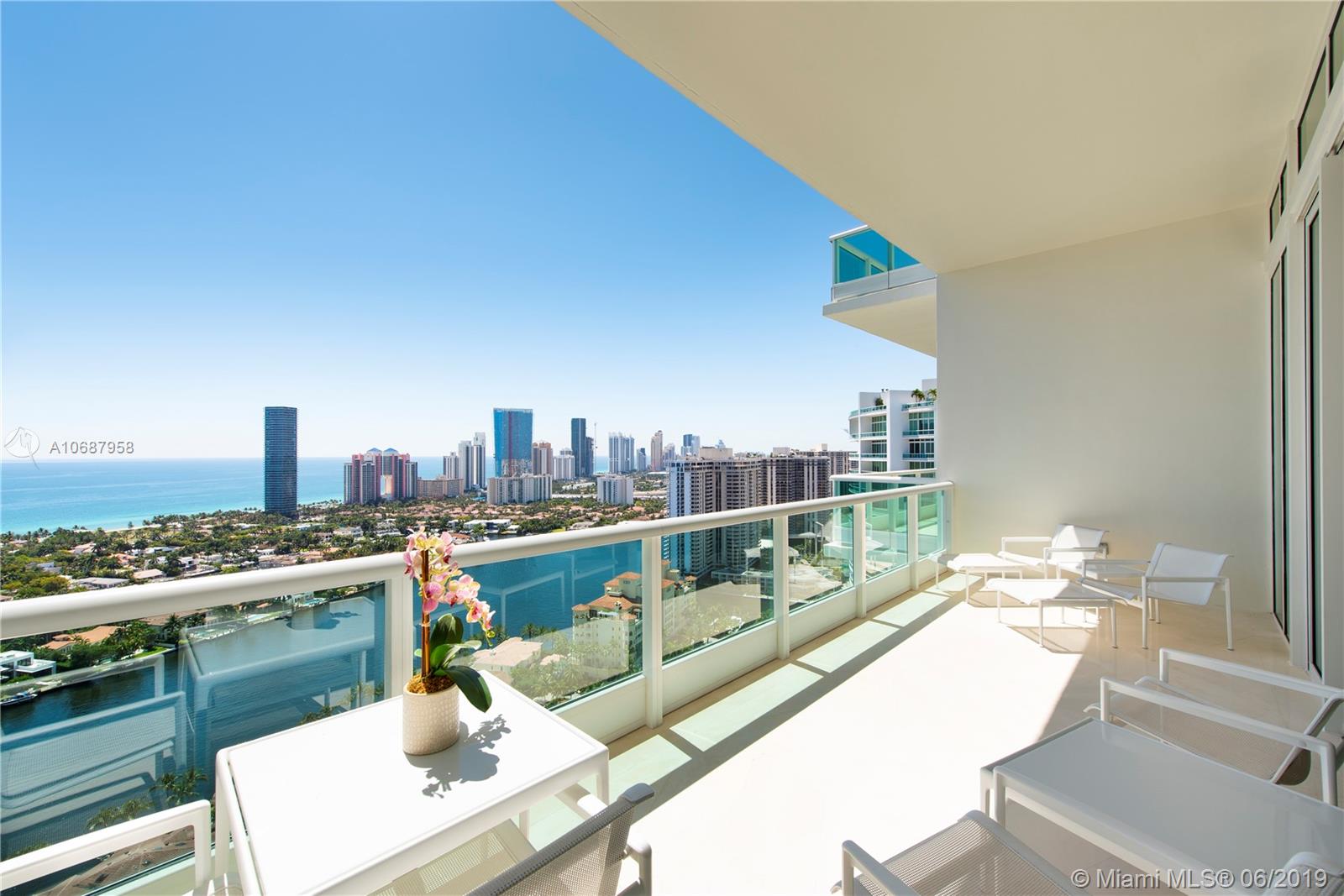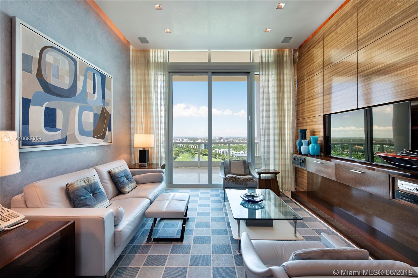 REFINED AND TIMELESS DESIGN captures you upon entering this Penthouse residence. 12 Ft. high Volume ceilings & wide expanses of wall to wall sliding glass doors and impeccable white marble floors reflect the sweeping views of the Ocean and Intracoastal on the East facing terraces & Golf/City views on the West side terrace.Completely UPGRADED with a re designed floor plan that includes a Den. All custom Makassar wood doors, Snaidero custom kitchen, exotic blue & white marble & granite as well as pink onyx throughout the upgraded baths. Modern lighting set in curvilinear drop ceilings, complete home automation system for sound, lighting & window treatments. Full house filtration and water softening system, 3 a/c units, double capacity water heater.FURNITURE NOT INCLUDED IN SALES PRICE.
