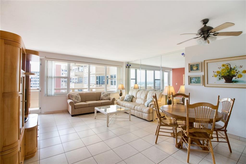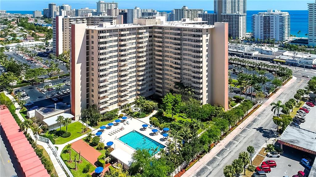 One bedroom one bathroom apartment with lovely views of the pool, downtown Fort Lauderdale and the Intracoastal Waterway. Tile floors throughout the living spaces and hurricane impact windows / door installed. Large kitchen with ample counterspace and storage. Two walk in closets. Updated bathroom with walk in shower. Private balcony and fantastic amenities including a tropical garden area with a 30 x 60 heated pool. Association states one Buyer must be 55 plus. No pets or rentals. Coral Ridge Towers South is a fantastic community located on a barrier island between the Ocean and Intracoastal Waterway. You will love living here!