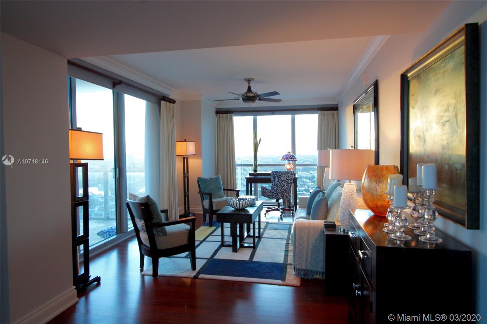 Incredible opportunity to own a luxurious villa in the sky on the 29th floor. Step off private elevator through double doors into this large corner condo with 270 degree panoramic views through floor-to-ceiling glass and two huge balconies. Direct ocean, Intracoastal & city views are spectacular day and night. Beautifully finished with wood floors, granite counters, Italian cabinetry, high-end appliances (Sub Zero, Thermador, Miele), Jacuzzi tub, frameless glass shower, crown molding and built-in closets. Third bedroom open to living room - can be enclosed. Two parking spaces close to elevator (level P2). Enjoy the 5-star amenities: 2-story fitness spa, ocean-side pool, hot tub, towel and chair service, tennis court, media & party rooms, concierge, business center, and 240 feet of beach!