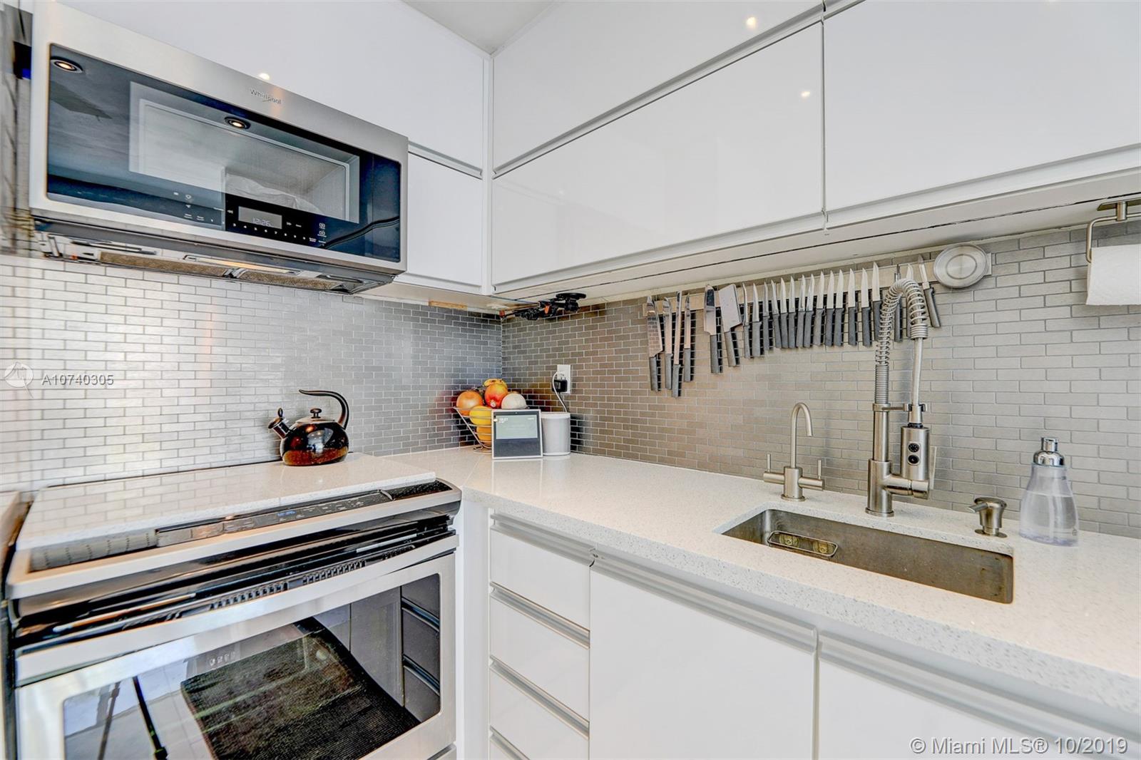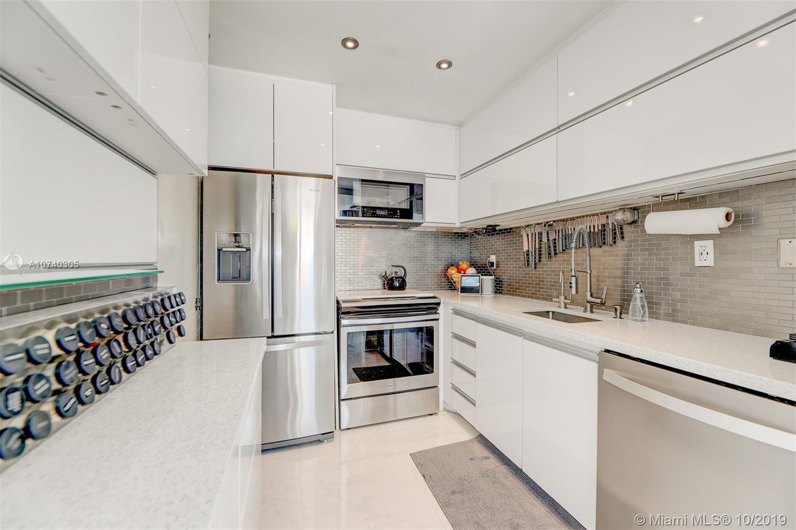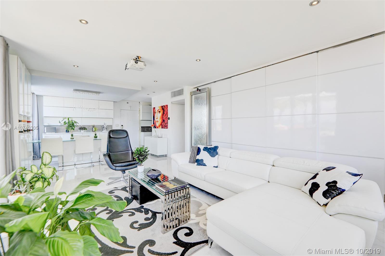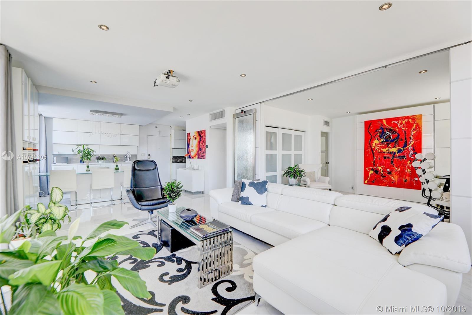 Designer bayfront unit w direct bay views. Beautiful sunsets f/ the expansive outdoor terrace. Direct quick access to pool, jacuzzi + street. Porcelain white carrara marble floors throughout. Ultra modern white finish. Modern kitchen w quartz counters, new 2018 stainless steel appl. Custom lighting, closets + barn doors. Recently completed hurricane proof windows + slider replacement. New 2018 upgraded 3-ton AC. Fully automated home for entry, lights, music + AC. Recessed projector screen in Living. New 2019 solar shades throughout. Most desirable corner line in the bldg. Steps f/ Whole Foods, Walgreens, Publix, shopping and dining. All furnishings also available for move-in ready.