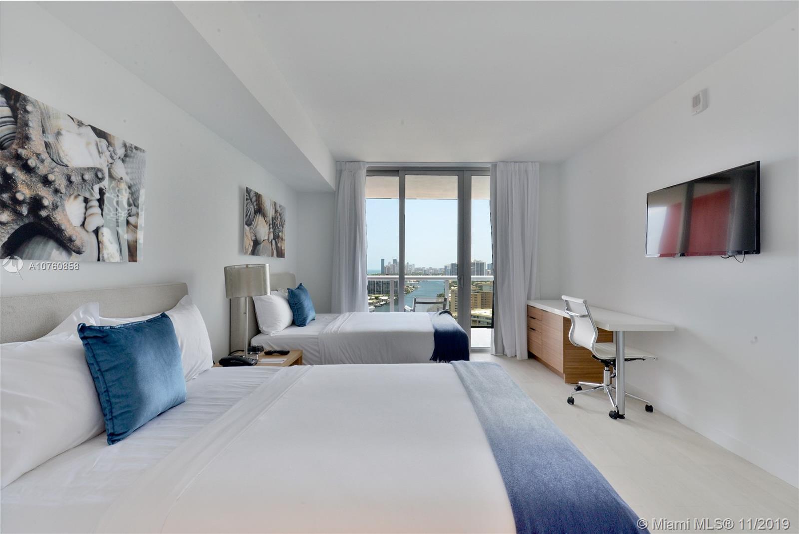 This spacious two bedroom, two bathroom apartment in the luxurious newly constructed Hallandale Beach complex is furnished in modern tasteful décor in earth tones which sets the serene setting for this perfect condo unit. Step out on to the veranda, from the light airy living room and relax on the patio which overlooks the tranquil Intracoastal.