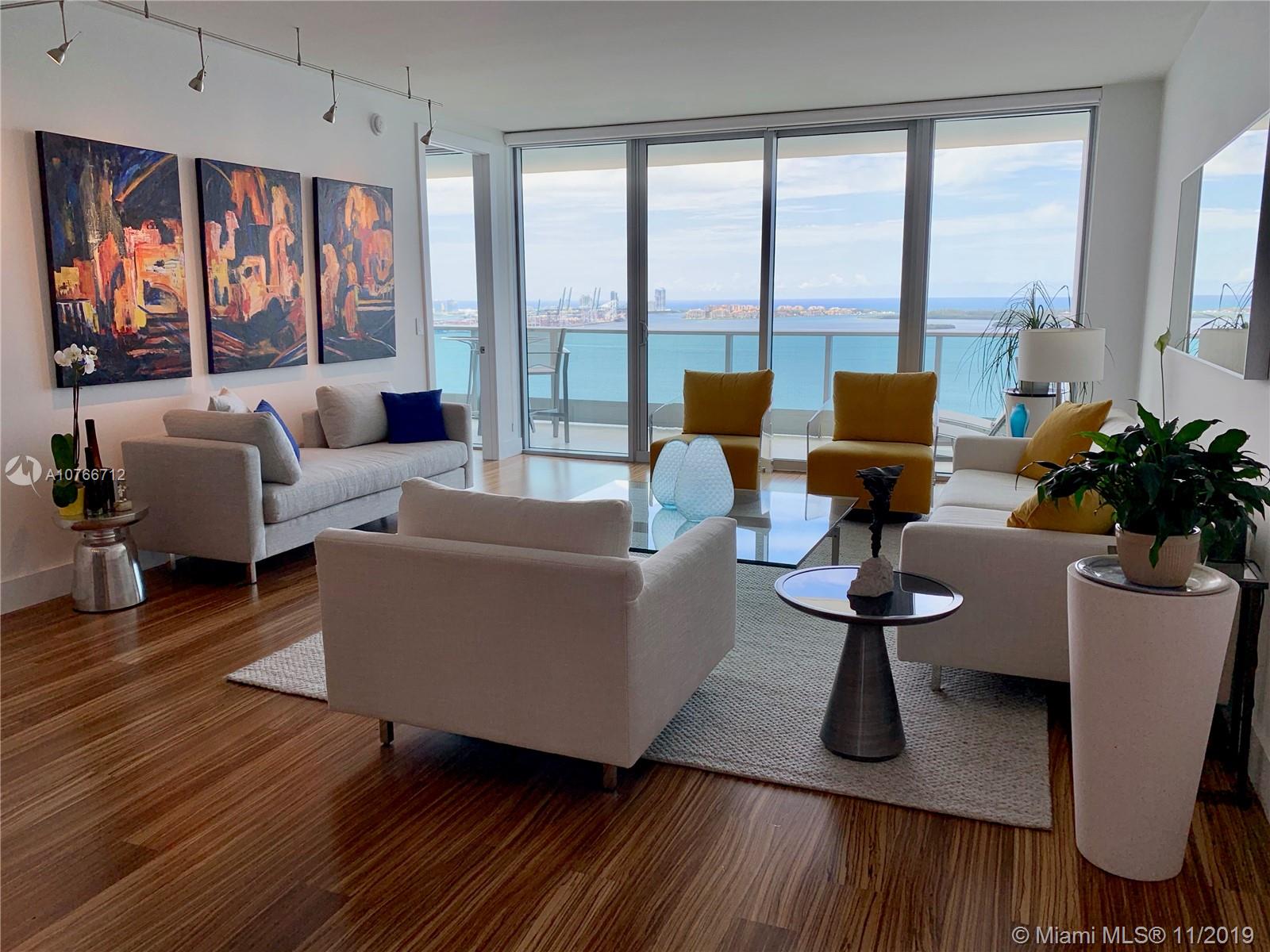 Completely renovated. Move-in-ready. This 3 bed/3bath has the best flow thru floor plan. Enjoy a spacious and private east balcony w/endless Bay and Ocean views that will never be obstructed. The West balcony has gorgeous Miami views. Private elevator foyer. The open kitchen w/island seating is perfect to entertain. Custom cabinets, Quartz counters/backsplash, high-end appliances including Wolf Induction cooktop. Baths updated w/Toto and Kallista. LED lighting fixtures and Lutron Caseta technology that controls lights/2 Zone AC System. Marble and wood floors. Unit includes 2 separate assigned parking spaces plus valet. Extra storage unit. Building offers 5 Star amenities, infinity edge pool, full gym w/spa facilities. Best location on Brickell. Well Managed Bldg. Must see!