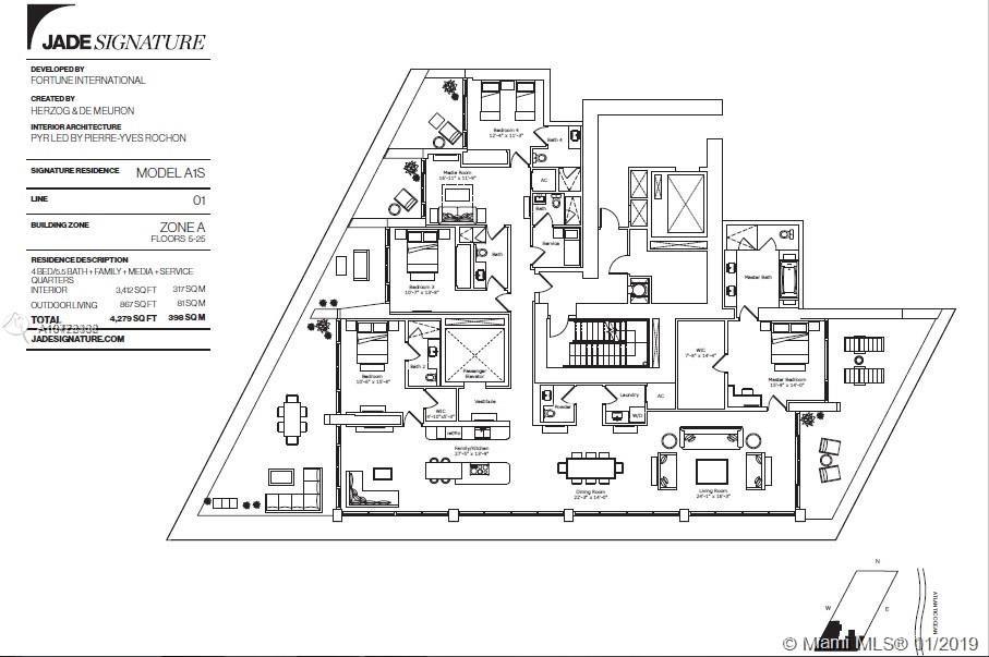 Incredible opportunity in the exclusive Jade Signature. A private elevator entry welcomes residents to one of the best floor plans this oceanfront building has to offer. This residence enjoys 180 degree ocean and sunset views over the Intracoastal Waterway. This corner unit, line 01, has 4 bedrooms and 5.5 bathrooms, media room, family room and service quarter. Electric shades in all rooms. With floor to ceiling windows throughout, 2 parking spaces and storage space, this offering is unique within its kind. Amenities include: Club Room, Breakfast Café,Library, Business Center, Play Rooms, Beach Bar & Grill, Tata Harper Spa w/steam, Sauna, Hammam, Beauty Salon & Water therapy terrace. Fitness facilities w/spinning studio, Pilates, outdoor yoga & mediation deck. Sellers financing available.
