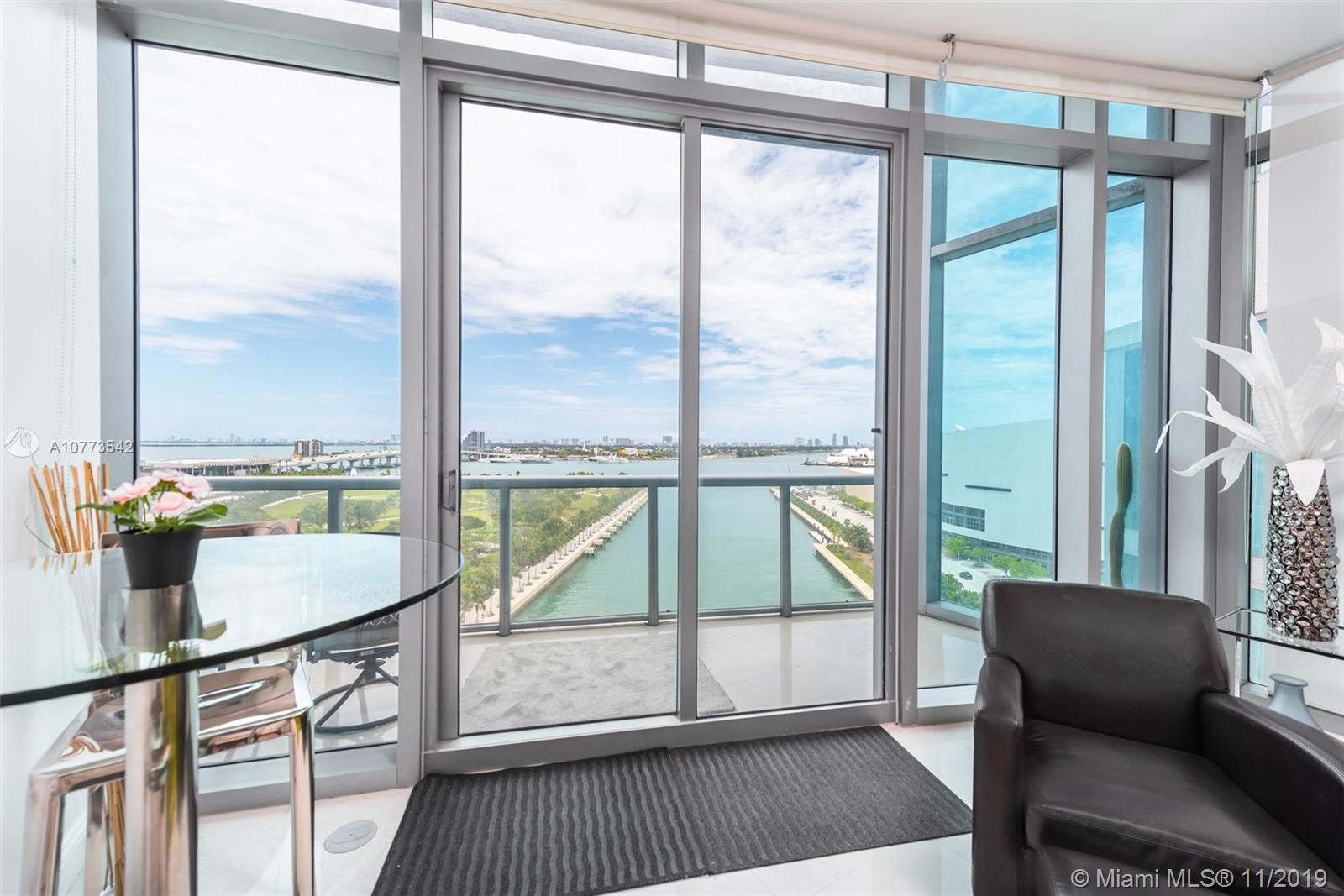 A beautiful 1 Bed + Den/2 Bath condo @ Marina Blue w/ 1,220 interior square feet, white porcelain tiled flooring throughout, new washer/dryer, new a/c unit, stainless steel appliances, and soaring 10.5-foot high ceilings w/ floor-to-ceiling glass windows offering direct, unobstructed views of Biscayne Bay, the cruise ships & Museum Park. Impeccable condition!!! The den is large enough to use as a 2nd bedroom. Includes 1 assigned parking space + storage cage. Building amenities include 2 swimming pools (sunset & sunrise pools), hot tub, fitness center, BBQ area, sand volleyball court, 24-hr concierge, 24-hr valet parking & business center. 1 block from the upcoming 9-acre, mixed-use development called Miami Worldcenter, 4 blocks from the Adrienne Arscht Center & 7 minutes from South Beach.