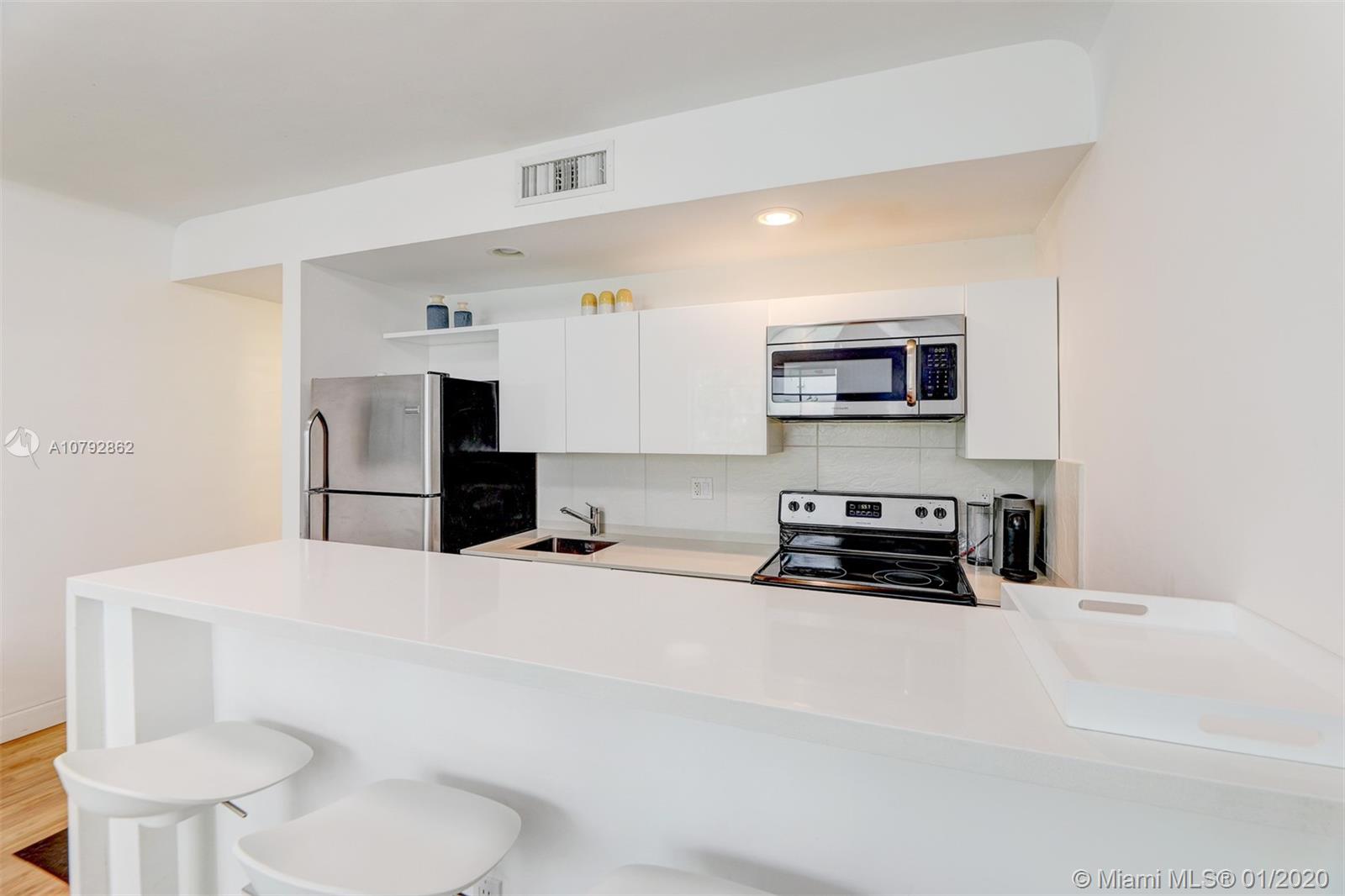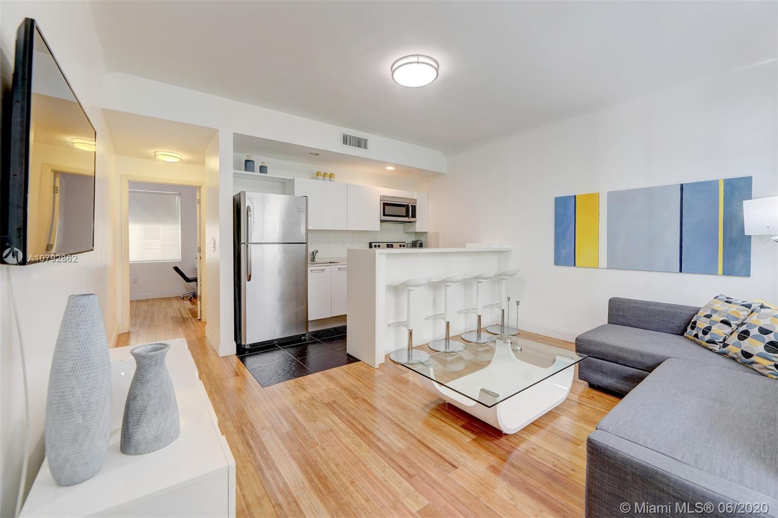 Turn-Key Art Deco charm in the heart of South Beach!! This renovated and ready to move-in one bedroom apartment is located on a quiet building only 2 blocks from Lincoln Road Mall, Flamingo Park and 5 blocks from famous Ocean Drive/Beach. All white kitchen cabinets with quartz countertop and stainless steel appliances. High counter with bar stools. Central A/C, Washer/Dryer Combo for added convenience. Very spacious modern bath with frameless shower door. Oversized window bringing natural light into the apartment. Enjoy South Beach Living or use as your own vacation getaway. Apartment comes fully furnished including appliances, electronics, housewares, linens, art work and decoration. South Beach Photo Credit - Eric Giuliani