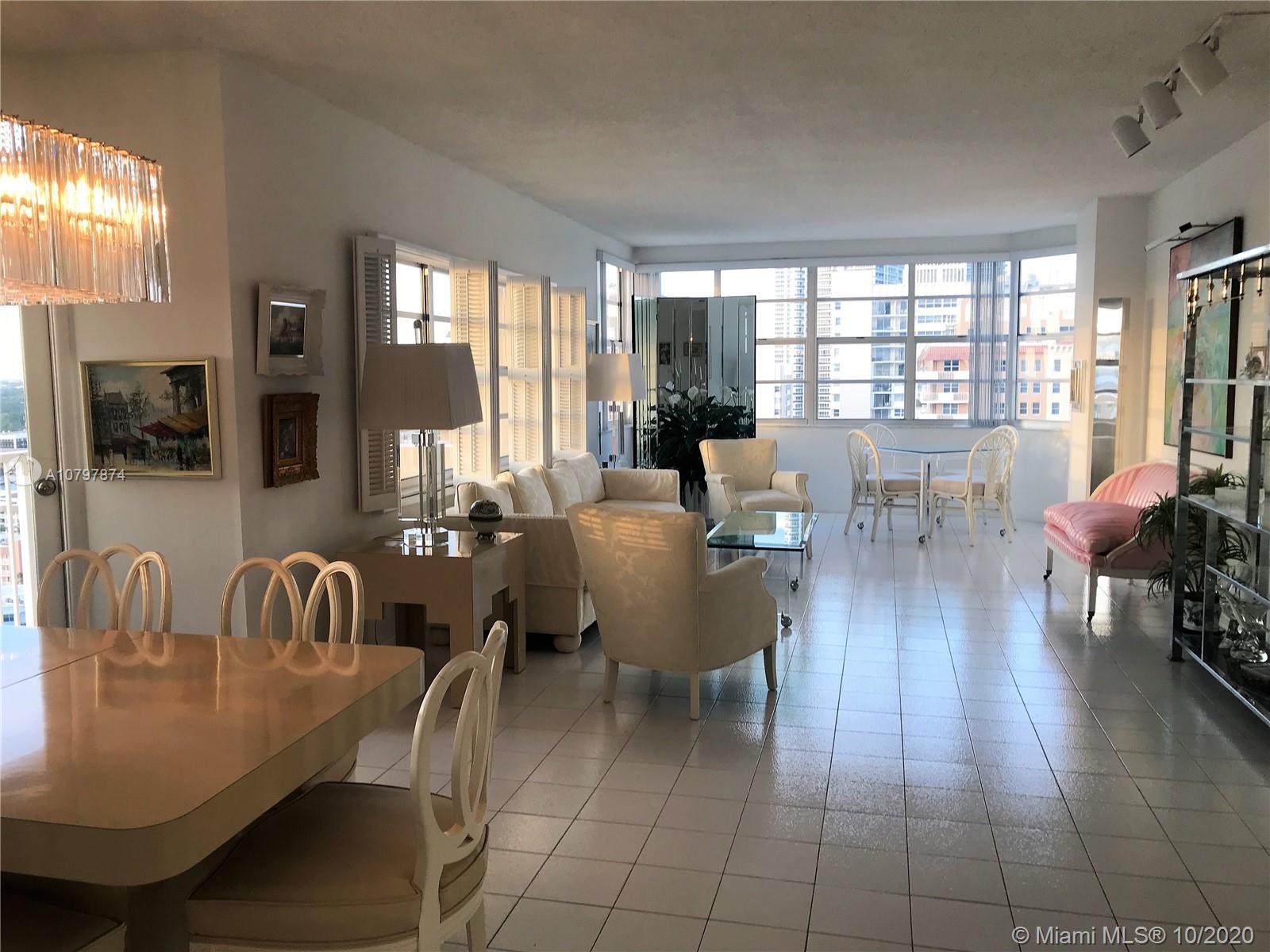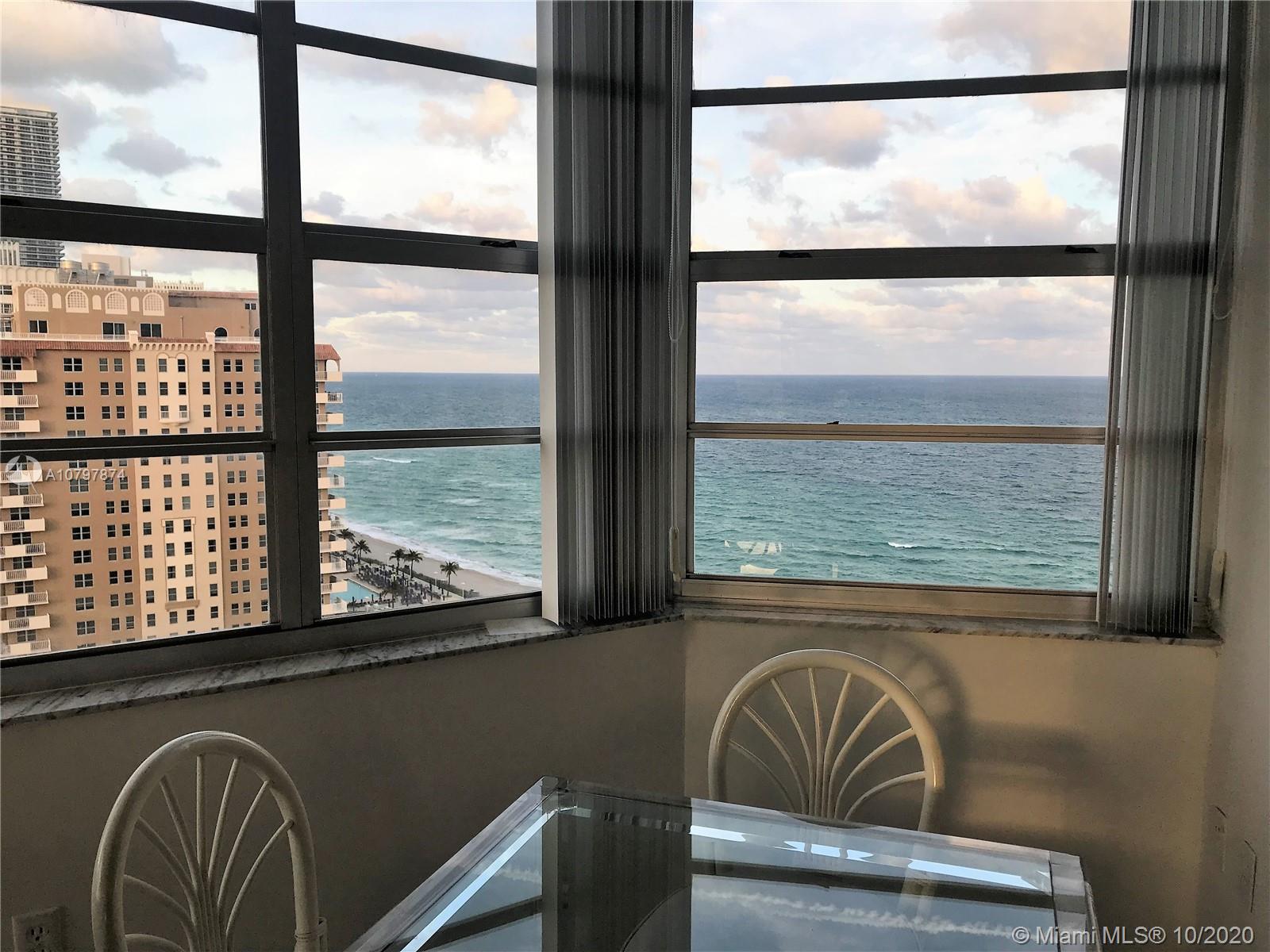 Ocean front corner unit. Floors throughout. Large balcony with amazing views. Walk in closets. A/C, Cable, Internet, Water, Garage Parking Included. Lots of Amenities. Snack bar by the pool 2 Restaurants, Bar, 2 Pools, 2 GYMS, Tennis & Basketball Courts, Putting Green, Shuffleboard, Billiards, BBQ, Courtesy bus, and much more. Centrally located minutes away from shops, dining and entertainment. Near the famous Hollywood boardwalk and Gulf Stream Casino.
