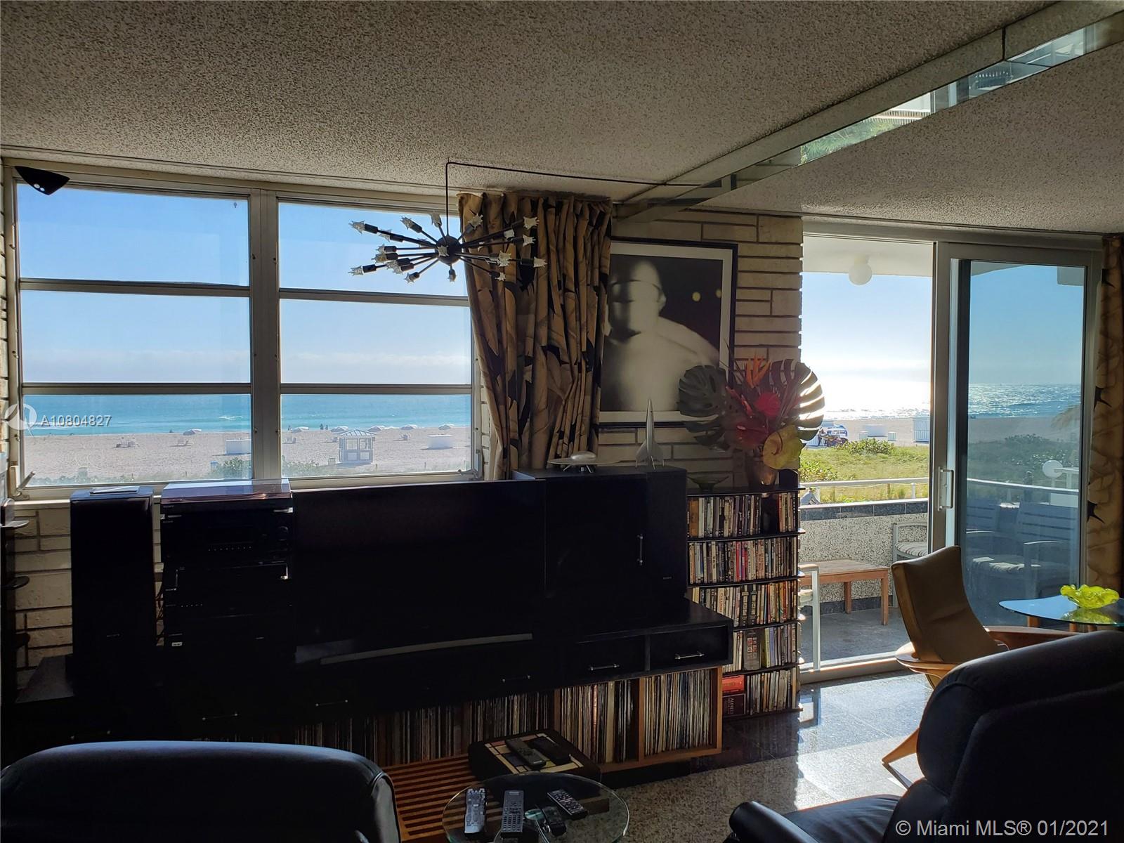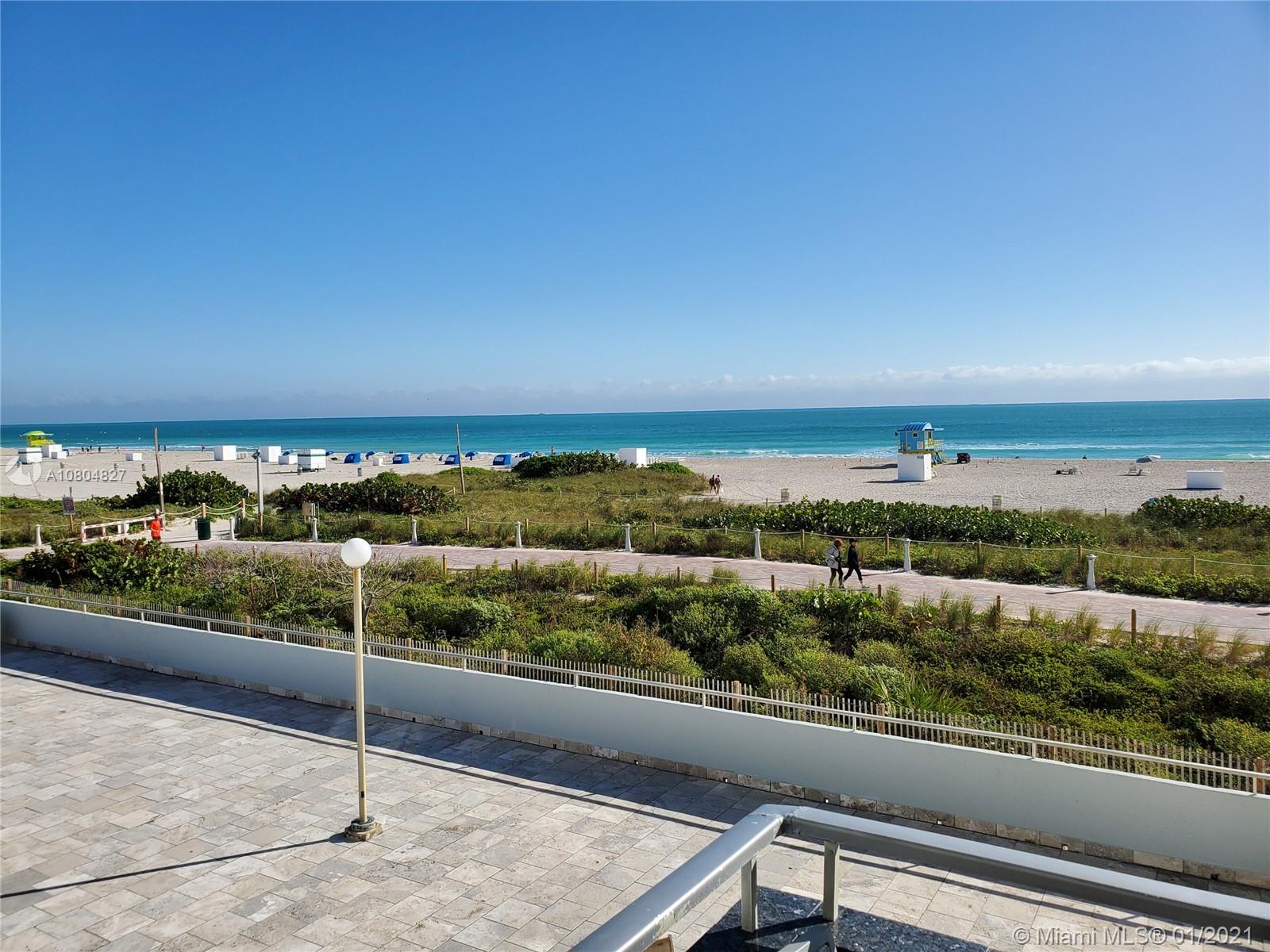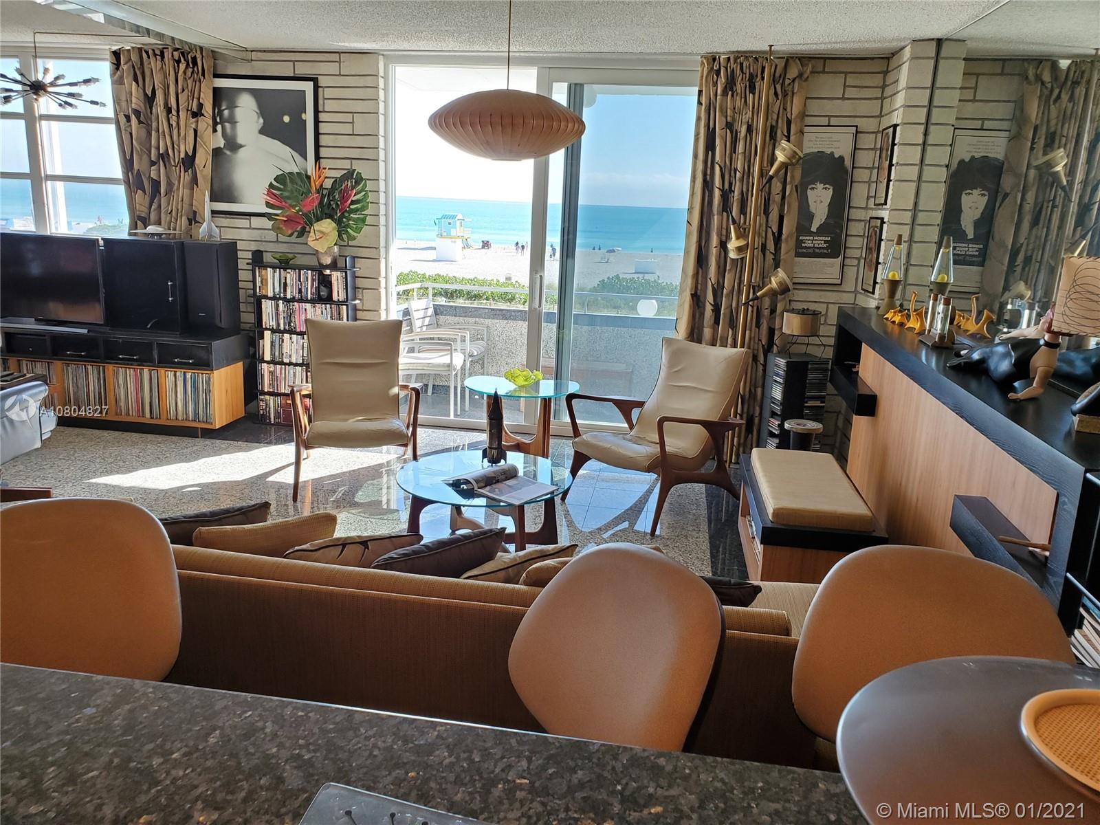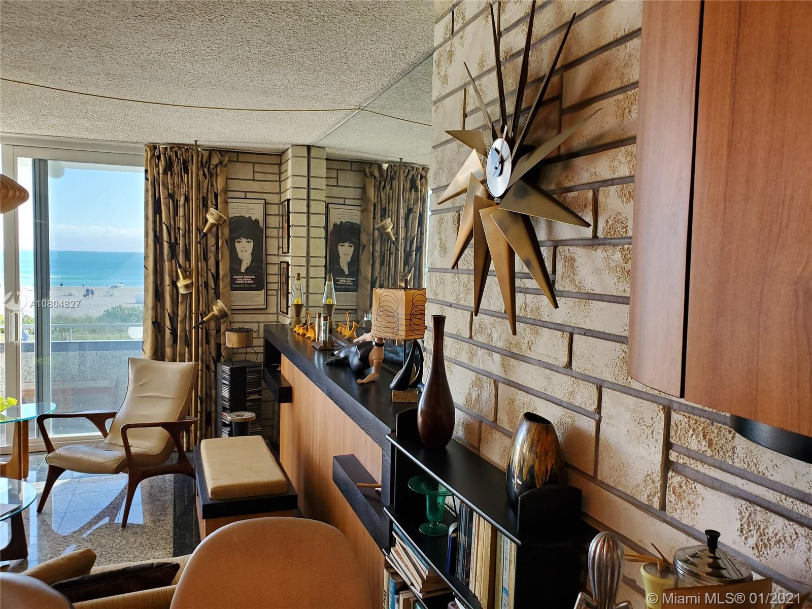Spectacular UNOBSTRUCTED DIRECT OCEAN VIEWS and Lumnus Park view in coveted South of Fifth. Most desirable NE Corner unit w lots of sun light . The apartment has been completely restored with the 60's in mind . A piece of art. Very low maintenance fee incl. WiFi, Tivo, cable, beach lounge chairs + umbrellas, saunas, oceanview gym, & heated pool.. New boardwalk and Jogger's path, direct beach entrance. Extremely convenient and precious assigned parking space