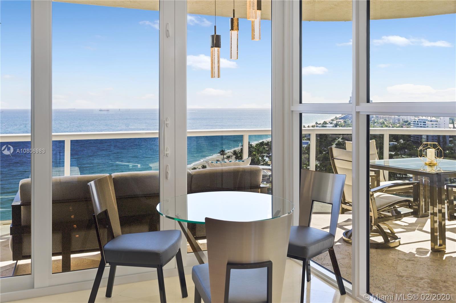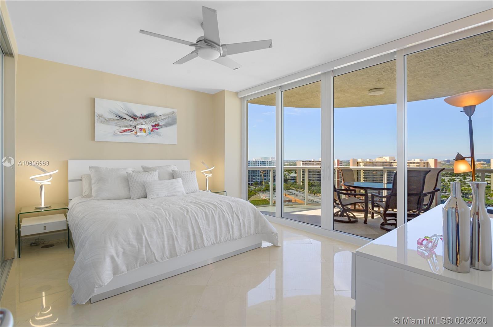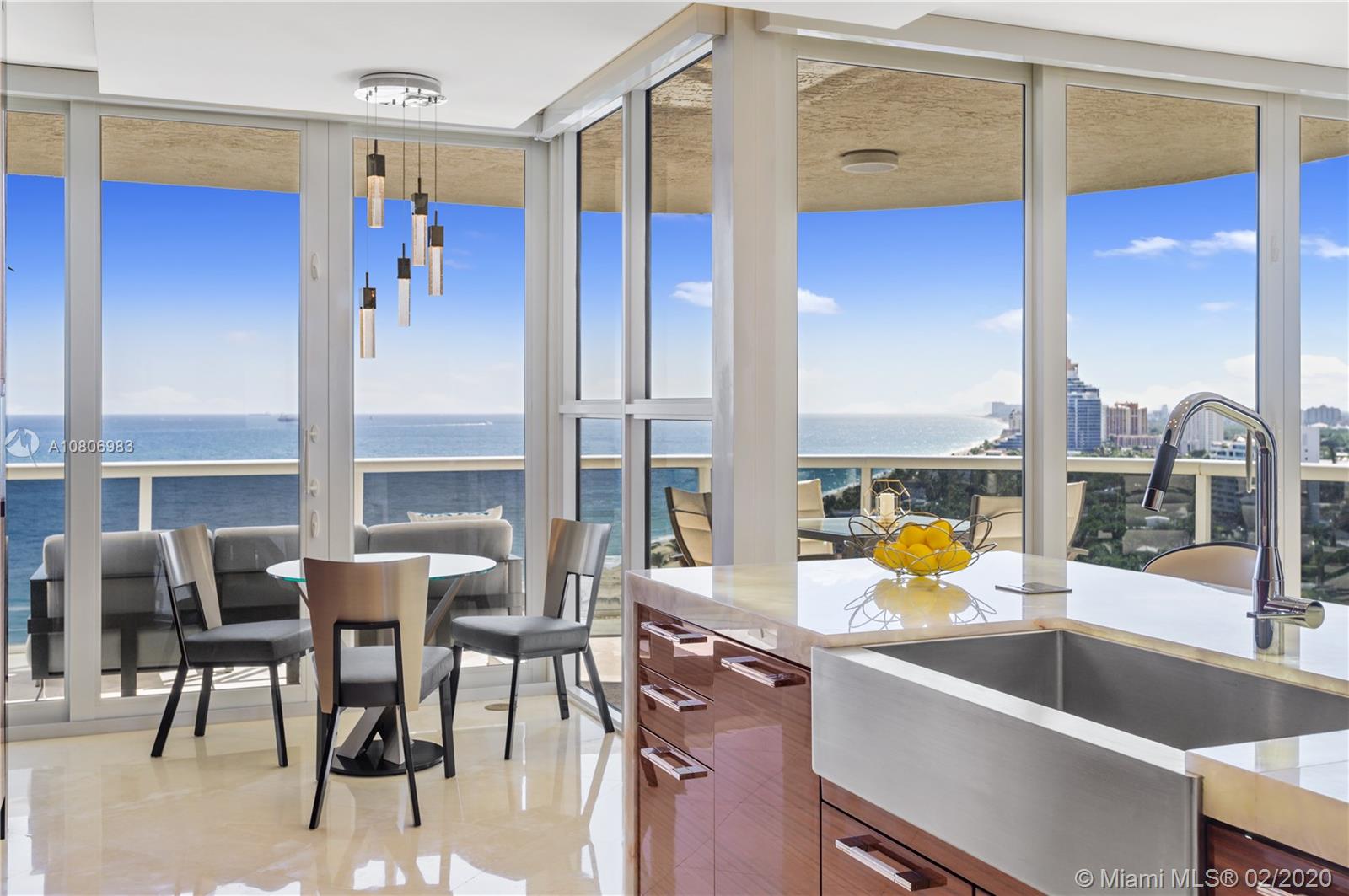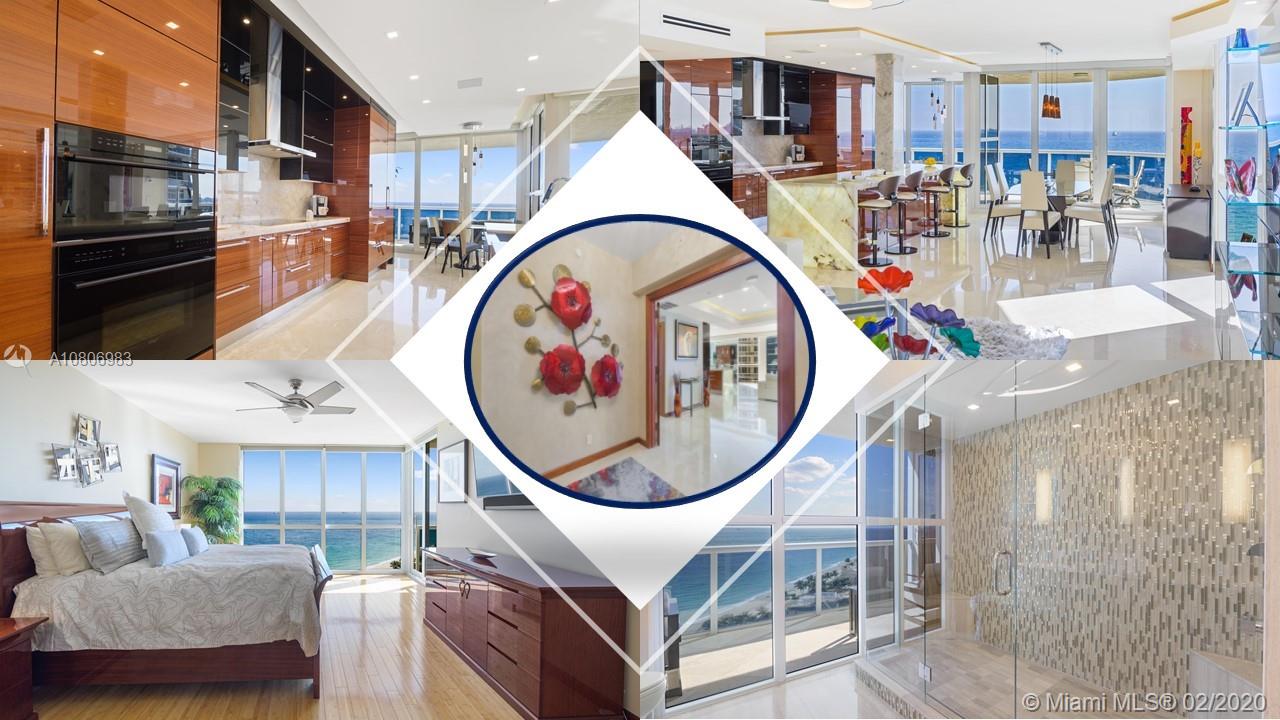 Step off private elevator into gleaming, chic & sophisticated 3BR/3BA 2600SF rarely available 08 flow-through residence. New expansive impact windows perfectly frame glorious ocean view to east & city west. Fully upgraded w/impeccable materials & vision, showcasing 24x24 travertine floors, backlit soffits, Italkraft cabinetry, floating ceiling & Wetbar w/ULine bev fridge & wine cooler. Chefs kitchen w/underlit 12' quartzite island, high-end appliances & designer touches thruout. Master suite has sweeping ocean views, custom closets, speaker system & luxurious bath w/Toto toilets, big shower, multiple heads, and Keuco vanity mirrors w/storage & lights. Upscale, one-of-a-kind masterpiece in a bldg that sits on 10 acres of beachfront land.Resort-style amenities: valet/tennis/gym/pool/cafe