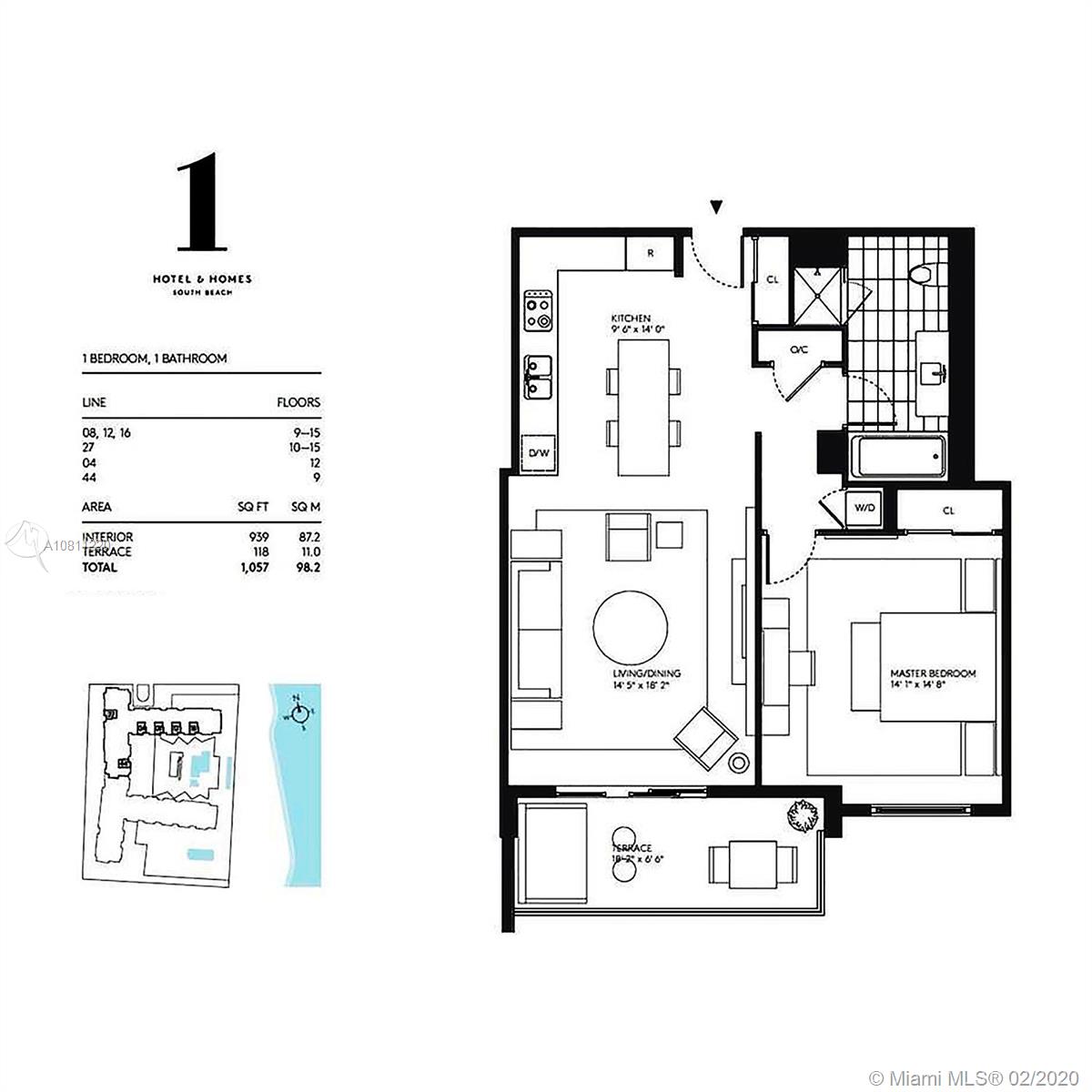 939 Sq Ft living area and 118 Sq Ft terrace (total area 1057 Sq Ft) per developer's floor plan (preview in pics). **South-Facing Hotel Furniture Package** 1 Hotel & Homes, brand new finishes! Stunning and oversized 1 bdrm residence with Ocean View. Luxurious full service amenities and several restaurants with bar options. Beach services, resort-style, family-friendly pool or rooftop pool exclusive for adults. Fully-equipped gym with exercise classes included. In the heart of all South Beach has to offer. 1 Valet Parking Space included.
