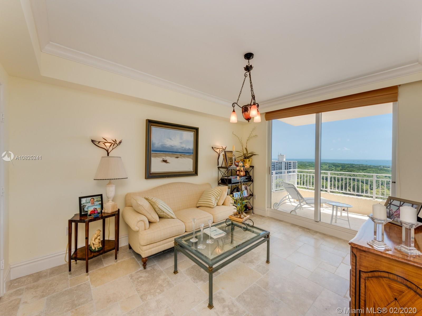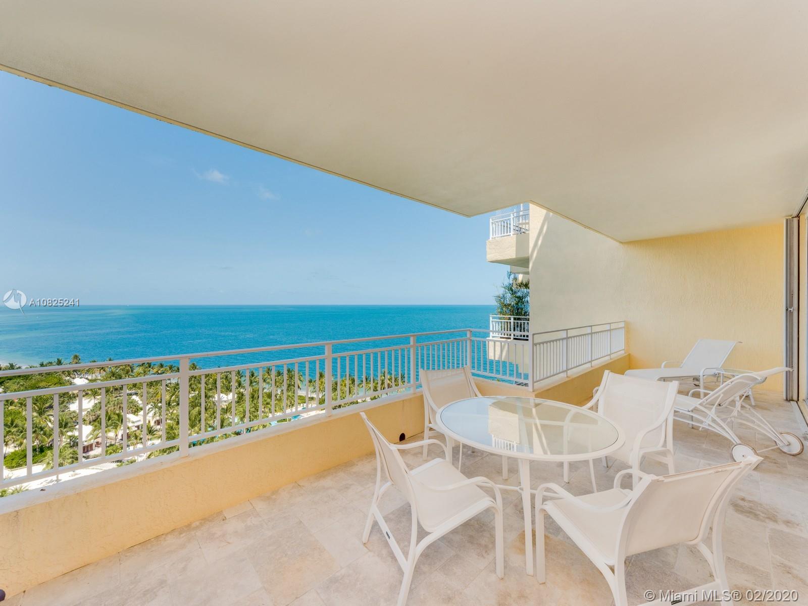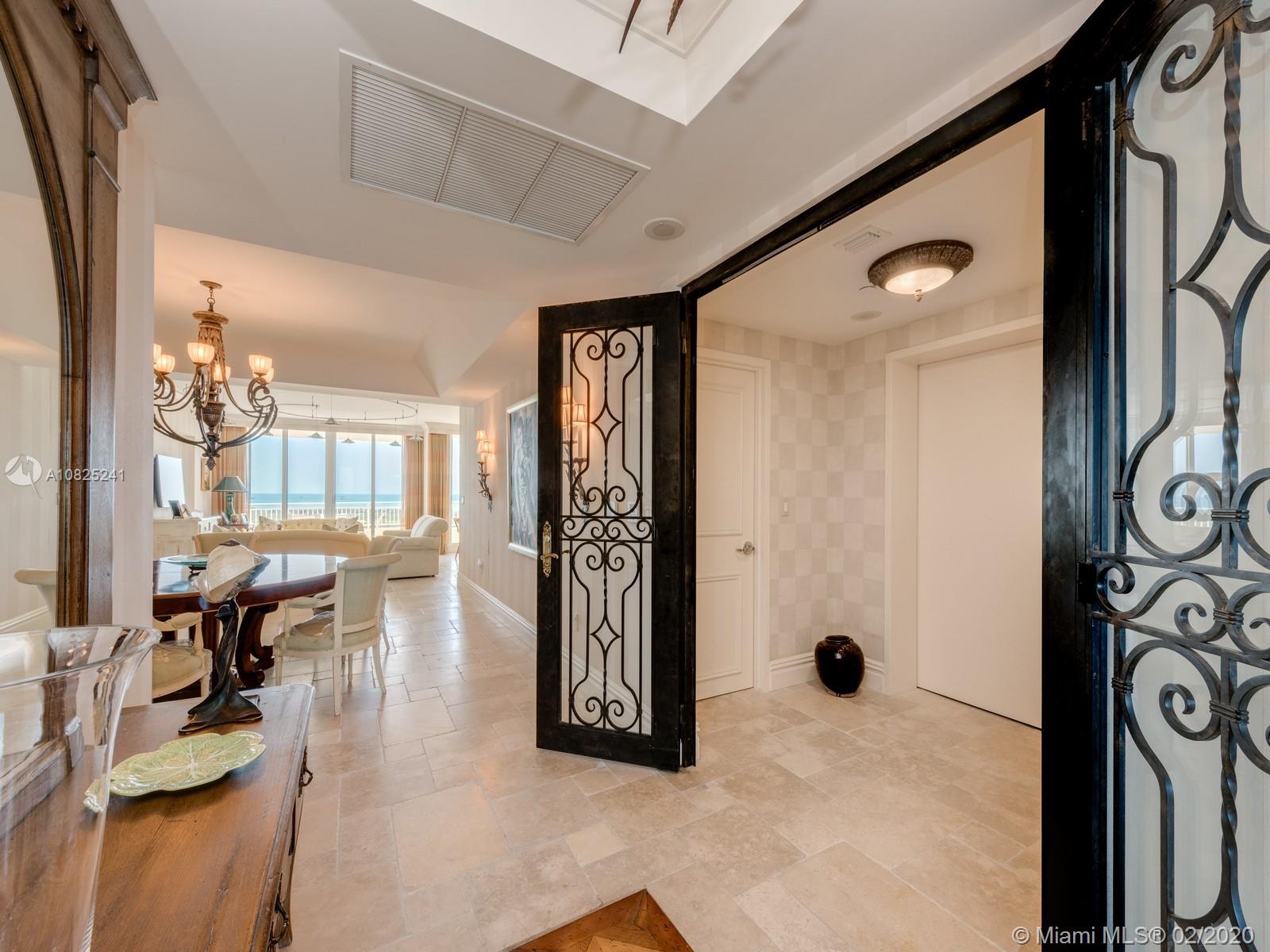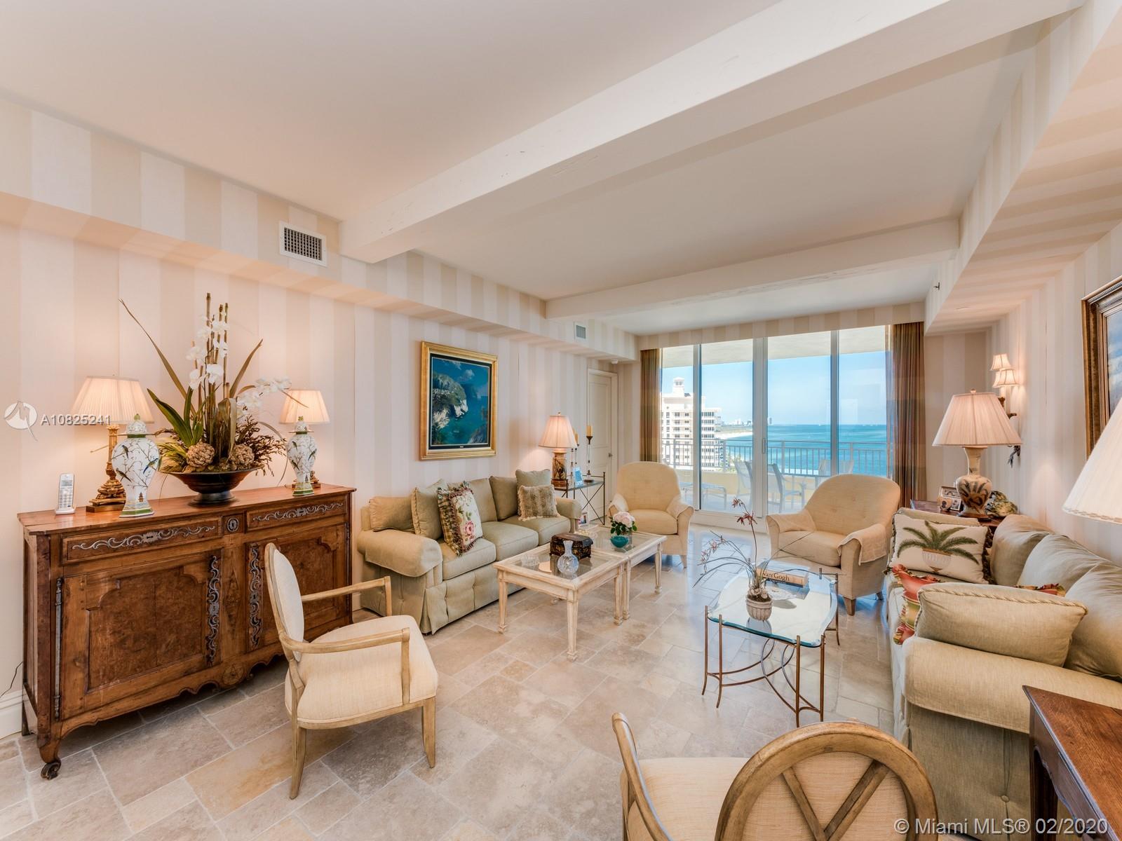 Sweeping floor-thru views of Atlantic Ocean and Miami Skyline from Living and Master Bd. areas, and Biscayne Bay, Cape Fl. and lighthouse, from this most sought after "D model" apartment. * * * Step out of your private elevator right into this oversize 3 bd. (en suite) plus separate staff quarters, 4 and a half baths. Formal living and dining rooms. Kitchen/family room combo may be converted into eat-in kitchen and bedroom #4. Marble floors in all social areas. Easy to show by appointment.