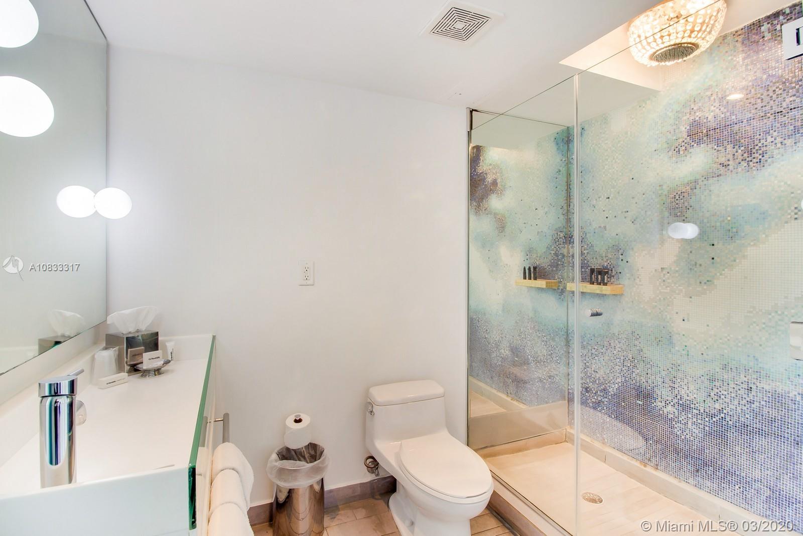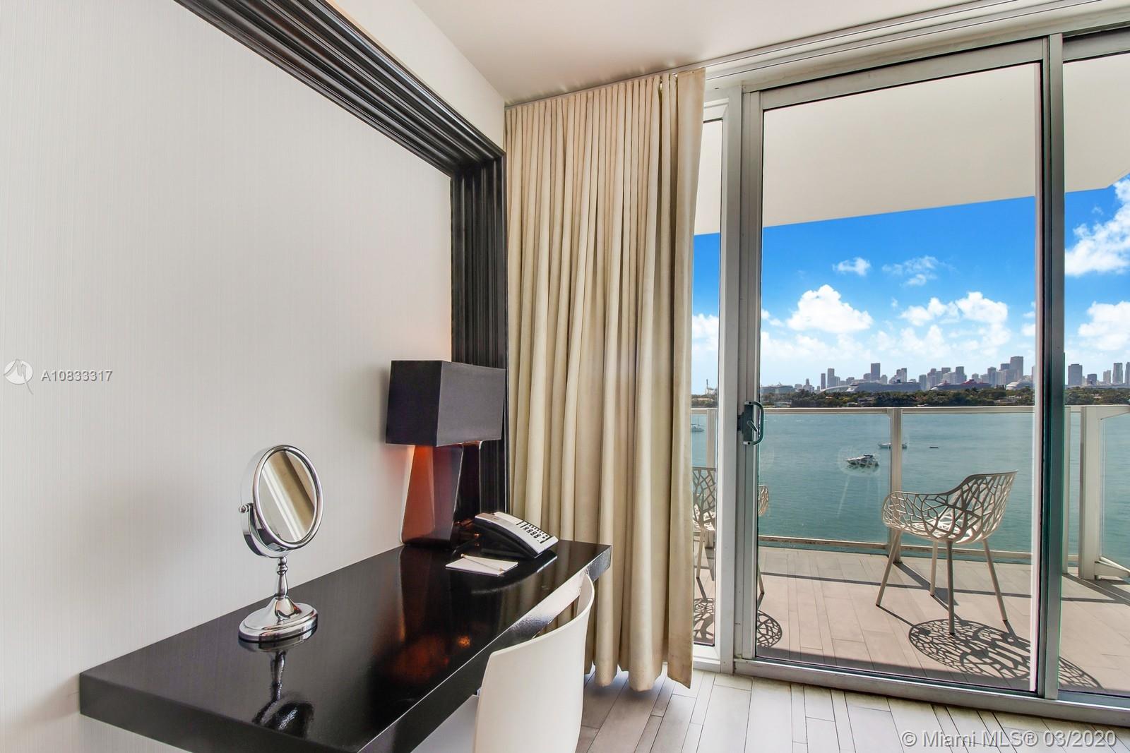 This stunning Mondrian suite is the best priced unit with a BALCONY and DIRECT BAY VIEWS! Designed by renowned designer, Marcel Wanders, this beautiful suite features custom designed furniture and artwork, and a full kitchenette. The Mondrian Hotel just completed major renovations including a new lobby, restaurant, bar and spa. Seller paid assessment. Amenities include concierge, 24 hour fitness center, valet, security, and a bay front pool covered with lush landscaping. 1 Valet parking space included. Located just steps to fine dining, Lincoln Rd Mall, Flamingo Park, and more. Enjoy this suite while you're in town and earn income when you're not! This suite is NOT in the hotel program.