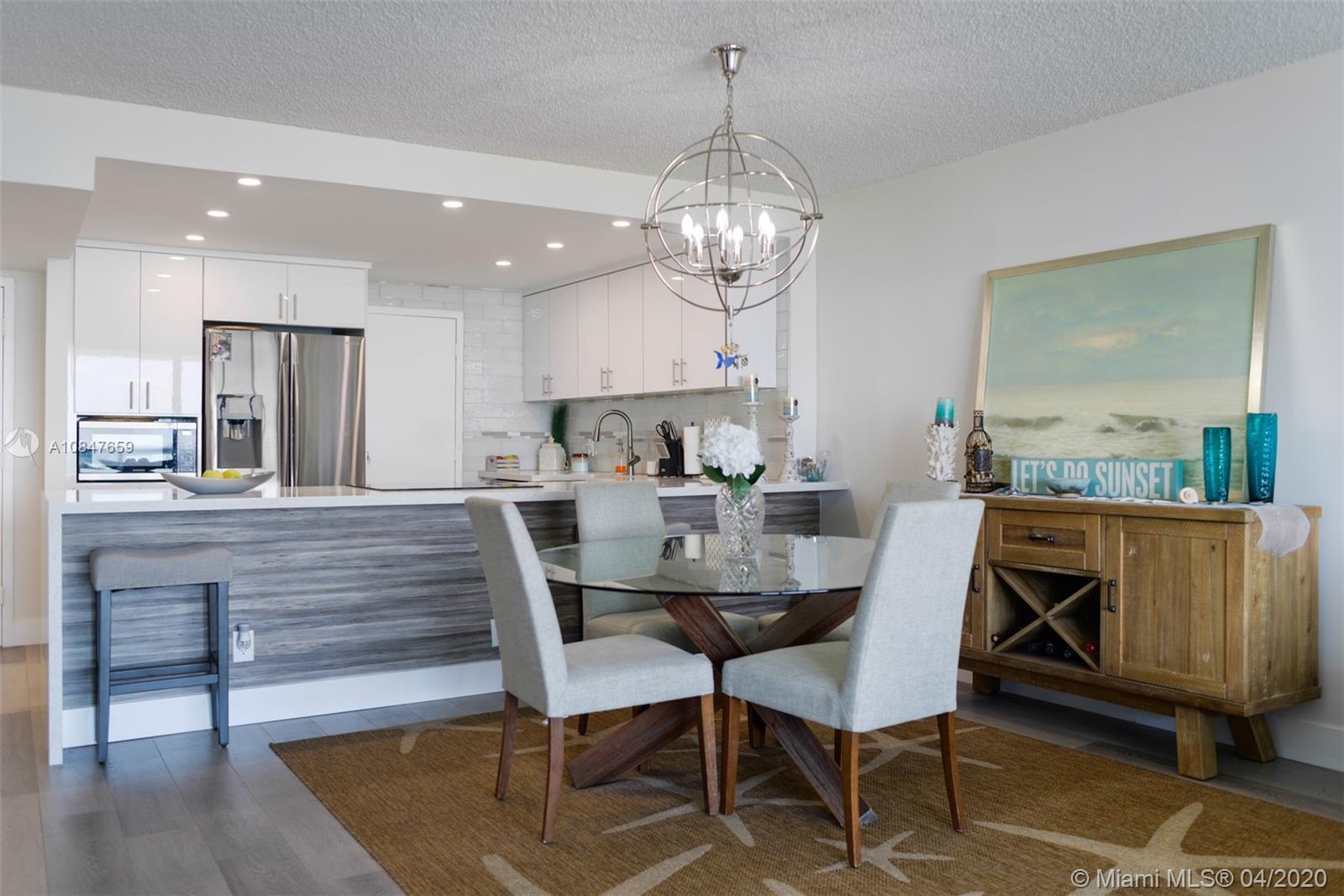 FHA APPROVED! CAN RENT IMMEDIATELY TOO! Furnished/unfurnished- Fully upgraded unit TOP TO BOTTOM beautiful unit. Fantastic open kitchen with HUGE white sparkly quartz island. All new glossy white cabinetry. Floors are white washed wood look ceramic tile for that beachy but elegant feel. Enjoy the intracoastal from every room. Wrap balcony offers ocean views and city views for those fantastic city lights at night. Large and spacious floorplan feels like living in a house. Loads of closets and large bedrooms that will both accommodate a king size bed. Everything brand new and ready for YOU! No texture on walls. Garage parking space right by door to bldg. Walk across the street to the beach or go next door to the tiki bar/resort, or pool. ASSESSMENT PAID - EZ 2 SHOW