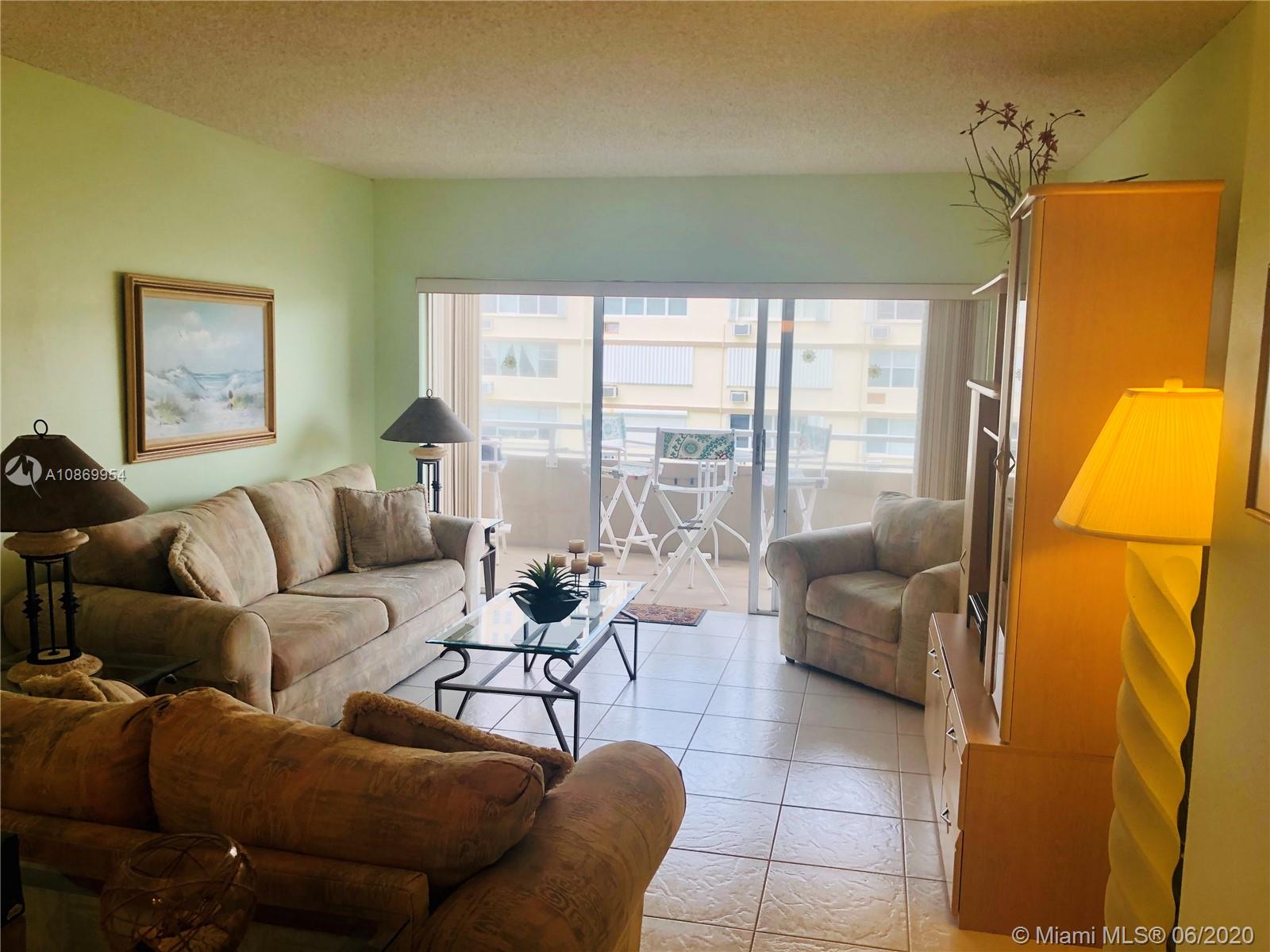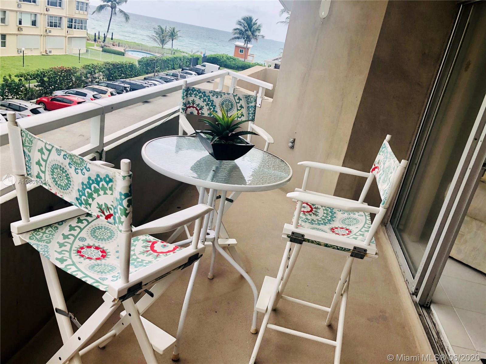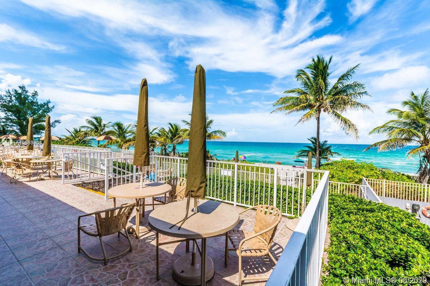 Oceanfront Condo nestle between Fort Laud. & Miami. Impeccable large furnished unit with eat in kitchen, walk in closet, build in bar, lots of closet space, large balcony, serene ocean view. Unique living experience, on 17 Acres of prime real estate between the Ocean and Intercostal, 2 restaurants, snack bar, 2 pools, tennis courts, putting greens, driving cage, basketball courts, 2 toddler pools, hair salon, marina and more. Ok to lease. Maintenance includes, electric, cable, internet, ac maintenance and more. Everything in place, furniture, utensils, bedding..just move in!. Price to sell!